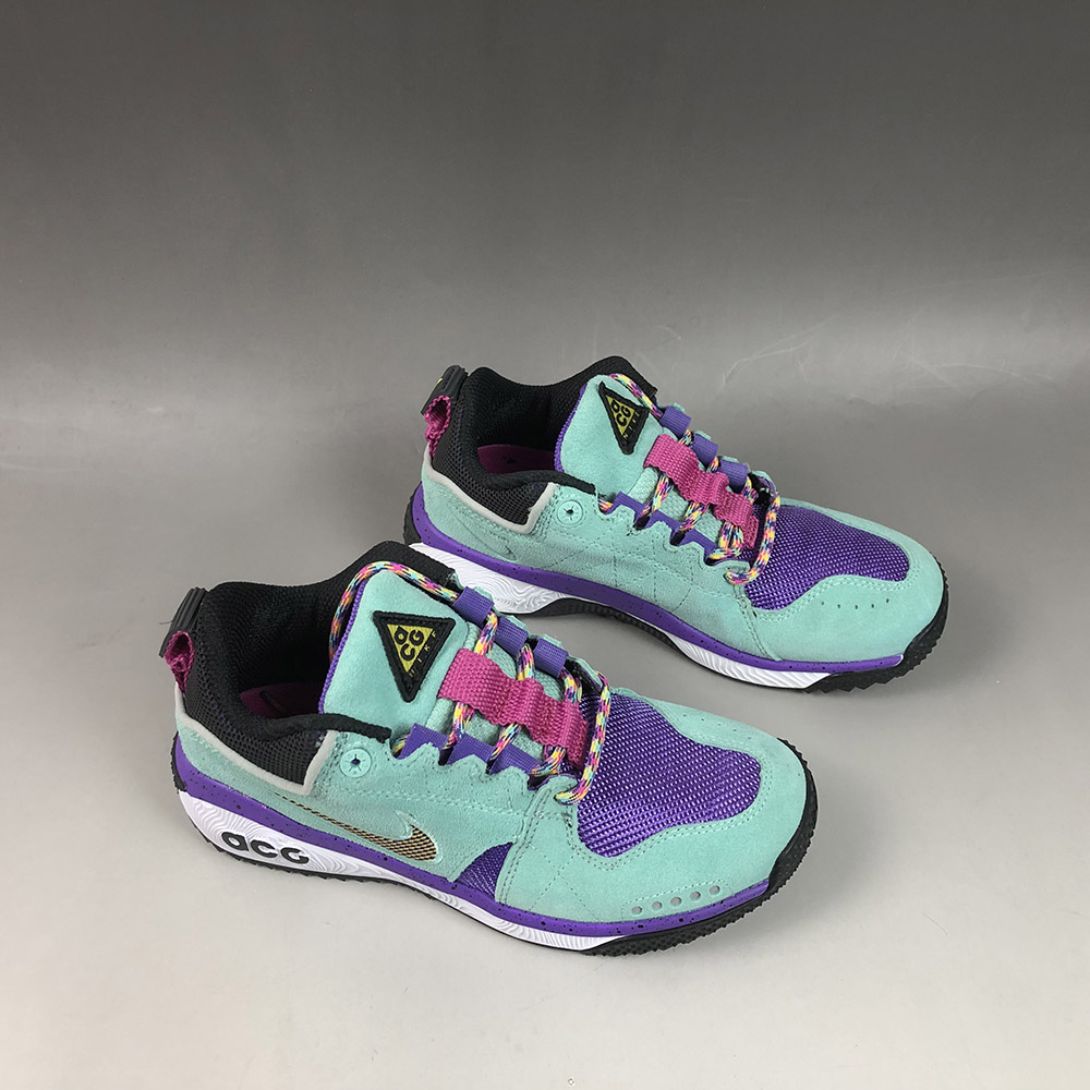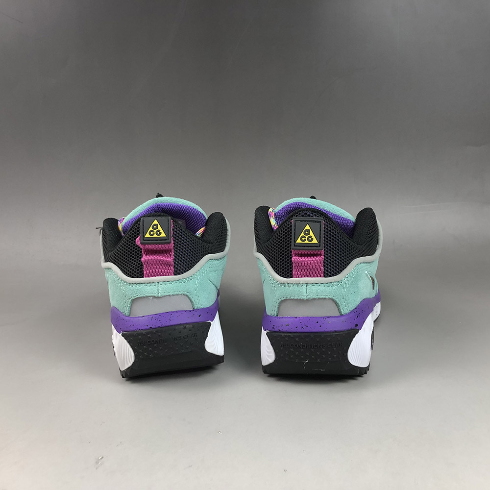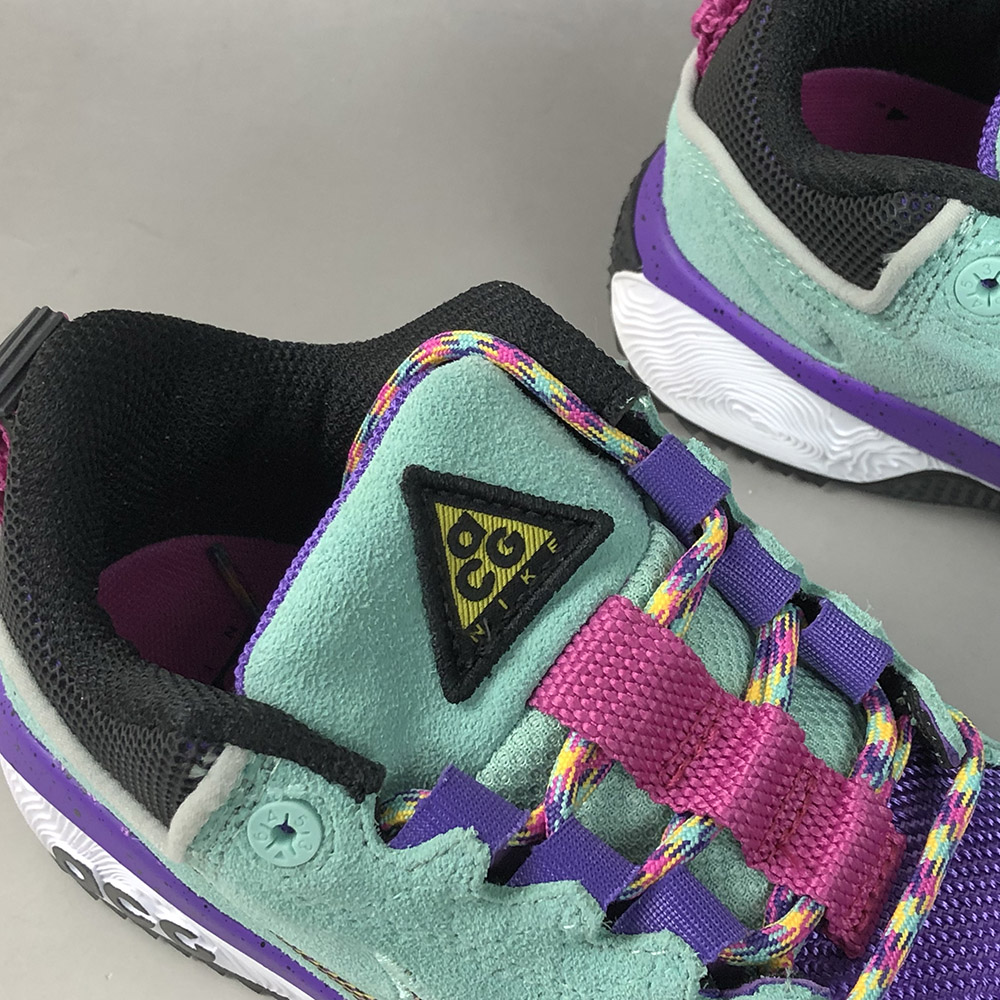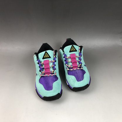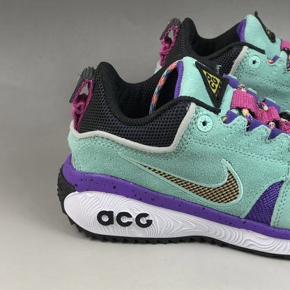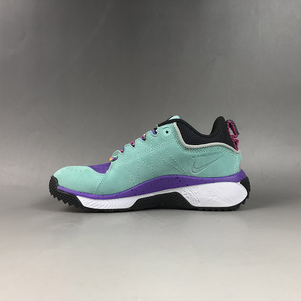 Dressed in bright and colorful tones, having a mix of Turquoise and Purple colors. The trail model comes constructed in a mix of suede and caves. Other details includes speckled detailing, multicolored laces atop a rugged and chunky tread on its outsole.