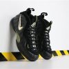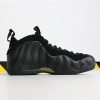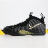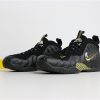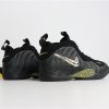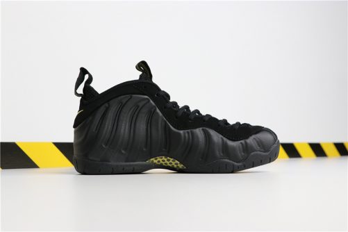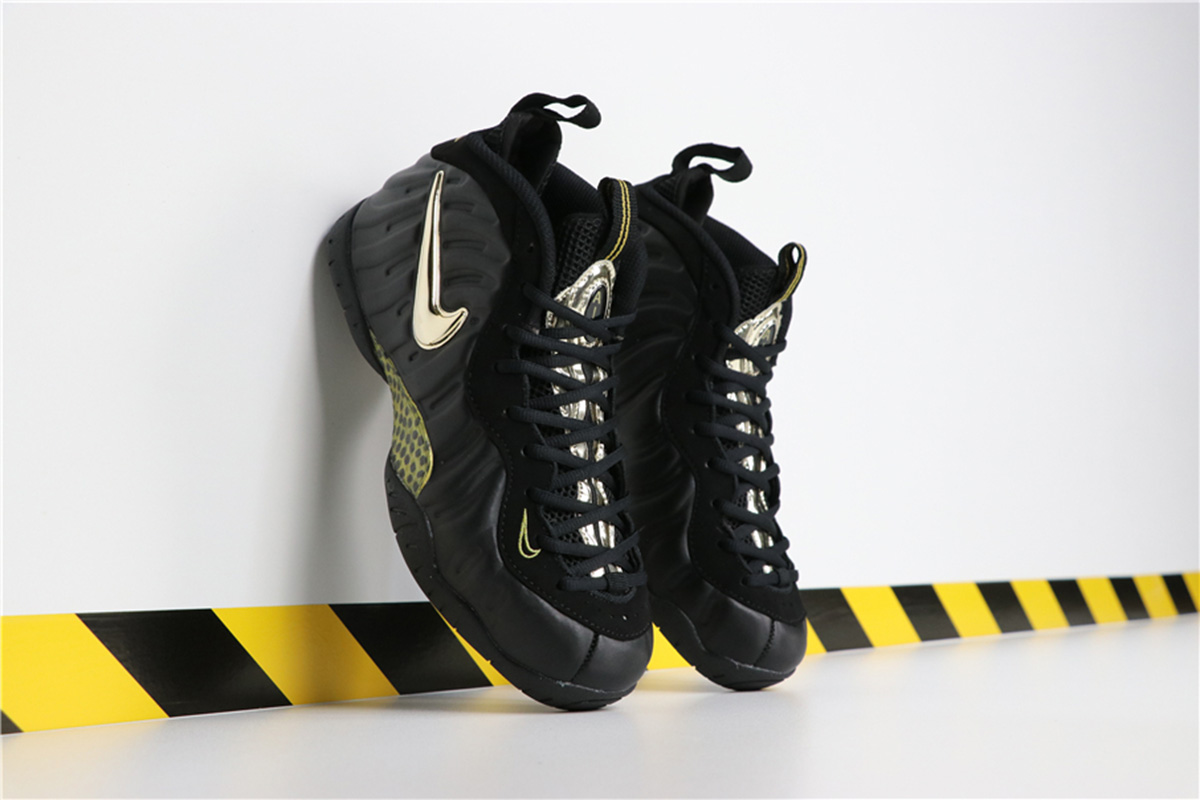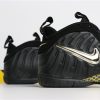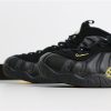 This Nike Air Foamposite Pro features a Black Foam shell highlighted with Metallic Gold on the Swoosh logos, tongue, and heel tab. A Black and Gold carbon fiber atop a Black rubber outsole completes the design.