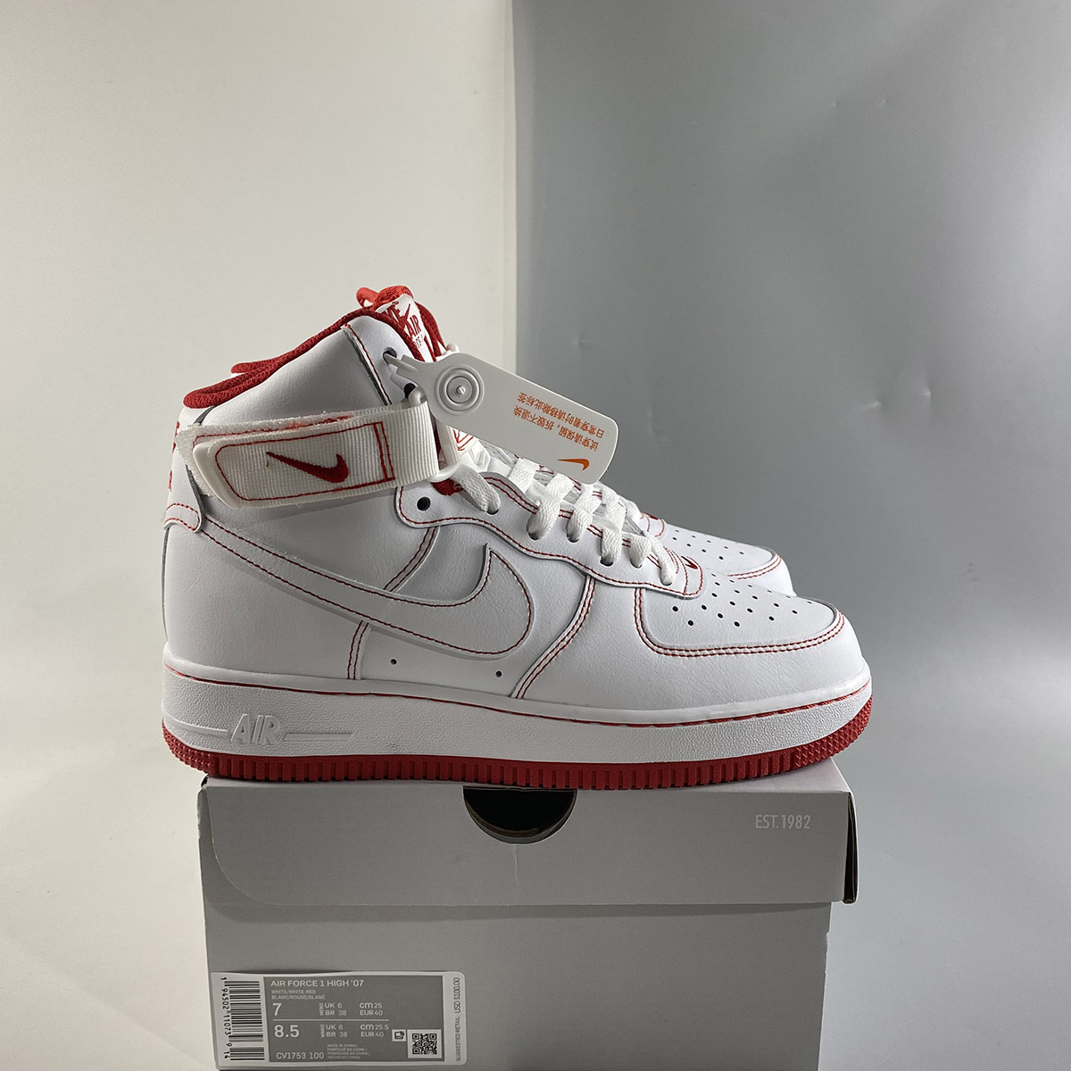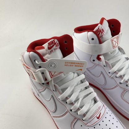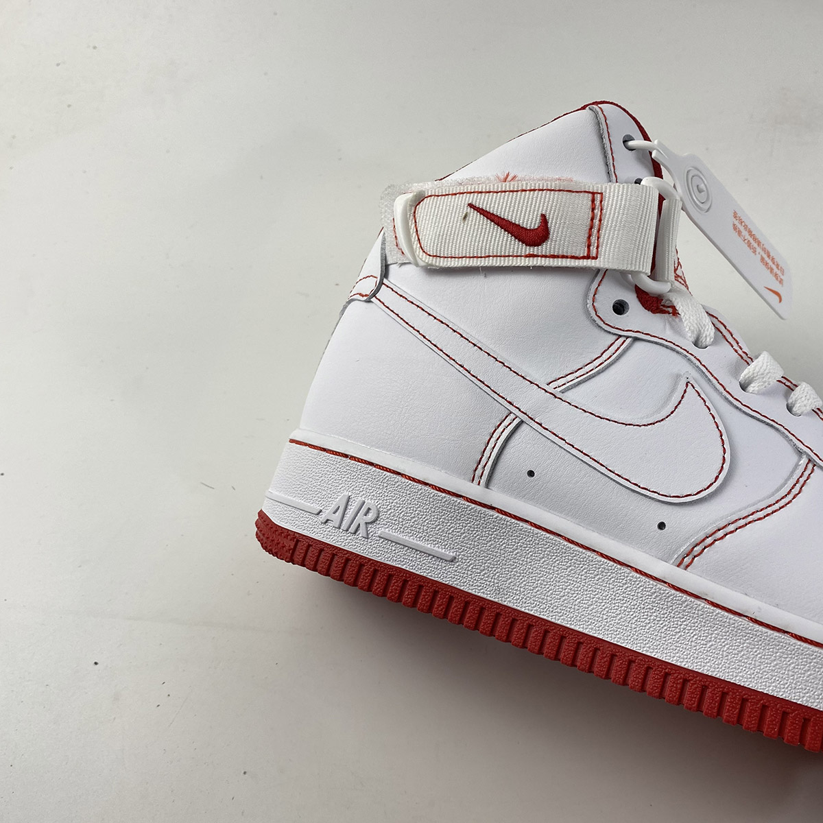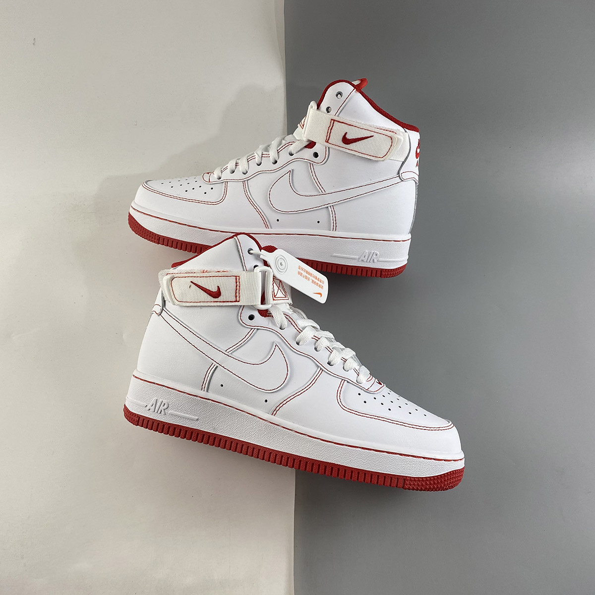 Dressed in a simple White and Red color blocking. This Nike Air Force 1 High features a White leather upper paired with Red contrasting stitching throughout. Red continues on the tongue tags, liner, heels, insoles, and rubber outsole atop a clean White AF1 midsole.