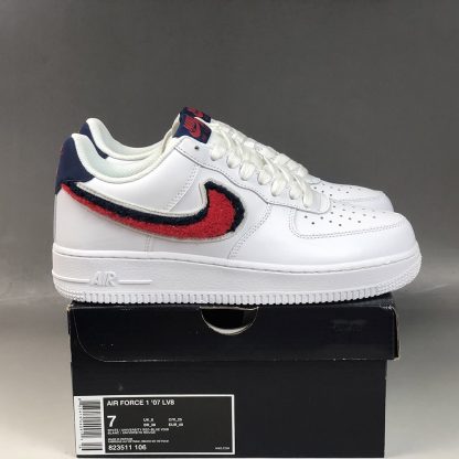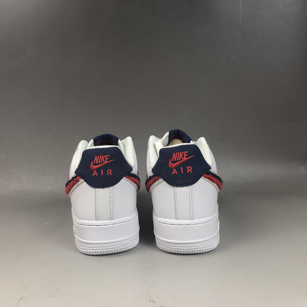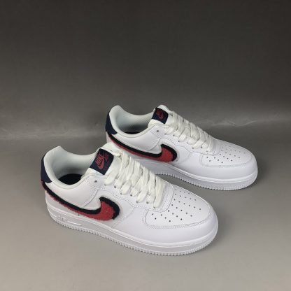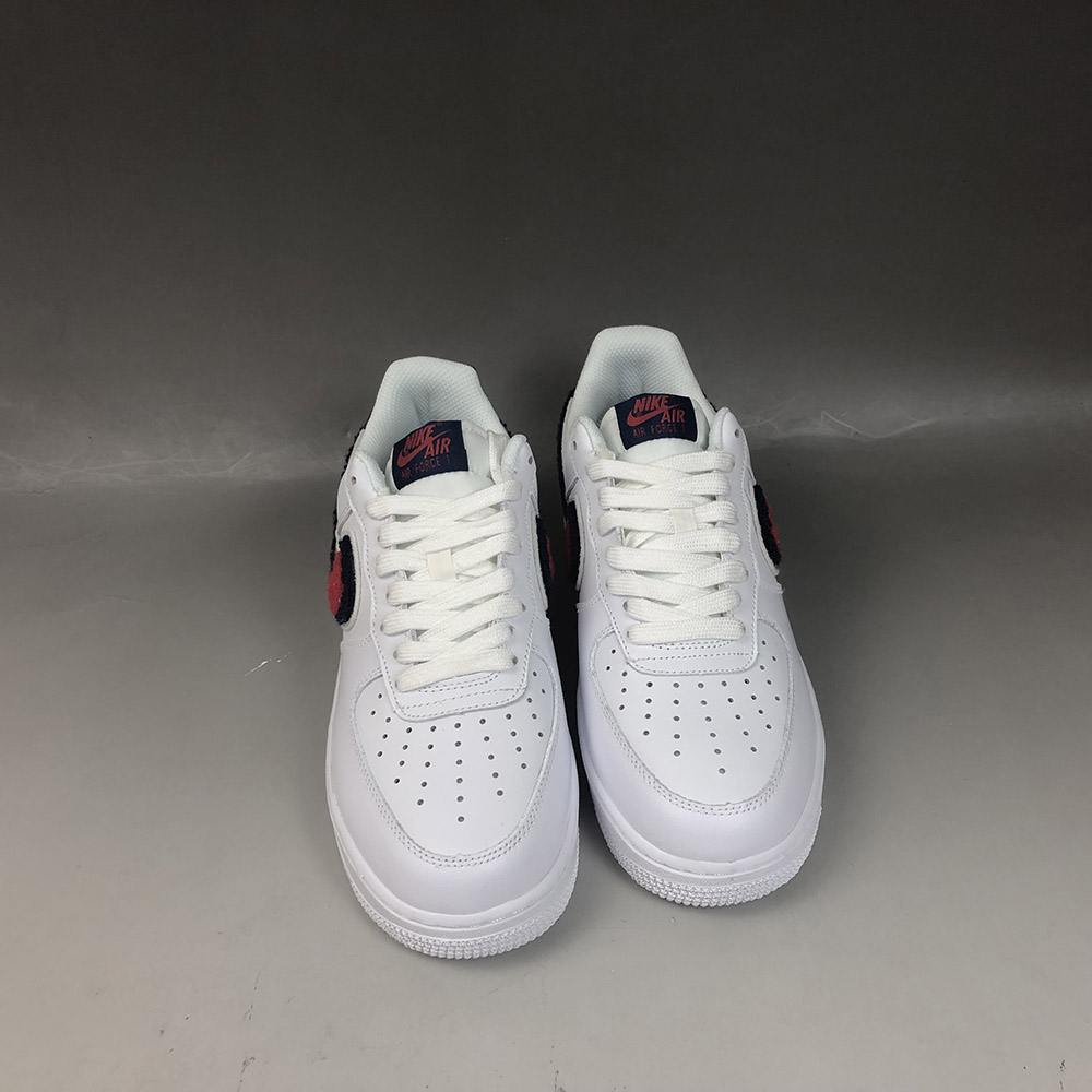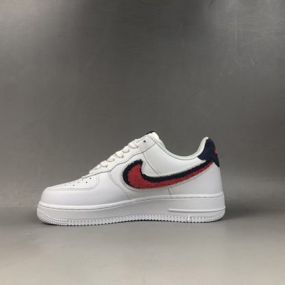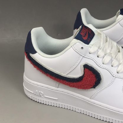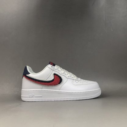 with everything from the Blazer Low to the Air Force 1 High donning the unique branding. The Swoosh isn’t done with the design yet though, as now the Air Force 1 Low is the latest classic silhouette to receive the retro-futuristic treatment. Arriving in a patriotic red, white, and blue color scheme, the shoe features a clean and classic white leather upper with detail arriving via a blue/red tongue tag and heel tab. However, the shoe’s most unique feature arrives via the aforementioned large chenille swoosh: featuring a layered red/blue/white chenille material and bold black stitching that provides an interesting optical illusion