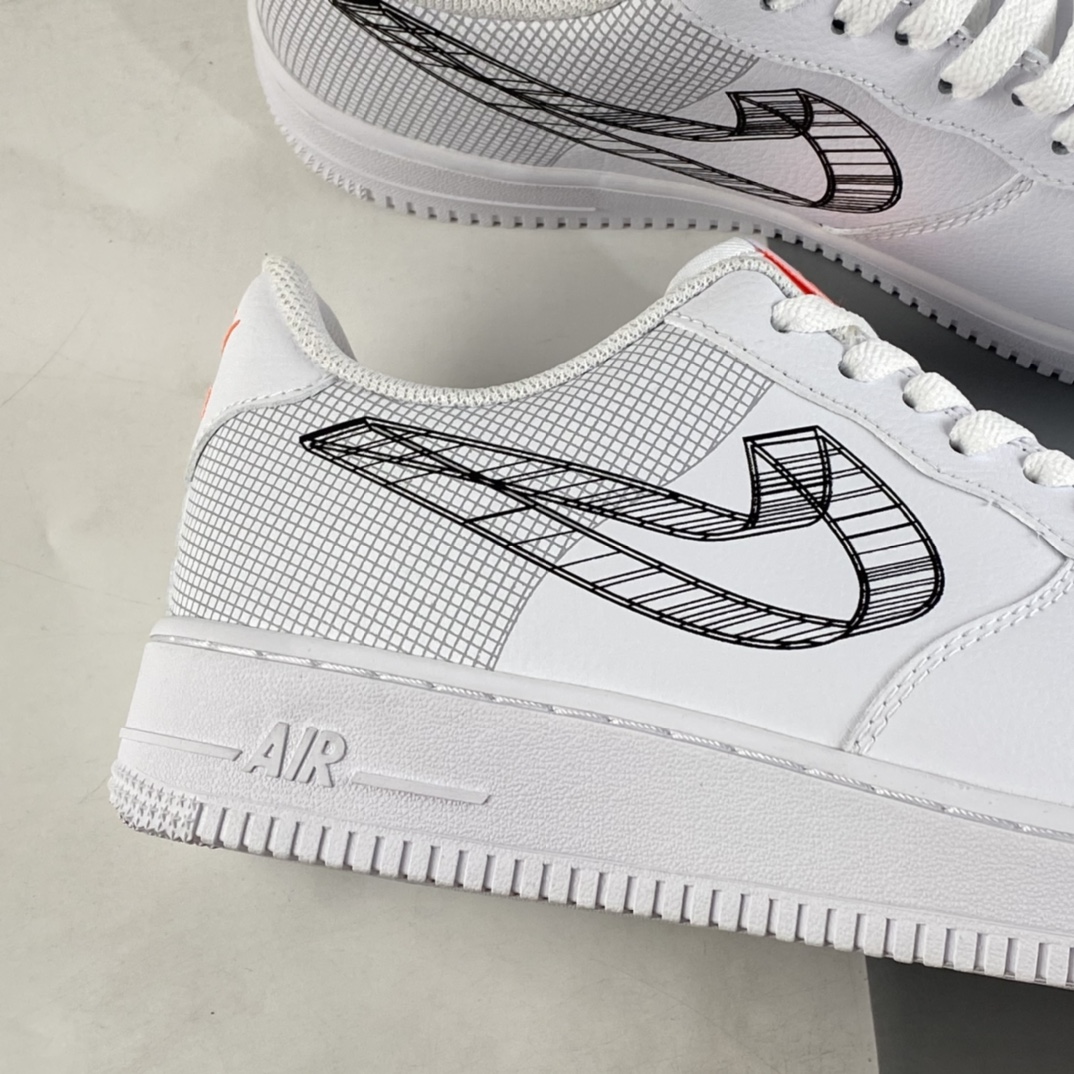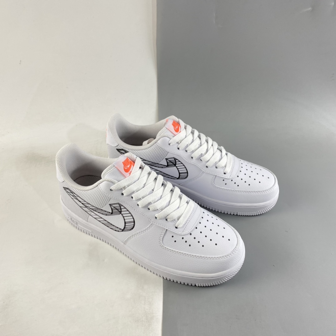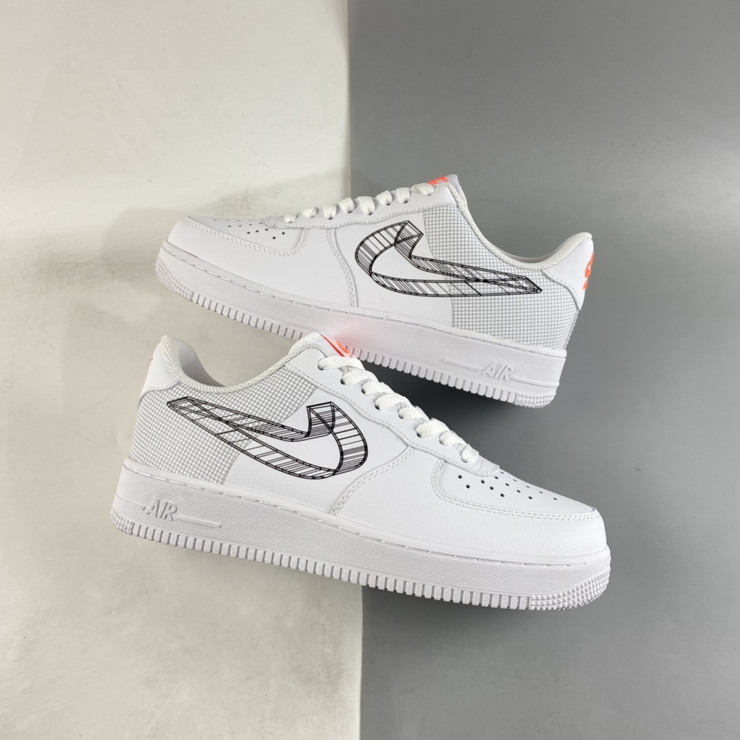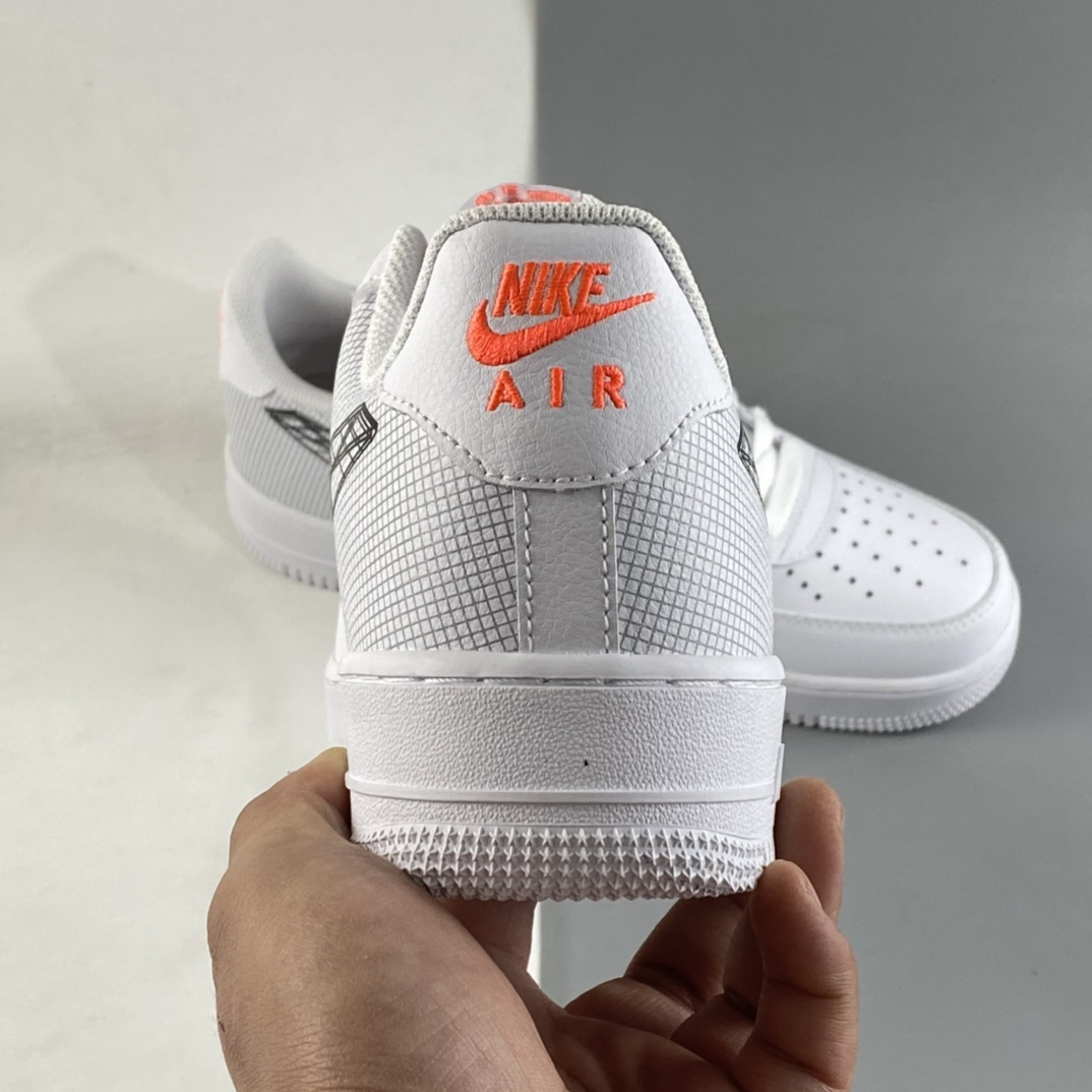 This offering of the Nike Air Force 1 Low features a White leather base with a grid pattern overlay in the rear. 3D Swooshes on the sides highlighted with Bright Orange branding atop a clean White AF1 rubber sole completes the design.