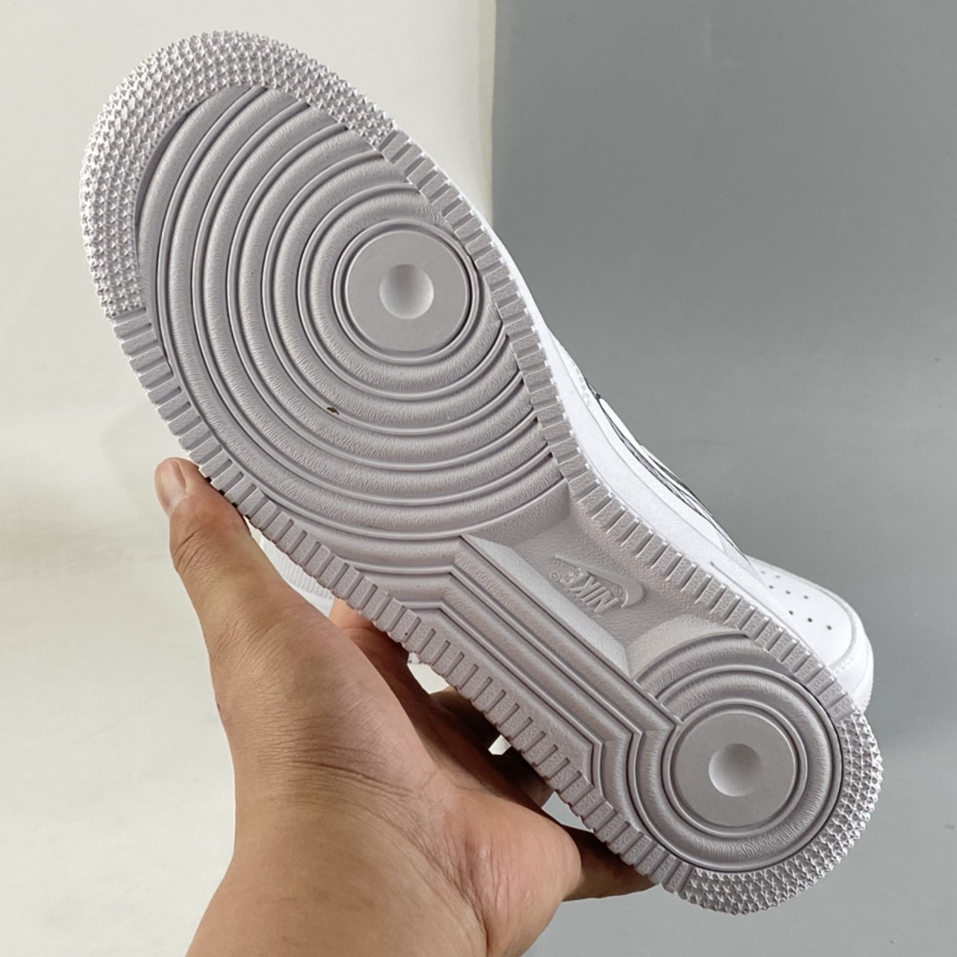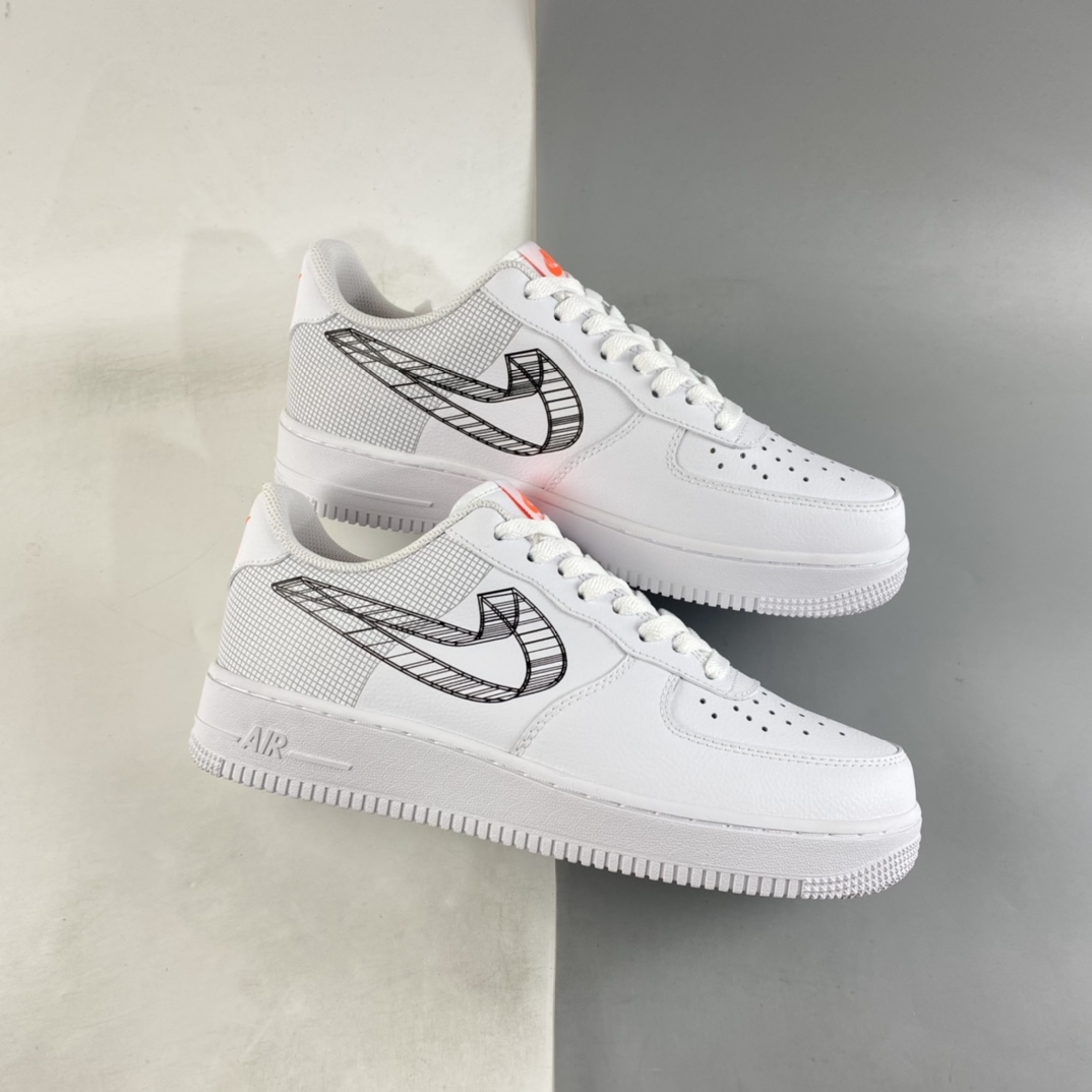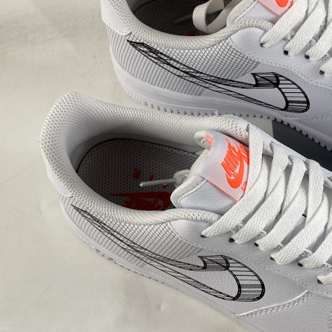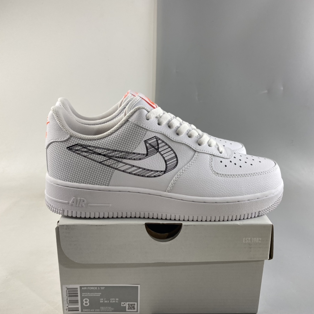 This offering of the Nike Air Force 1 Low features a White leather base with a grid pattern overlay in the rear. 3D Swooshes on the sides highlighted with Bright Orange branding atop a clean White AF1 rubber sole completes the design.