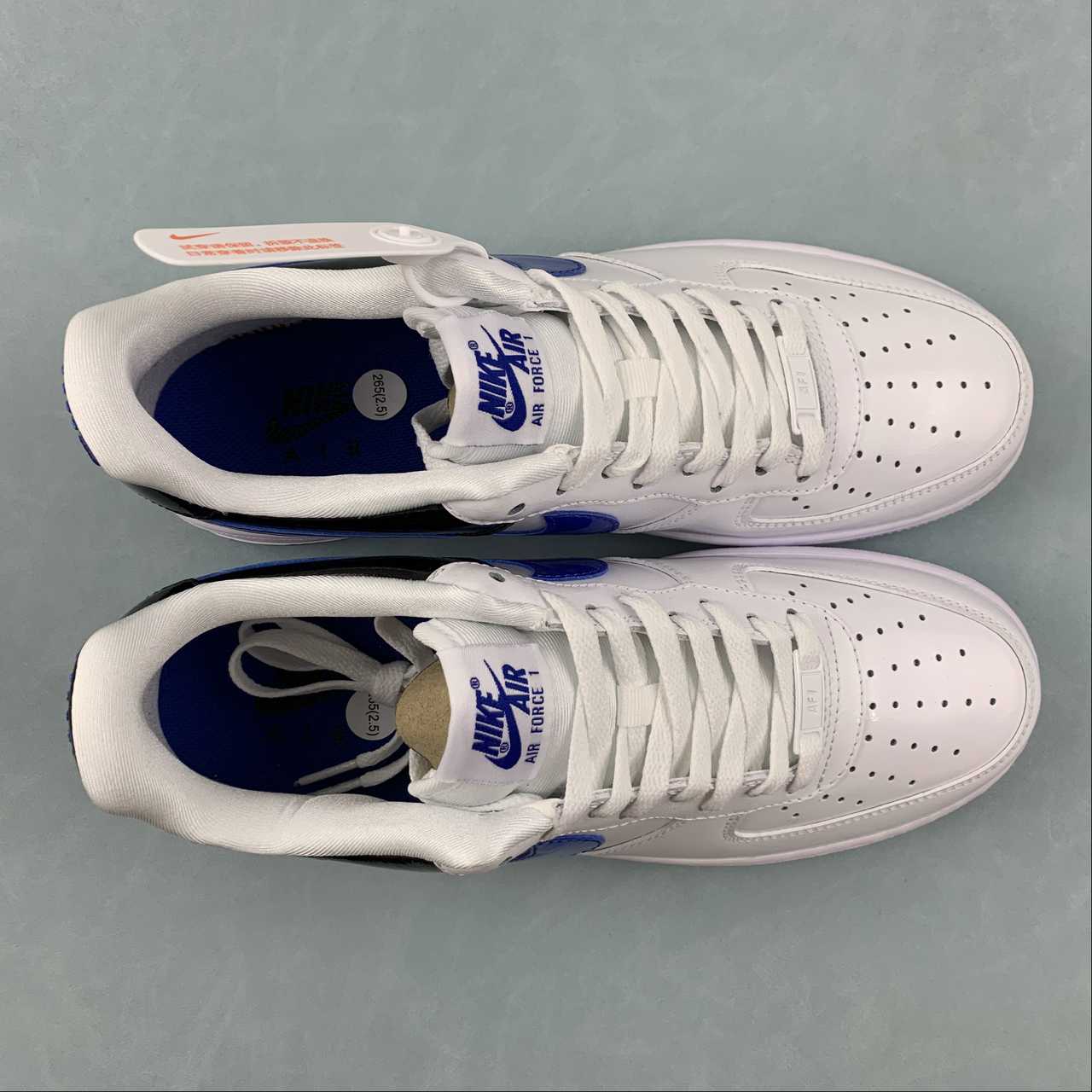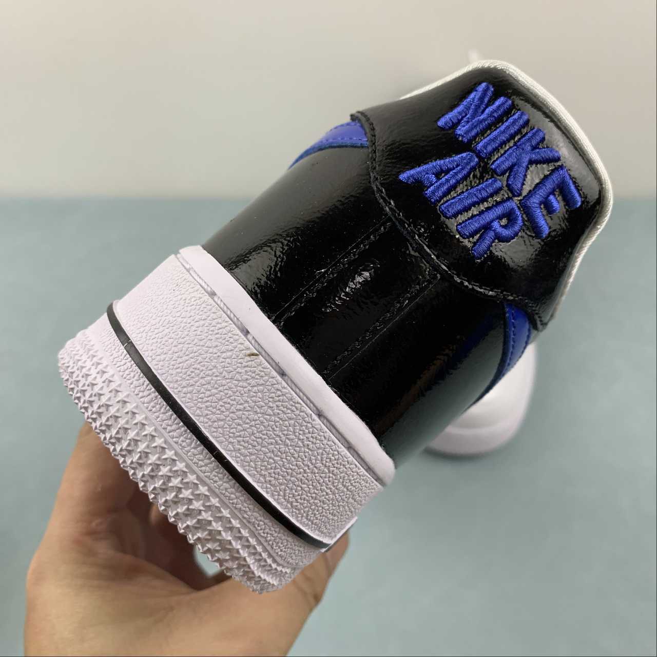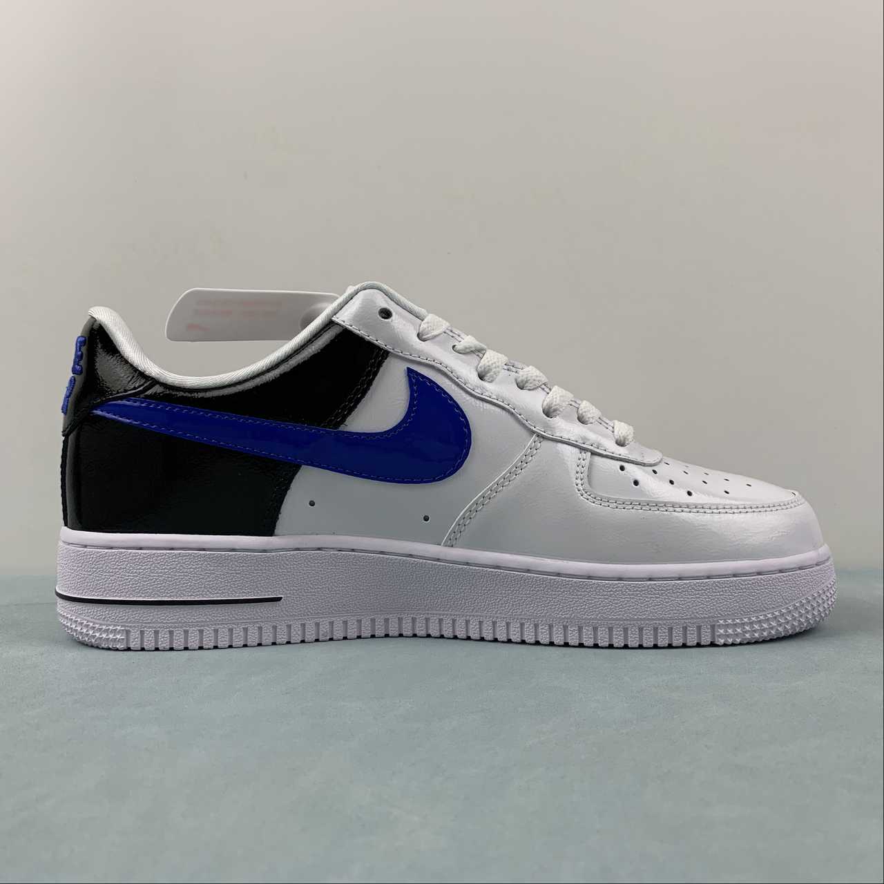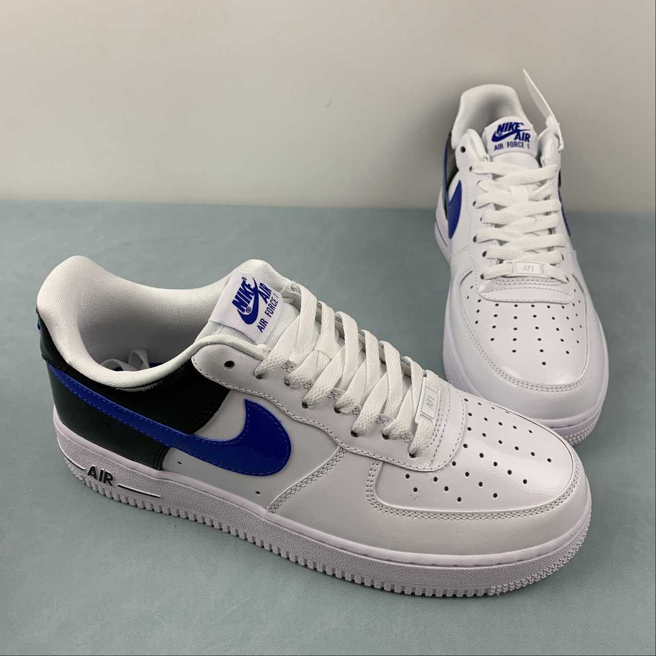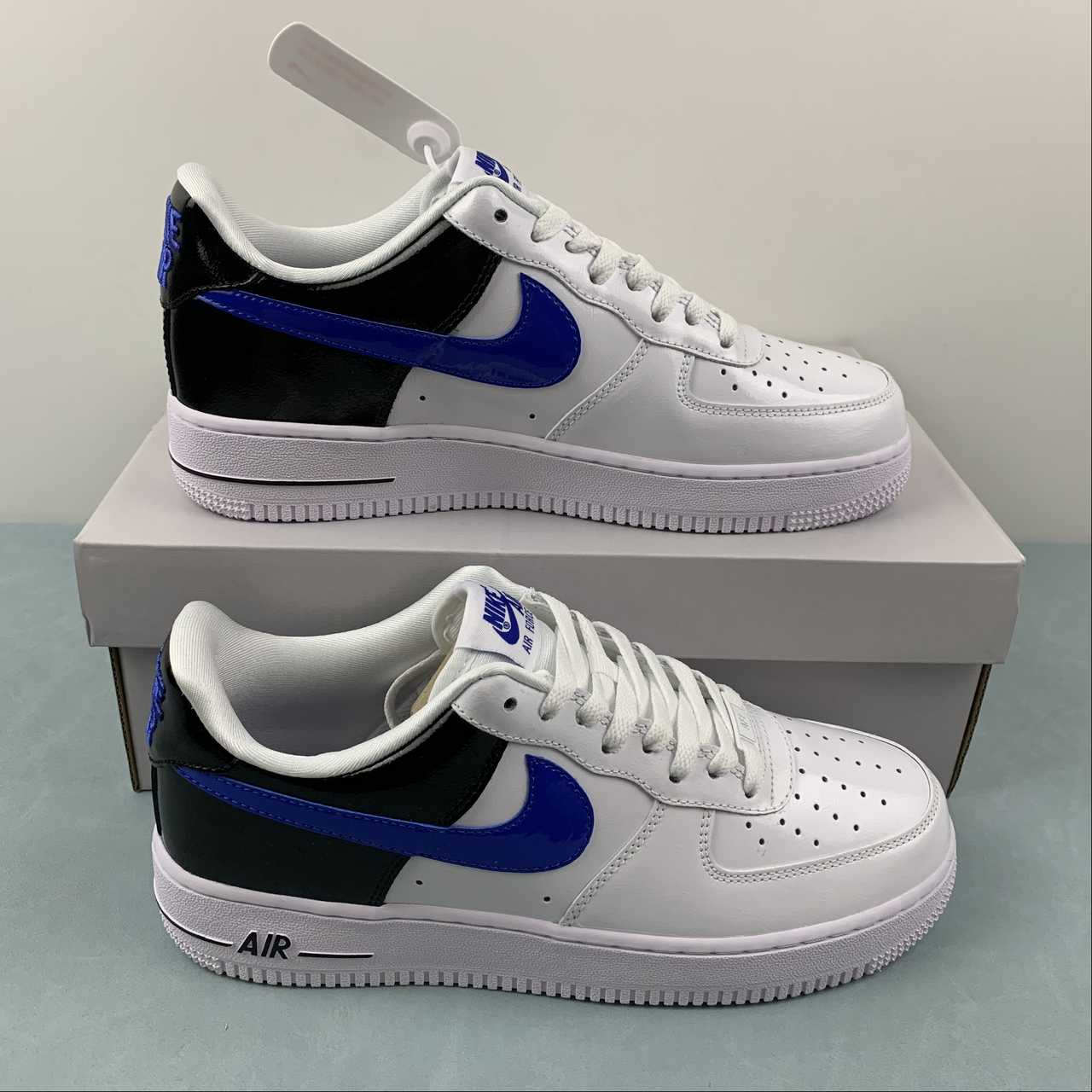 Dissimilar to the remainder of the pair’s upper – which encourages a near all-white ensemble through crisp white smooth leathers and color-matched laces – the jet-black treatment of the heel’s patent leather construct provides a stark contrast to the surrounding colorless sock liner and tongue. Matching the glossy composition across its “Royal Blue” midfoot Swooshes, the latter shade further denotes its presence through the heel tab’s 80s-inspired embroidered “NIKE AIR” text and adjacently placed tongue tab. Underfoot, the trio of tones concludes with a clad-white sole unit accented by pitch-dark AIR branding.