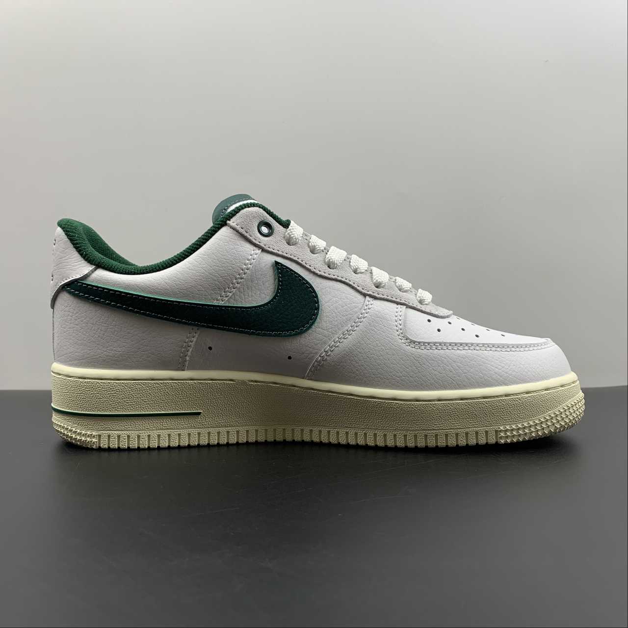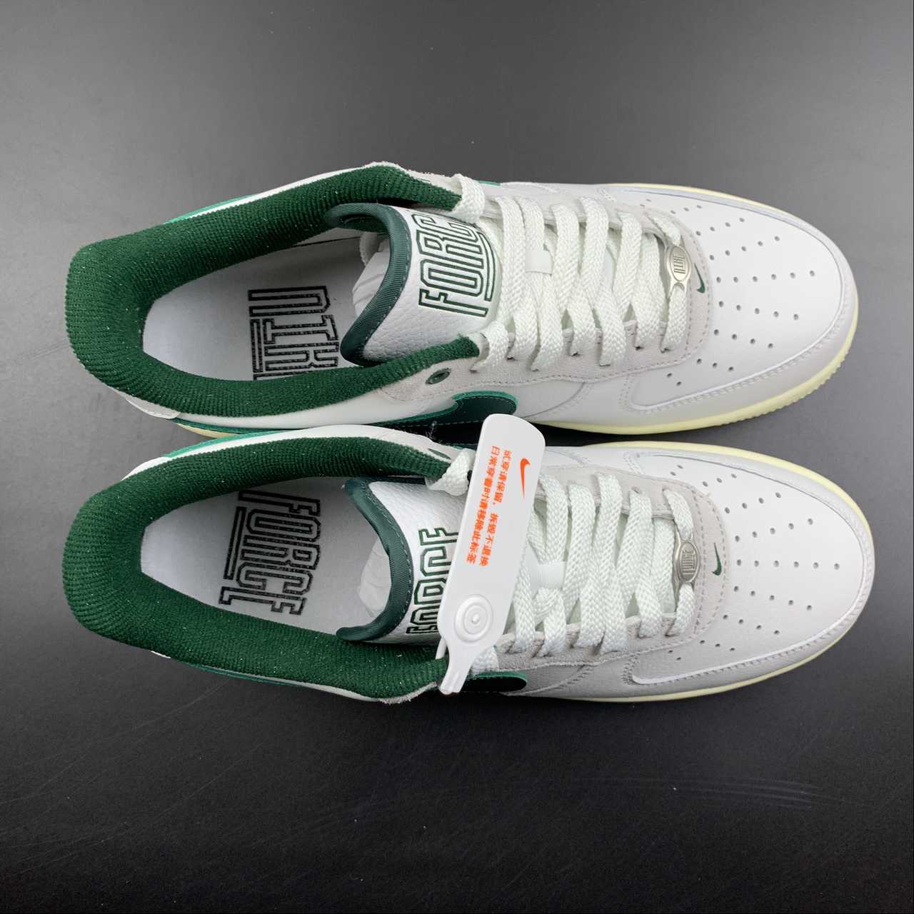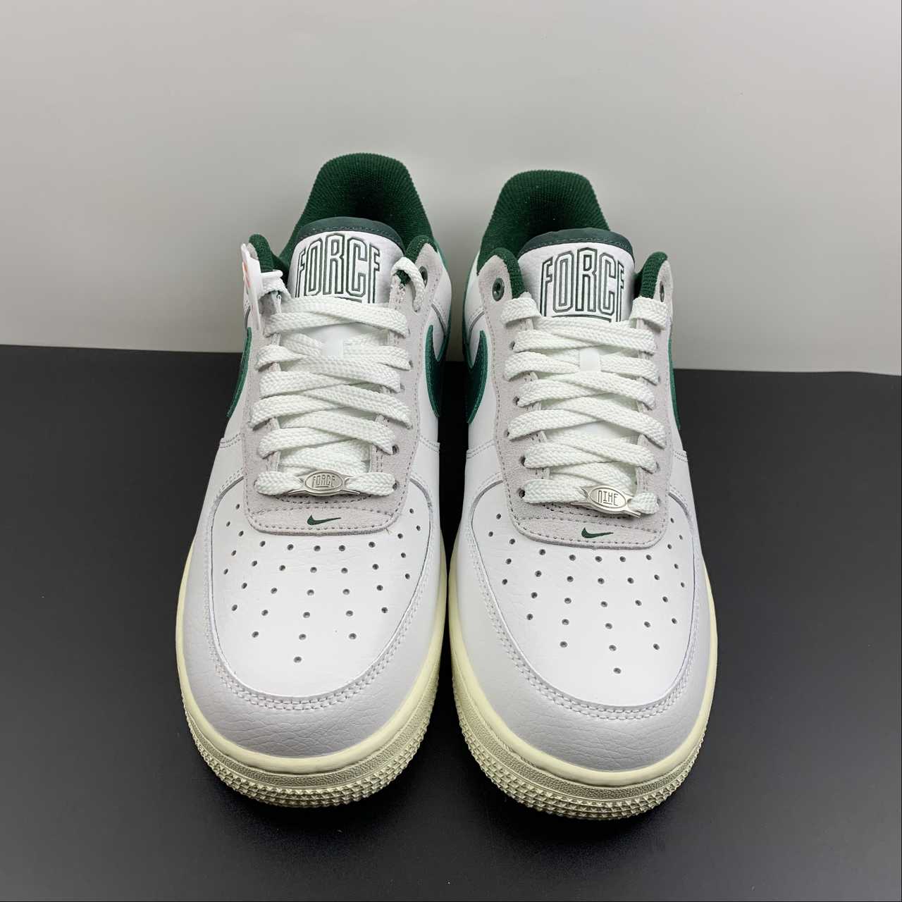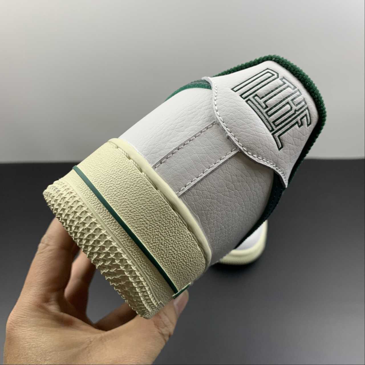This low-top AF1 has a heavily tumbled Summit White leather upper. Sail-coloured suede eye stay panels provide light contrast. The signature profile Swooshes that glide across both the medial and lateral mid-panels are in dark Gorge Green. The terry sock liner and the tongue lining all follow suit. Gorge Green “Force” outline branding stands out on the Summit White tumbled leather tongues. A vintage-looking Sail-coloured sole unit wraps up the look of these kicks.