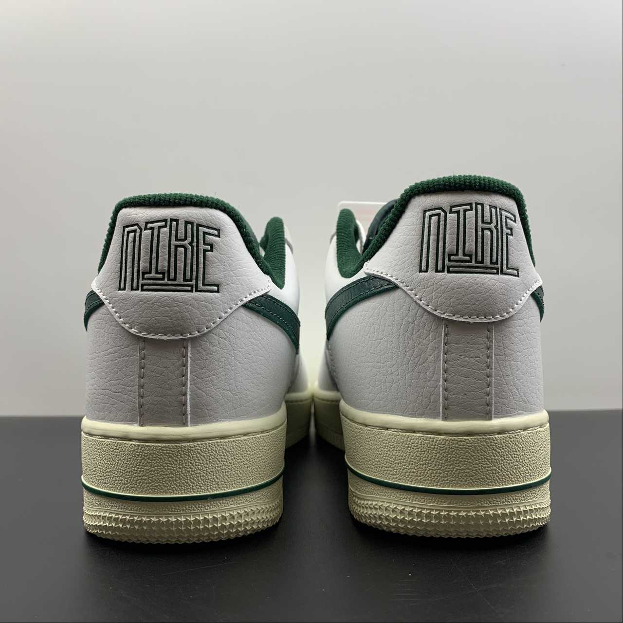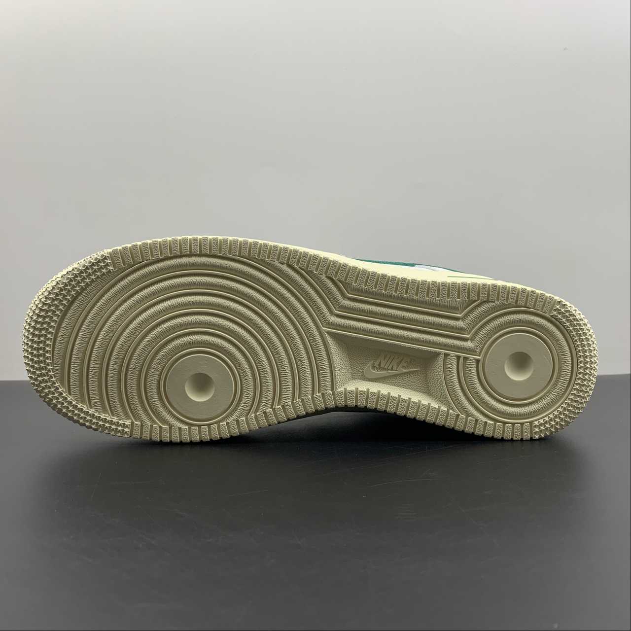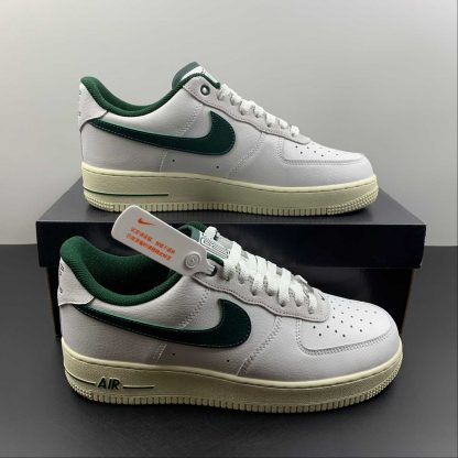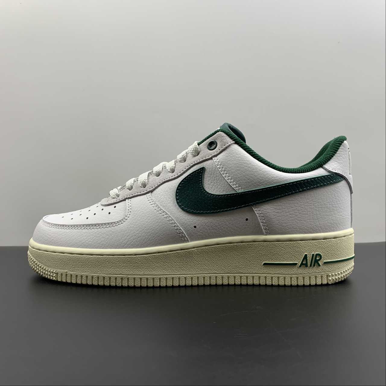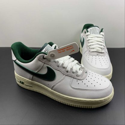 This low-top AF1 has a heavily tumbled Summit White leather upper. Sail-coloured suede eye stay panels provide light contrast. The signature profile Swooshes that glide across both the medial and lateral mid-panels are in dark Gorge Green. The terry sock liner and the tongue lining all follow suit. Gorge Green “Force” outline branding stands out on the Summit White tumbled leather tongues. A vintage-looking Sail-coloured sole unit wraps up the look of these kicks.