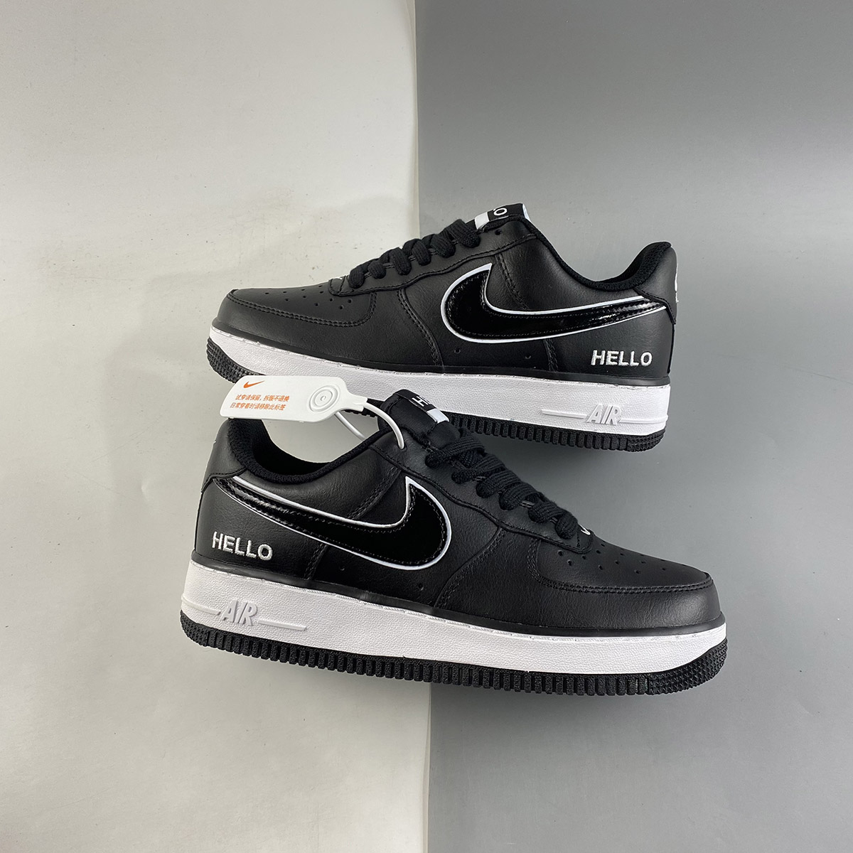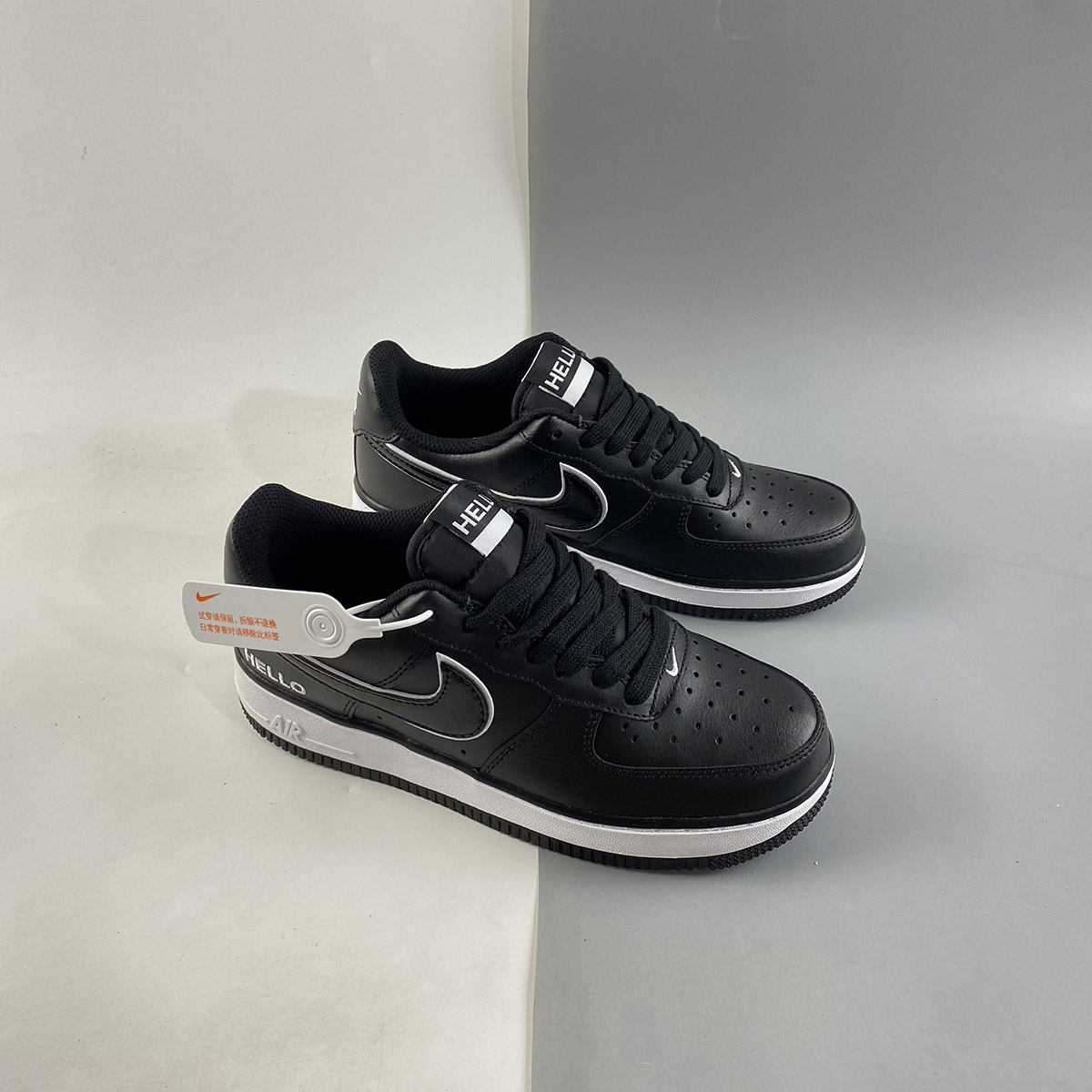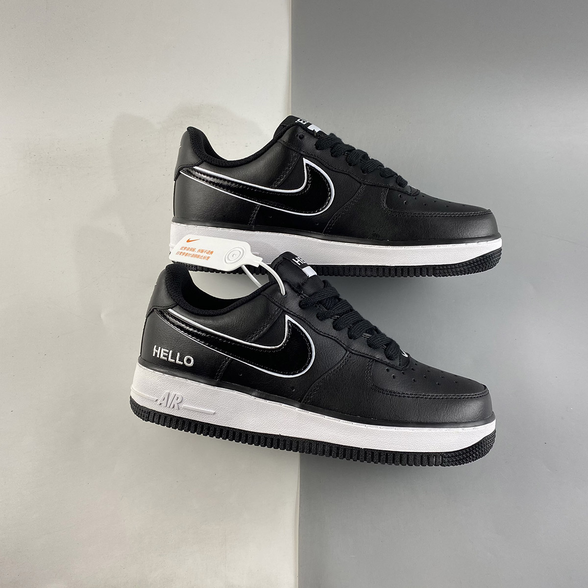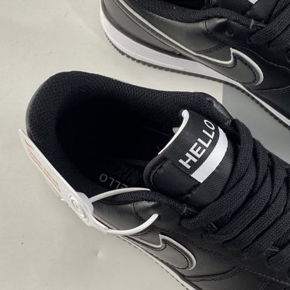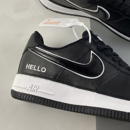 this Nike Air Force 1 comes dressed in a Black and White color combination. First, we have Black leather on the upper that’s outlined in White on the Swoosh logos and adorns the ‘Hello’ embroidered by the heel. Next, we have the ‘Hello’ name tag on the tongue and insoles while White runs across the midsole. Finally, we have a Black rubber outsole to finish the look.