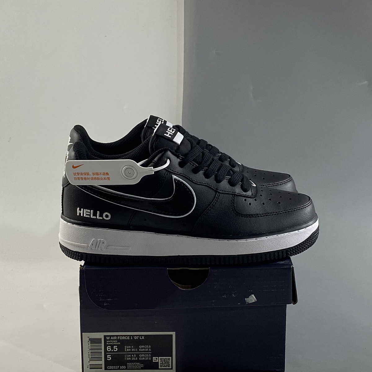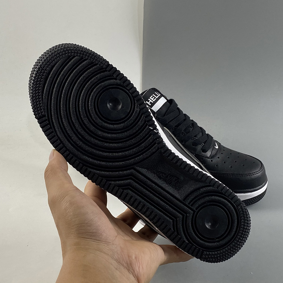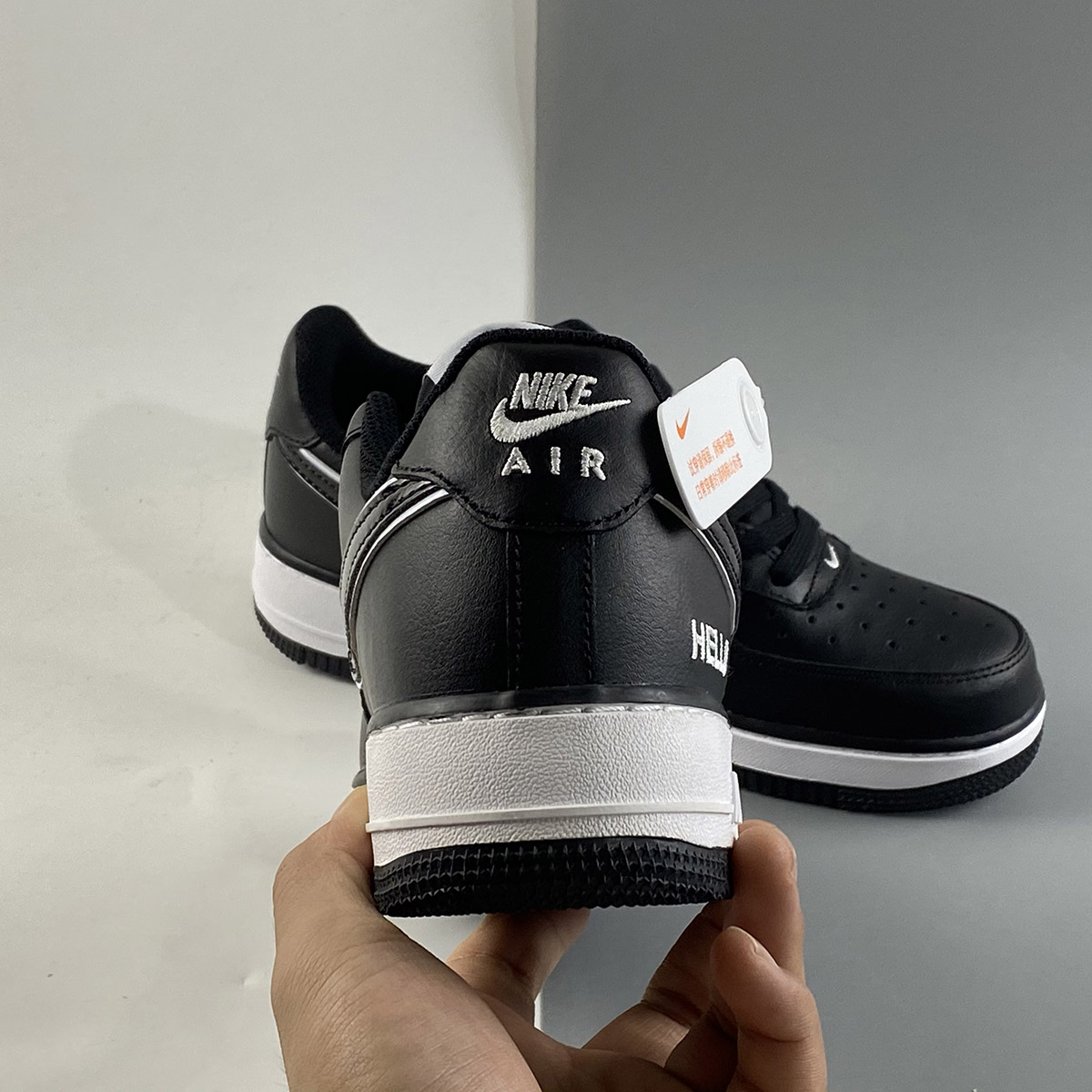 this Nike Air Force 1 comes dressed in a Black and White color combination. First, we have Black leather on the upper that’s outlined in White on the Swoosh logos and adorns the ‘Hello’ embroidered by the heel. Next, we have the ‘Hello’ name tag on the tongue and insoles while White runs across the midsole. Finally, we have a Black rubber outsole to finish the look.