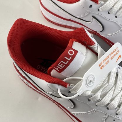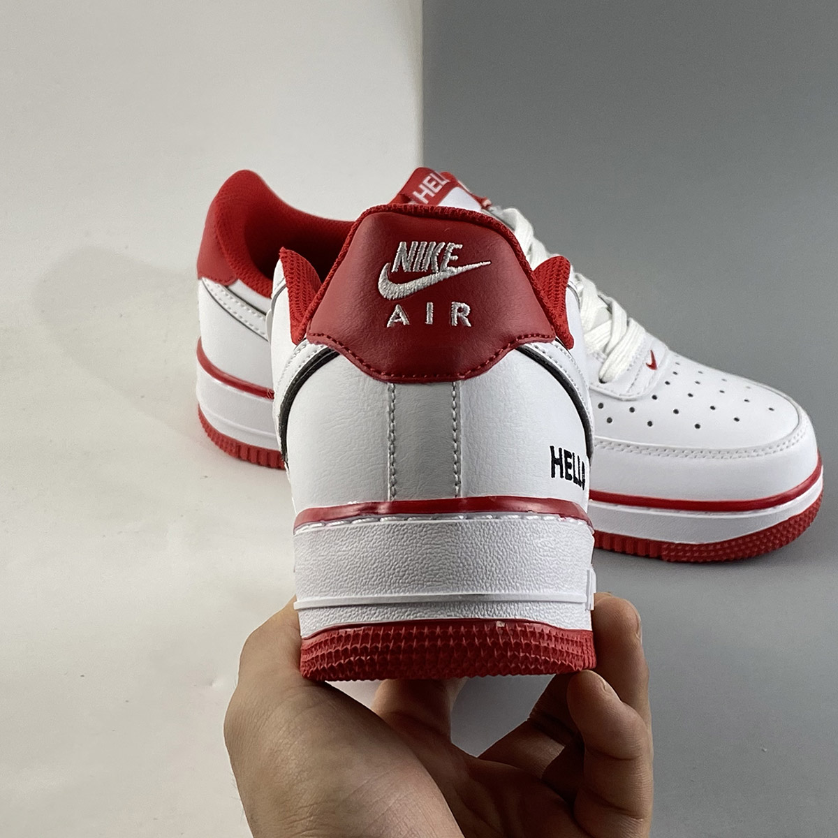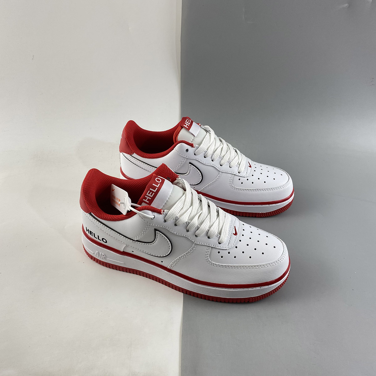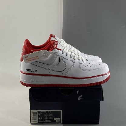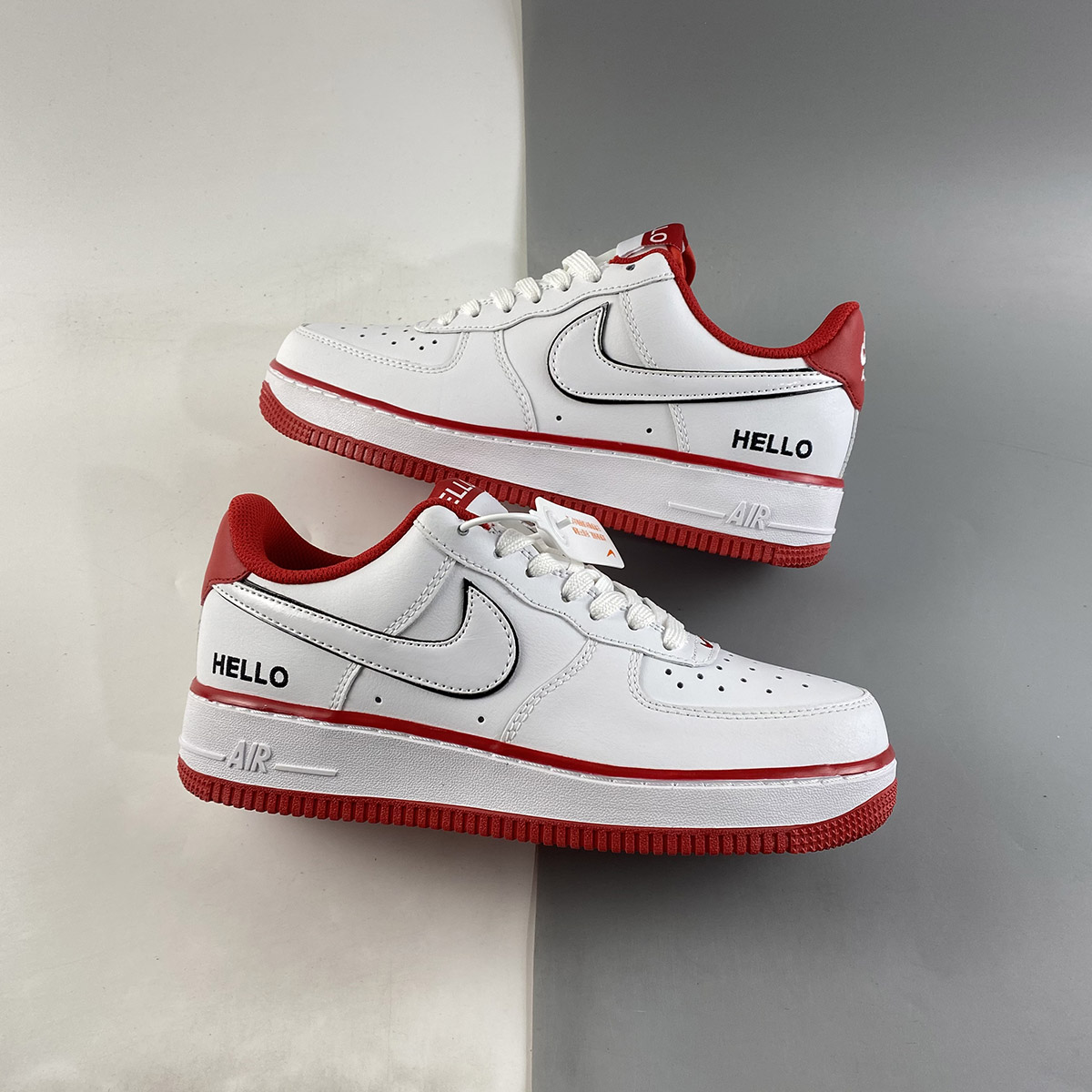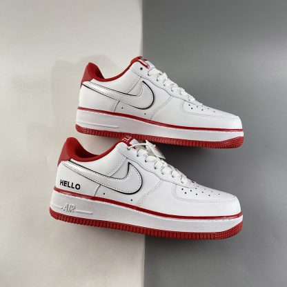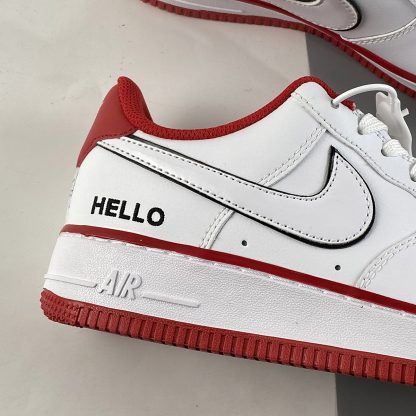 Going over this Nike Air Force 1, they feature a White, University Red, and Black color combination. Utilizing White leather across the upper while Black outlines the Swoosh on the panels and ‘Hello’ by the lateral heel. On the tongue label, we have the ‘Hello’ name tag while the word and Nike Air adorns the insoles. Finally, a White midsole and a Red rubber outsole finish the look.