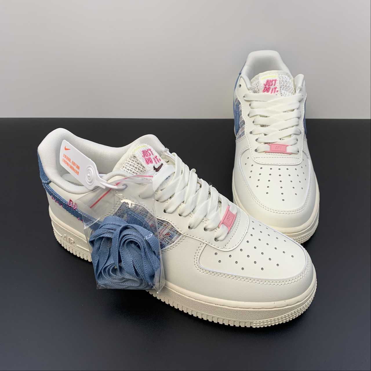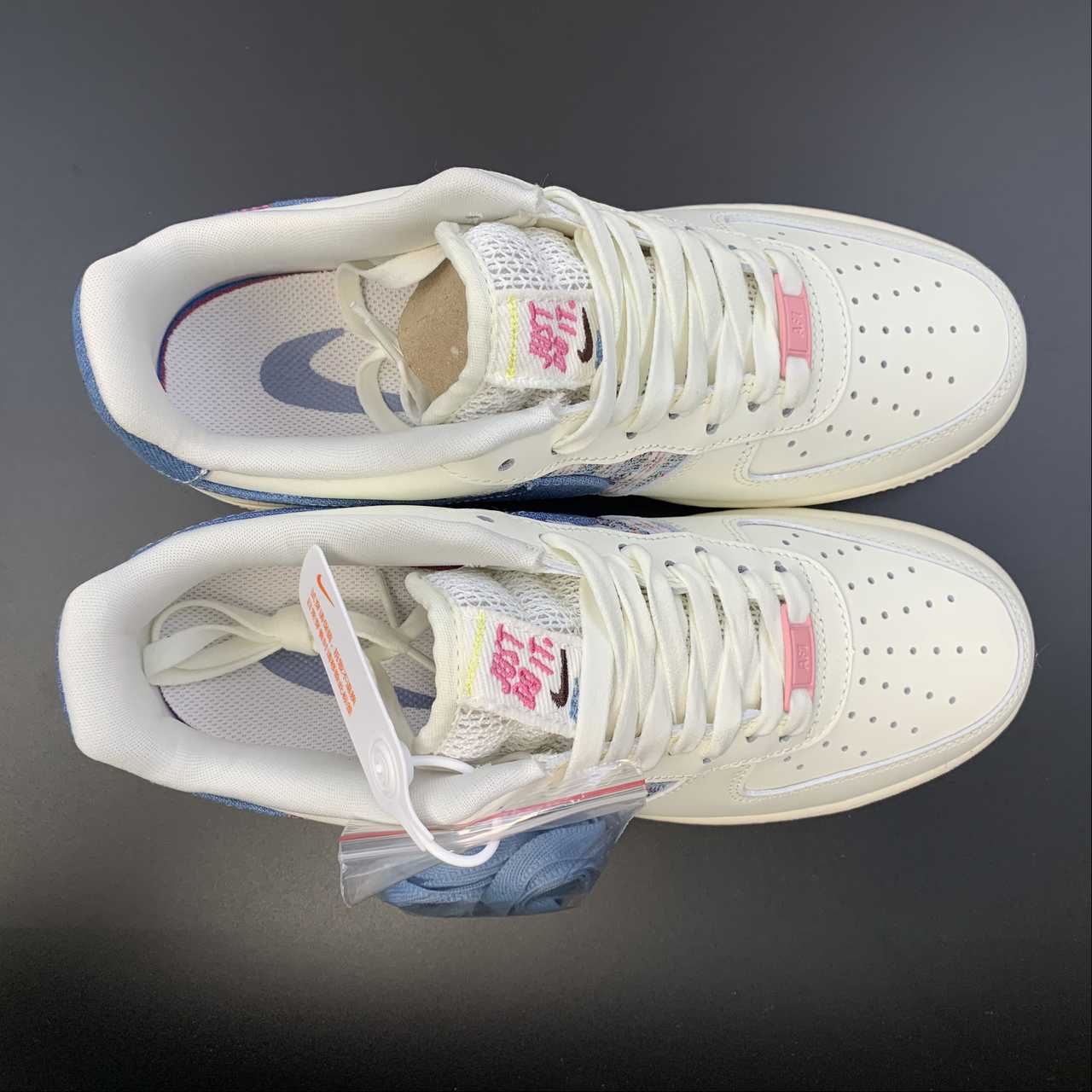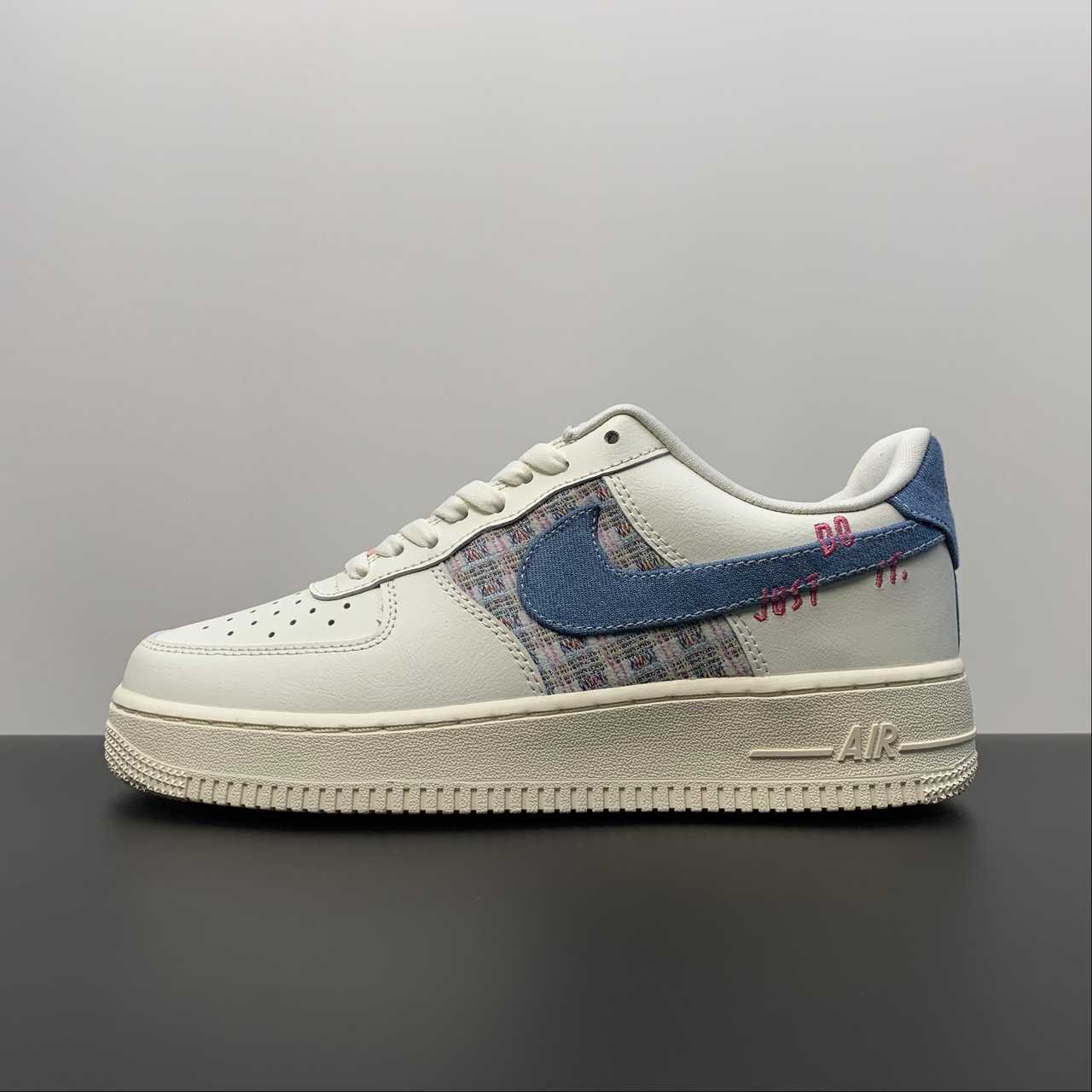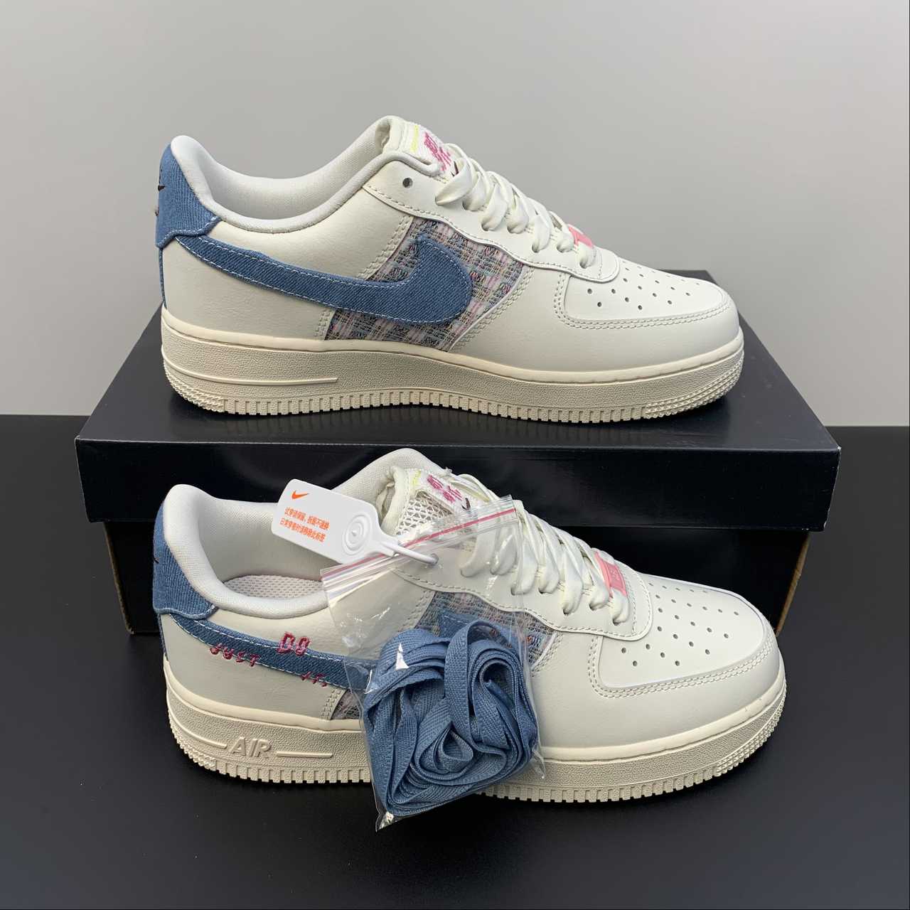 Additionally, Just above this sits a blue denim Swoosh that runs back to a heel tab with the same construction. Other added details include the woven tongue, an extended tongue tag with Just Do It branding, and this same saying embroidered along the end of the Swoosh in pink. Rounding out the design is the coconut milk-shaded AF1 midsole paired with a matching rubber outsole.