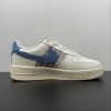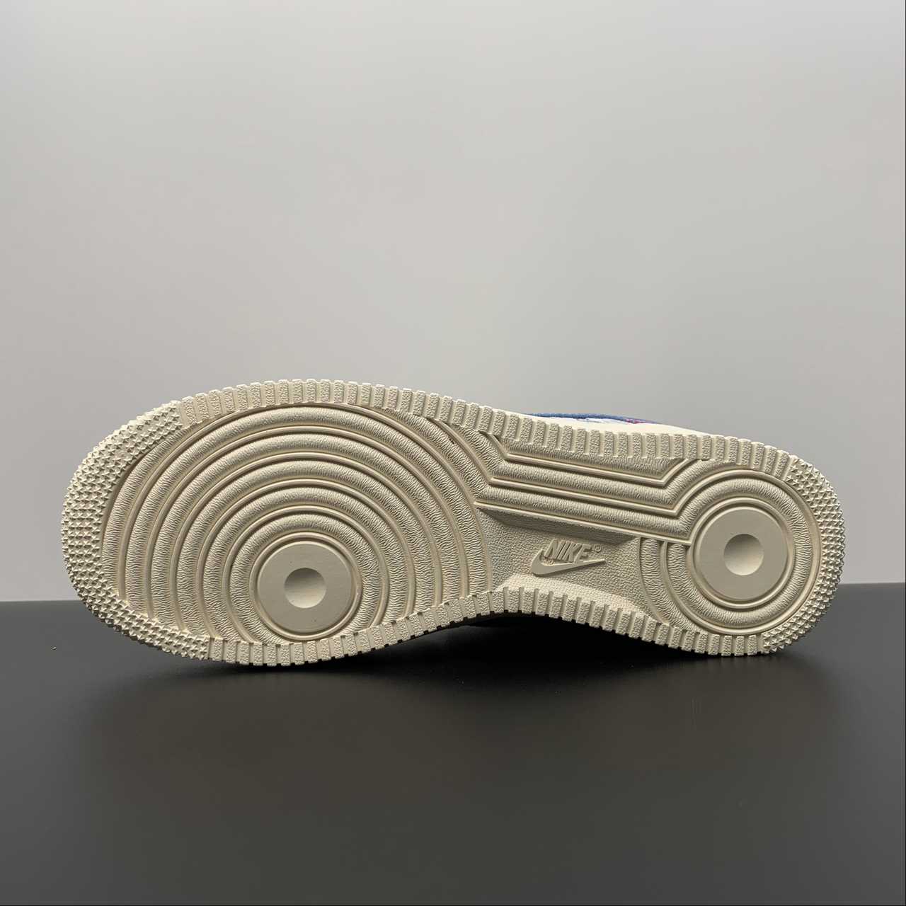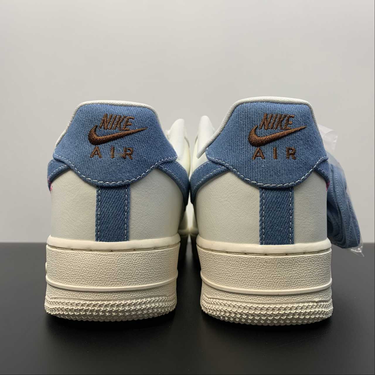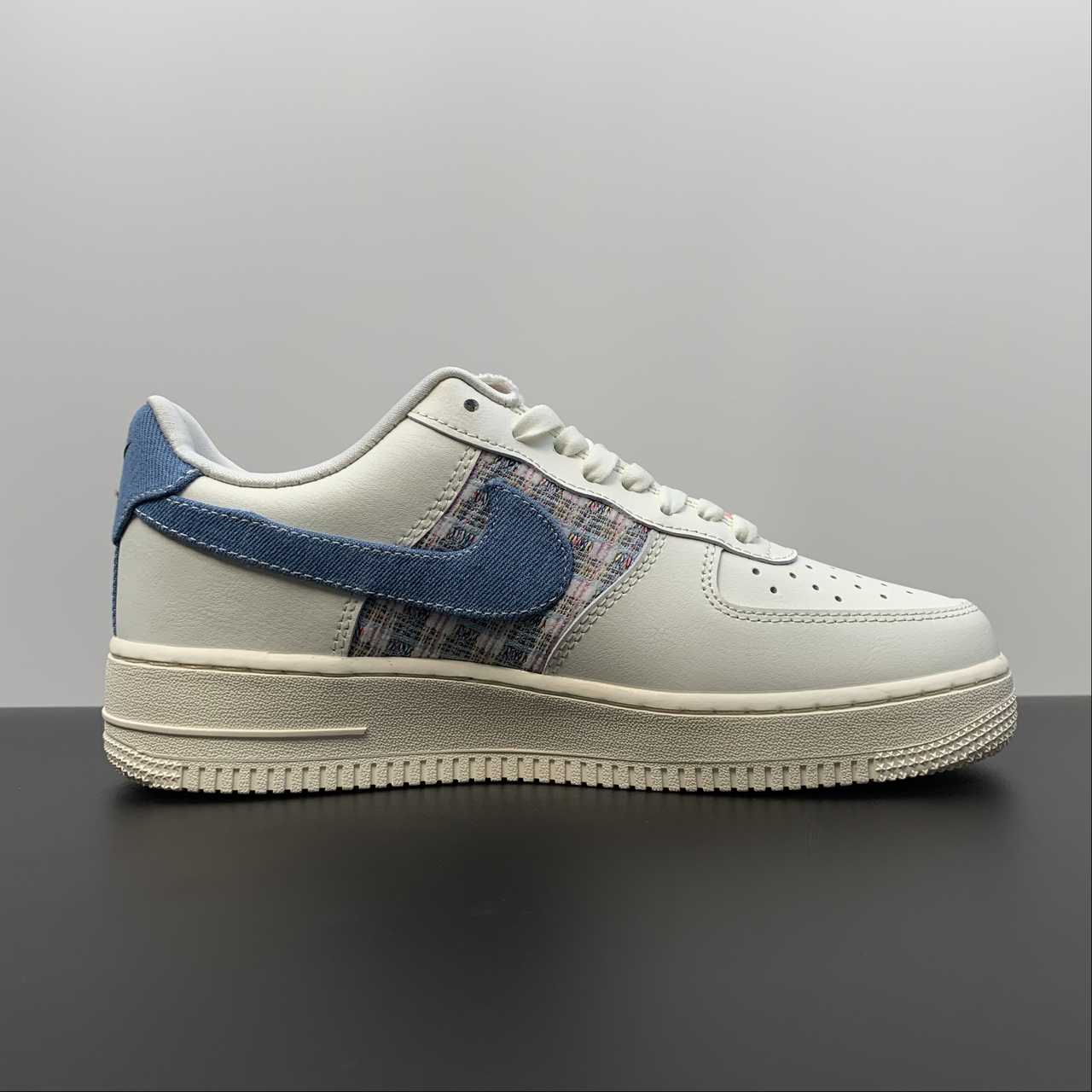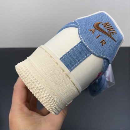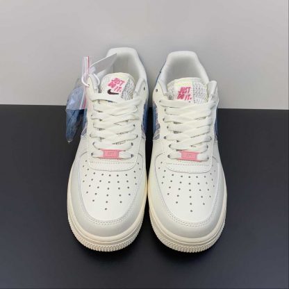 Additionally, Just above this sits a blue denim Swoosh that runs back to a heel tab with the same construction. Other added details include the woven tongue, an extended tongue tag with Just Do It branding, and this same saying embroidered along the end of the Swoosh in pink. Rounding out the design is the coconut milk-shaded AF1 midsole paired with a matching rubber outsole.