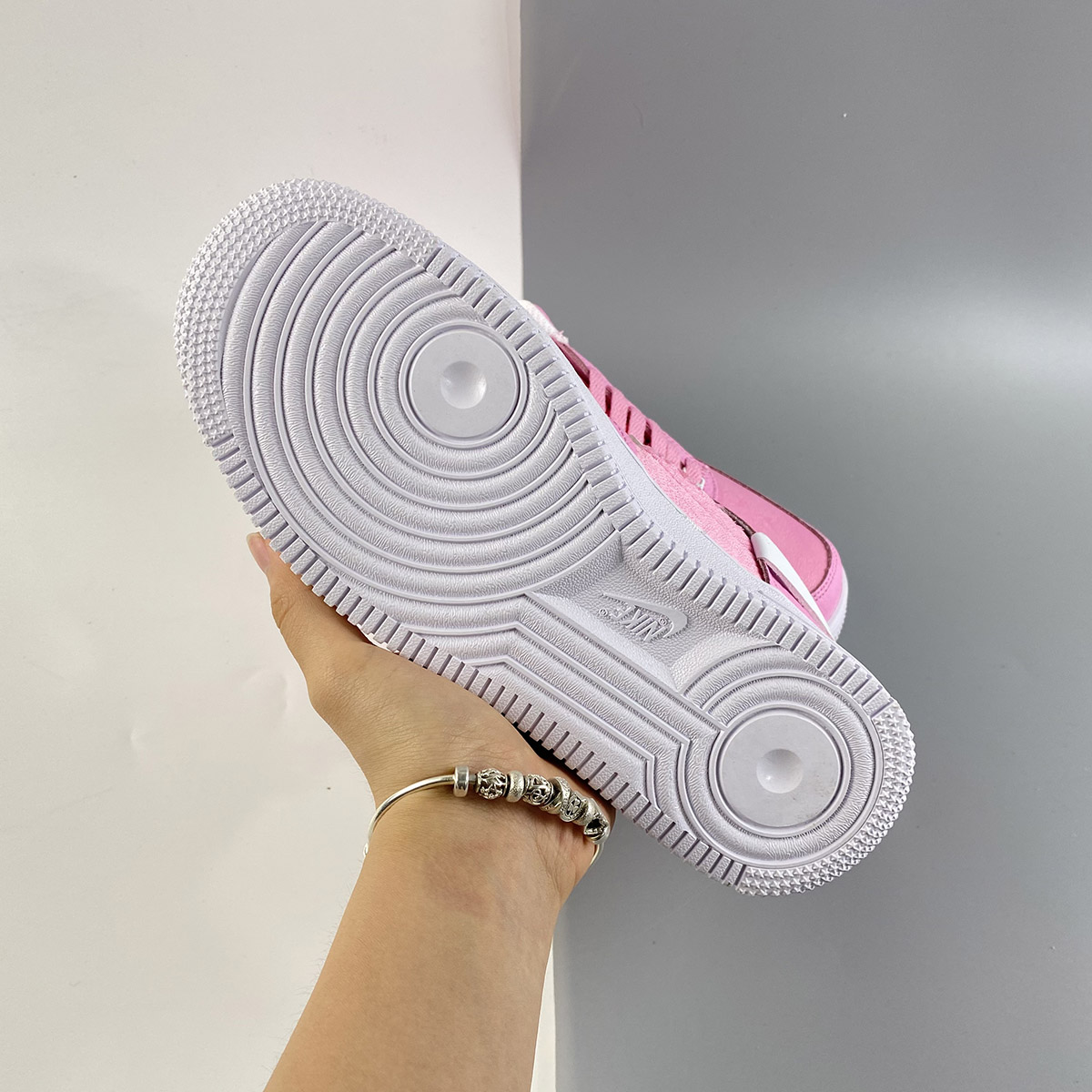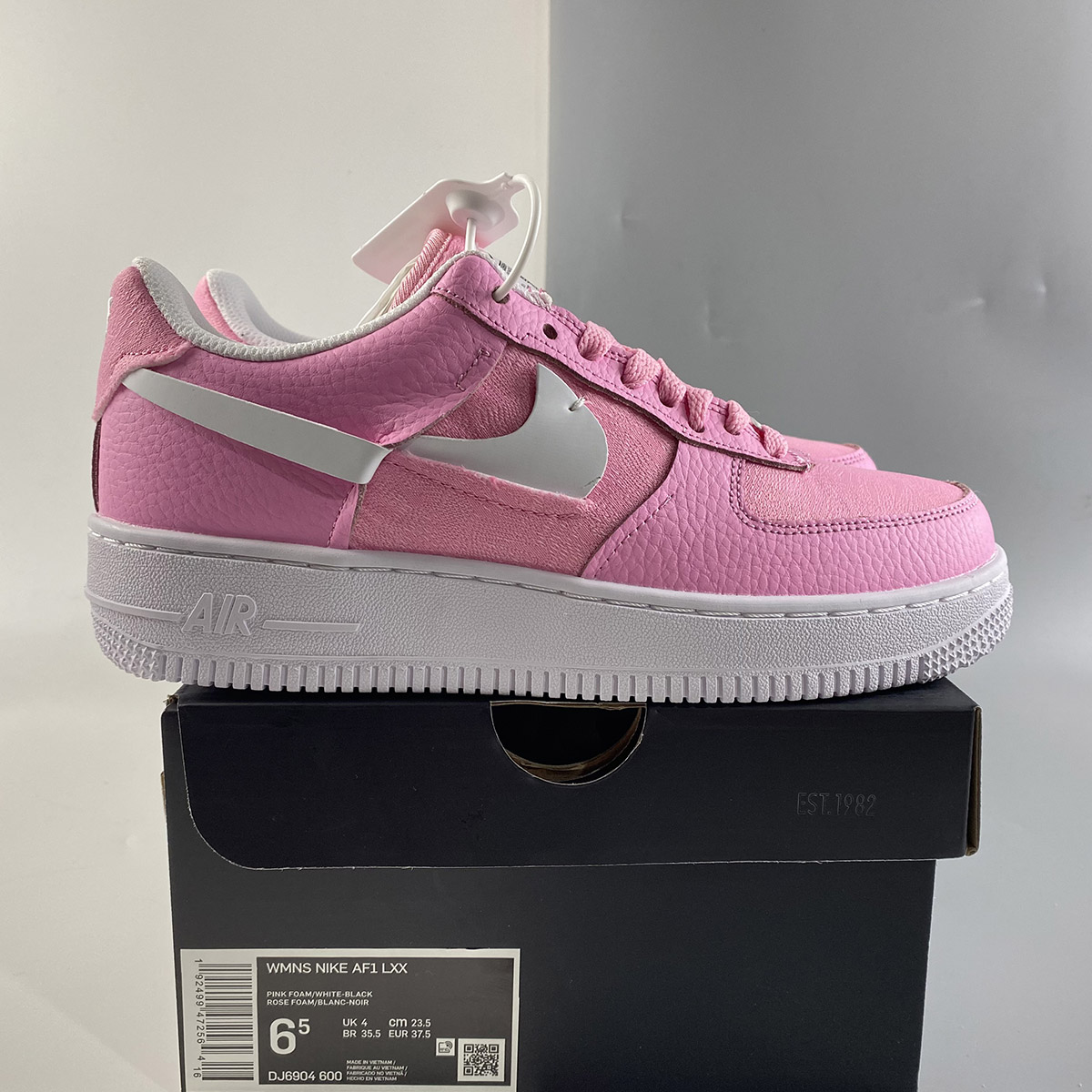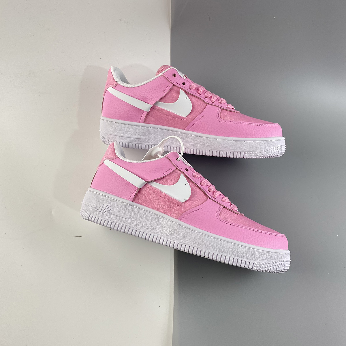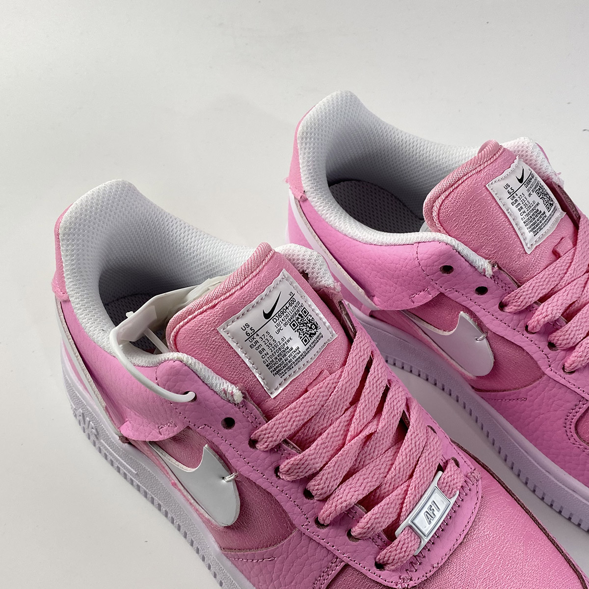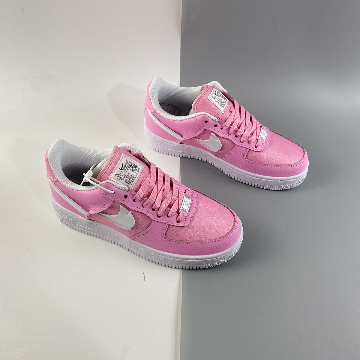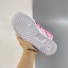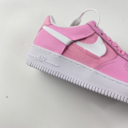 Dressed in a Pink Foam, Foam and Black color scheme. This Nike Air Force 1 Low features textile Pink appearing on the toe box, side panel, tongues, and heels with a lighter shade of Pink leather used on the overlays and eyestays. White Swooshes and rubber AF1 sole with the models signature tag label displayed on the tongues completes the design.