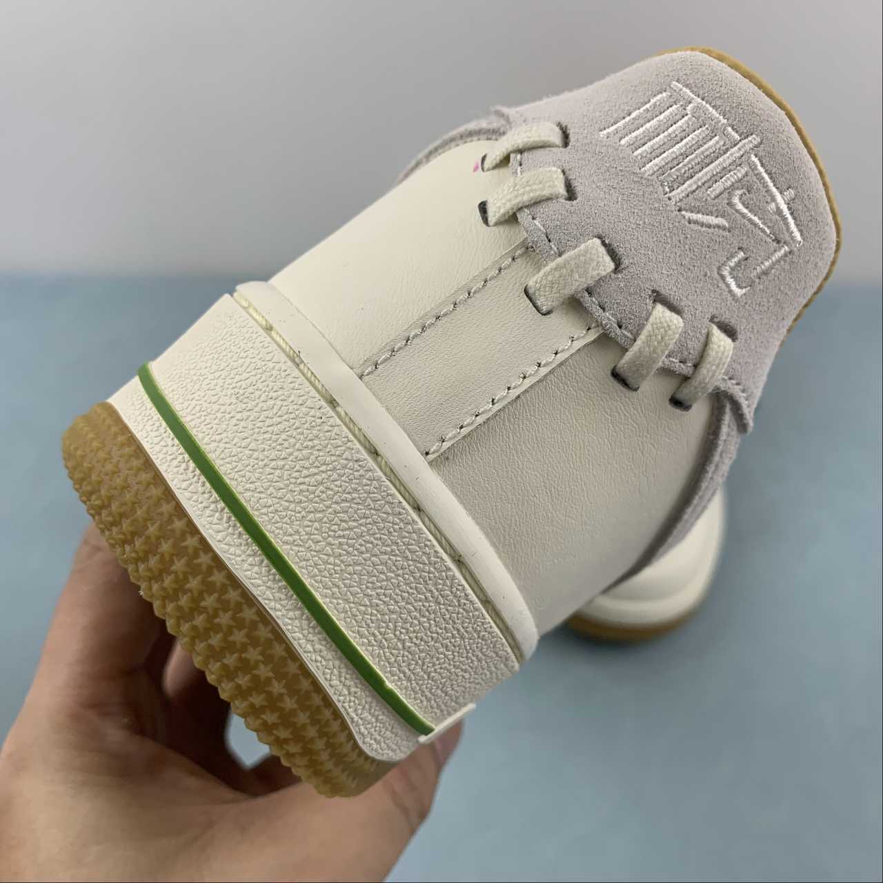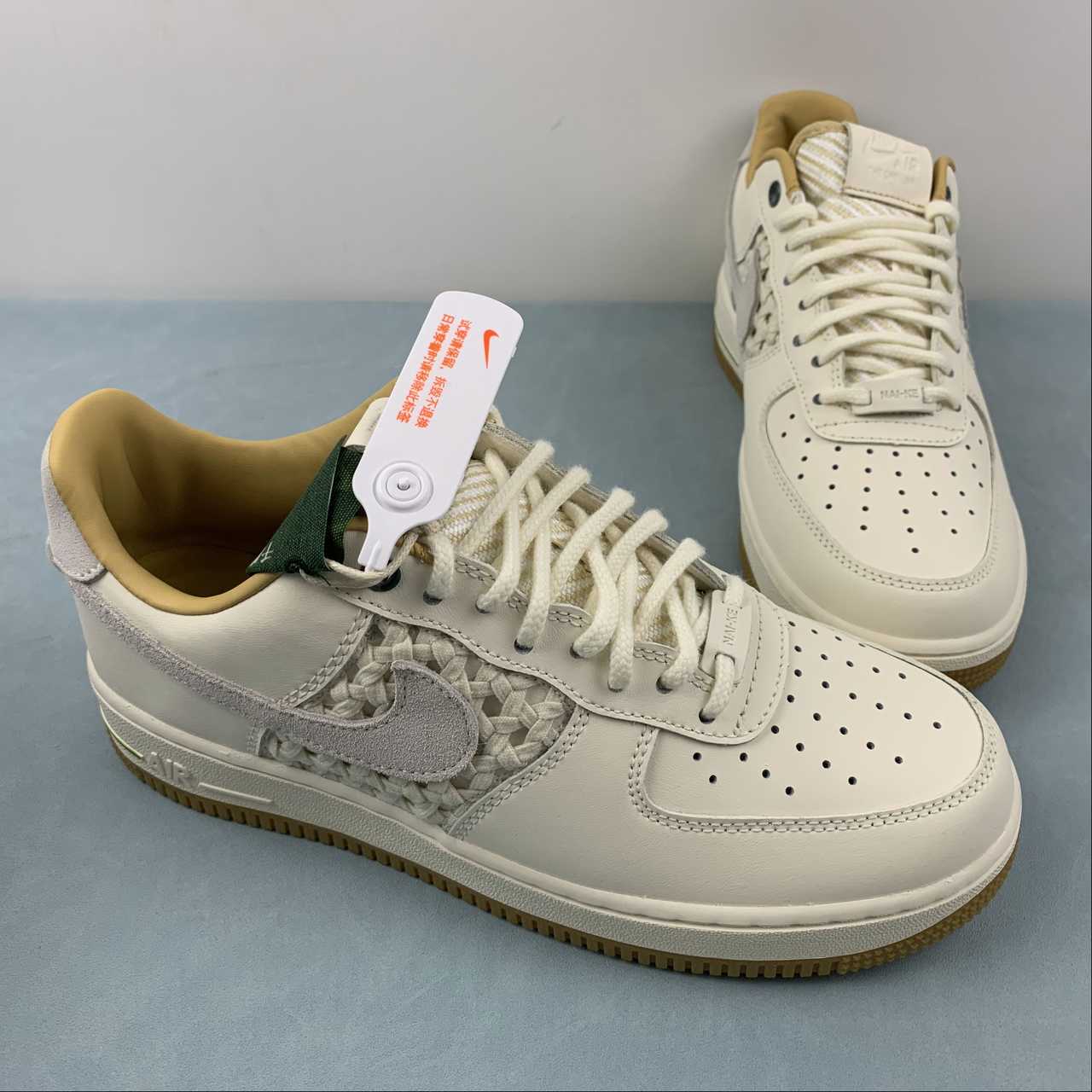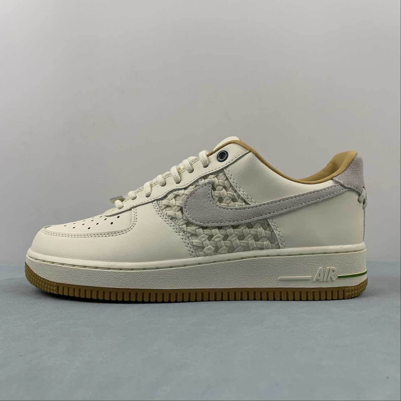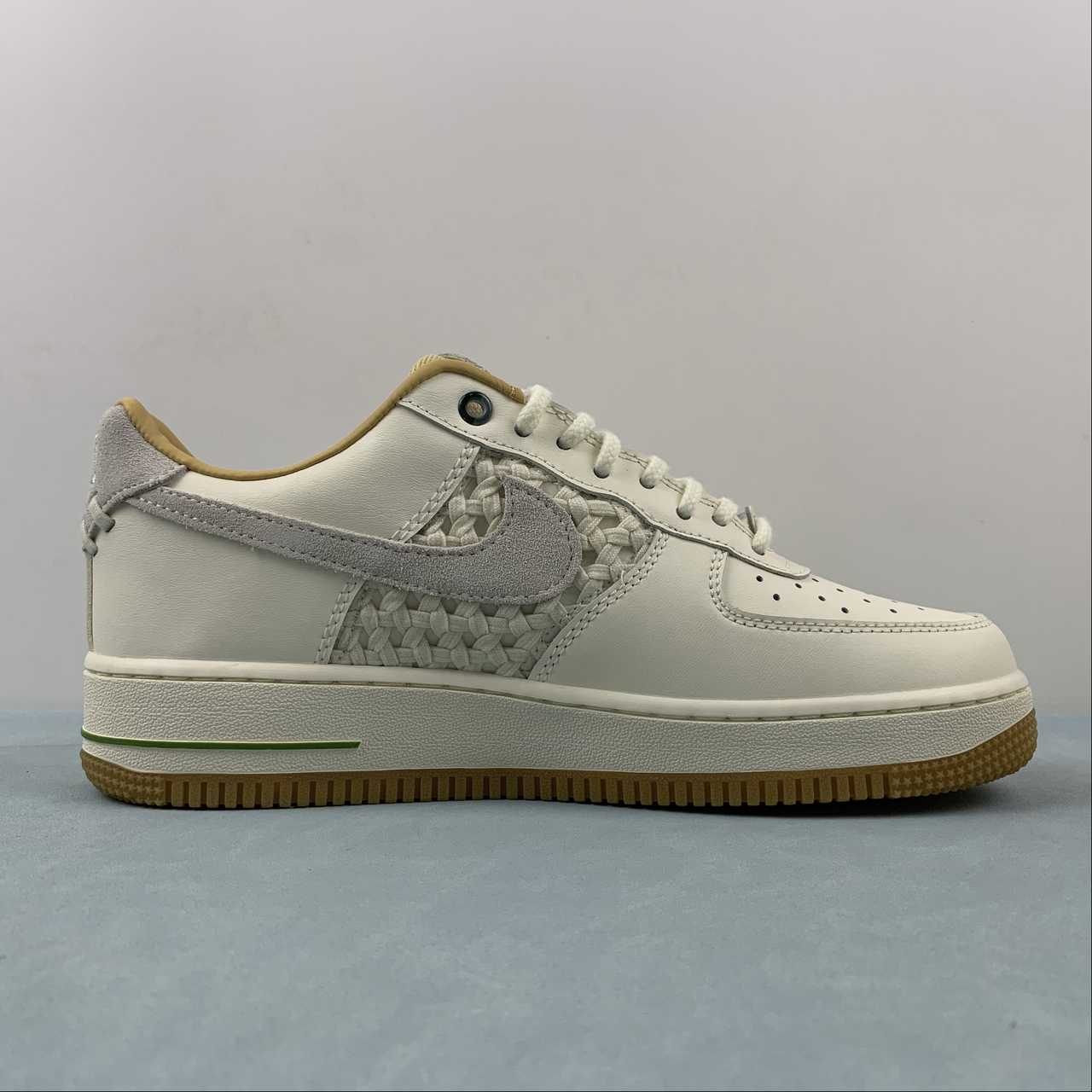 This Nike Air Force 1 Low “NAI-KE” looks to be inspired by traditional basket weaving techniques, as it features woven detailing on the side panels. In terms of colorway, the pair keeps it clean in “Sail”, which arrives on the sneaker’s leather overlays, suede Swooshes, laces, and canvas tongue. Subtle hits of contrasting green help accent the upper eyelets and heel trim. Rounding out the final design cues is the “NAI-KE” branding on the heels and insoles, as well as the white midsole and gum rubber outsole.