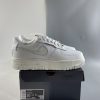 The restructured Air Force 1 gets done in Summit White all over the upper in a mix of leather and mesh with cutout Swooshes hitting the side panels. Unique details include distorted dimensions, an angular midsole, and an oversized heel that contribute to the unique look of the shoe. The traditional branding is removed from the lace dubrae and heel tab while the laces, inner liner, and sole unit are all done in white for a tonal look.