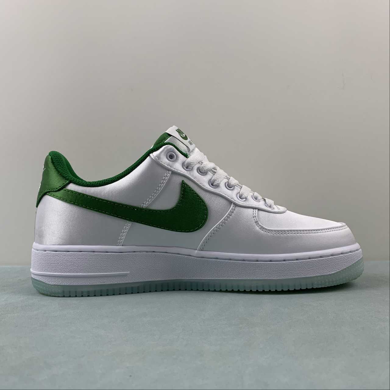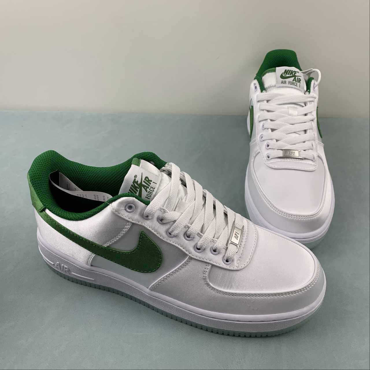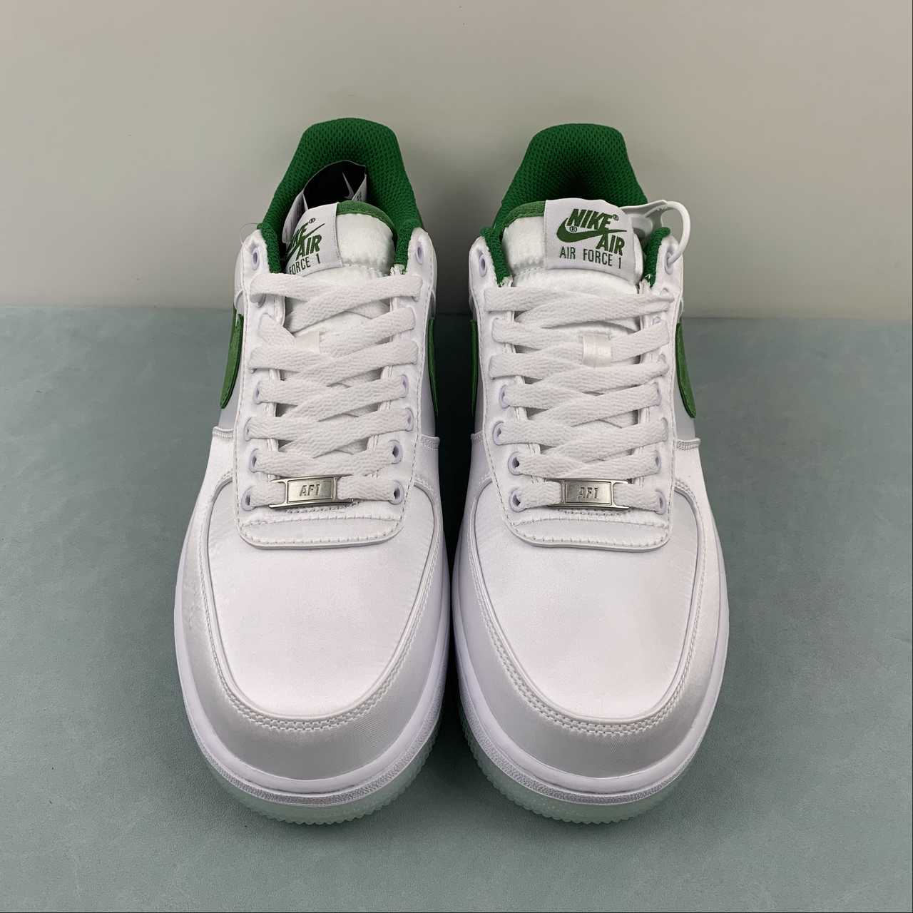 The shoe comes dressed in a white and pine green color scheme and sees the upper of the AF1 Low constructed in white satin. The upper matches the tongues, laces as well as the “Nike Air” embroidery on the heels and midsole. The Swoosh is also highlighted in pine green sating, giving the shoe the added luxe touch. Other details include the staple silver “AF1” lace dubrae that sits atop an icy and green tinted translucent outsole to round out the design.