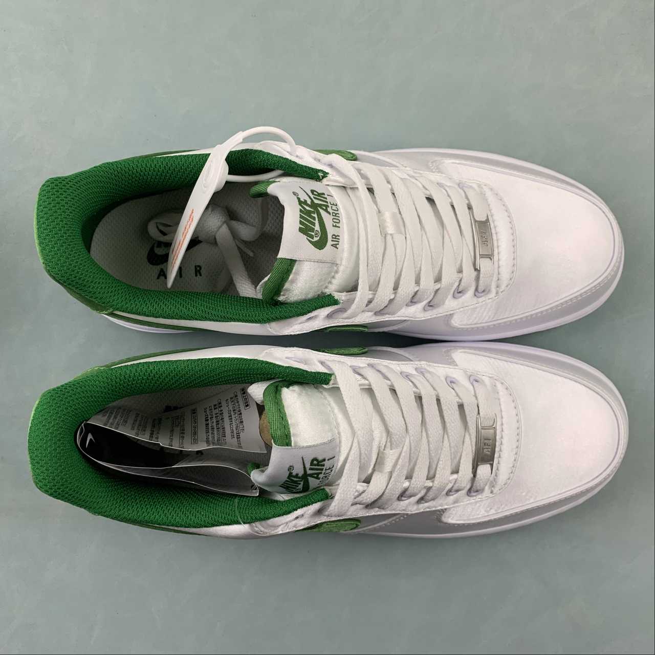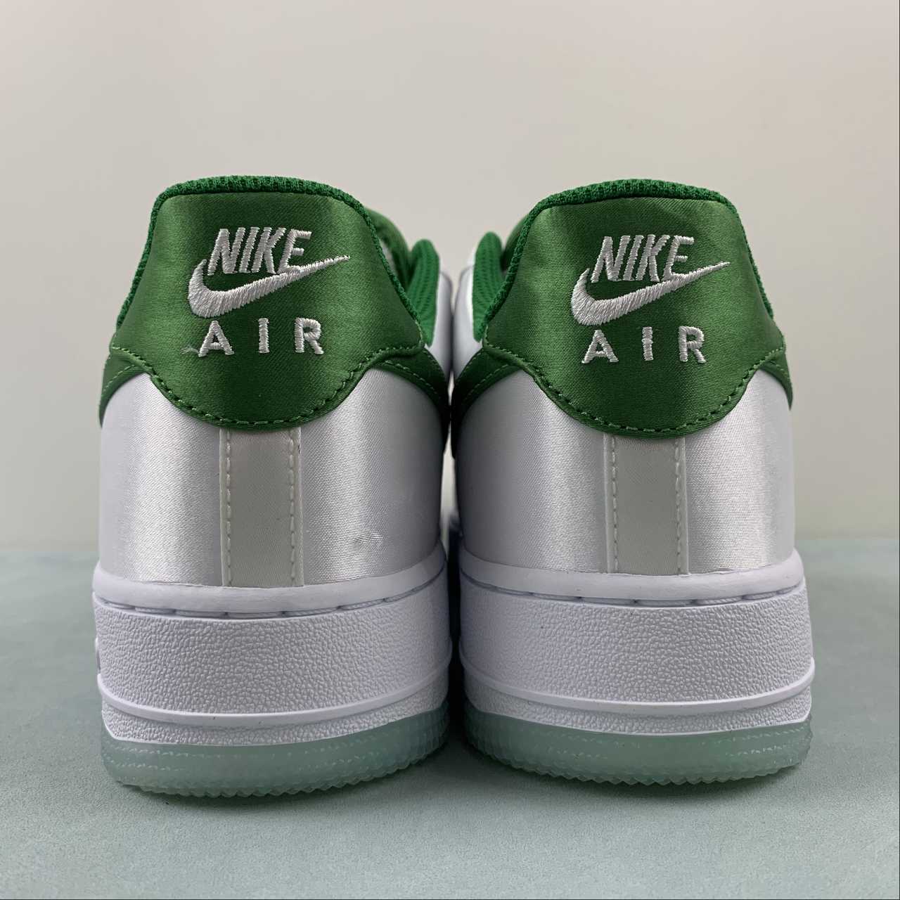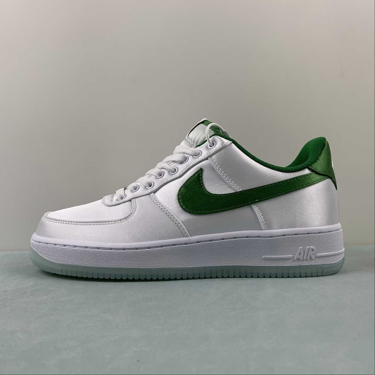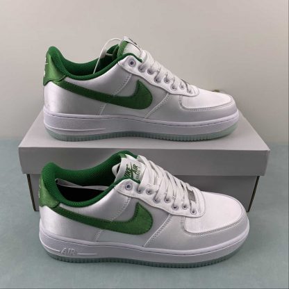 The shoe comes dressed in a white and pine green color scheme and sees the upper of the AF1 Low constructed in white satin. The upper matches the tongues, laces as well as the “Nike Air” embroidery on the heels and midsole. The Swoosh is also highlighted in pine green sating, giving the shoe the added luxe touch. Other details include the staple silver “AF1” lace dubrae that sits atop an icy and green tinted translucent outsole to round out the design.