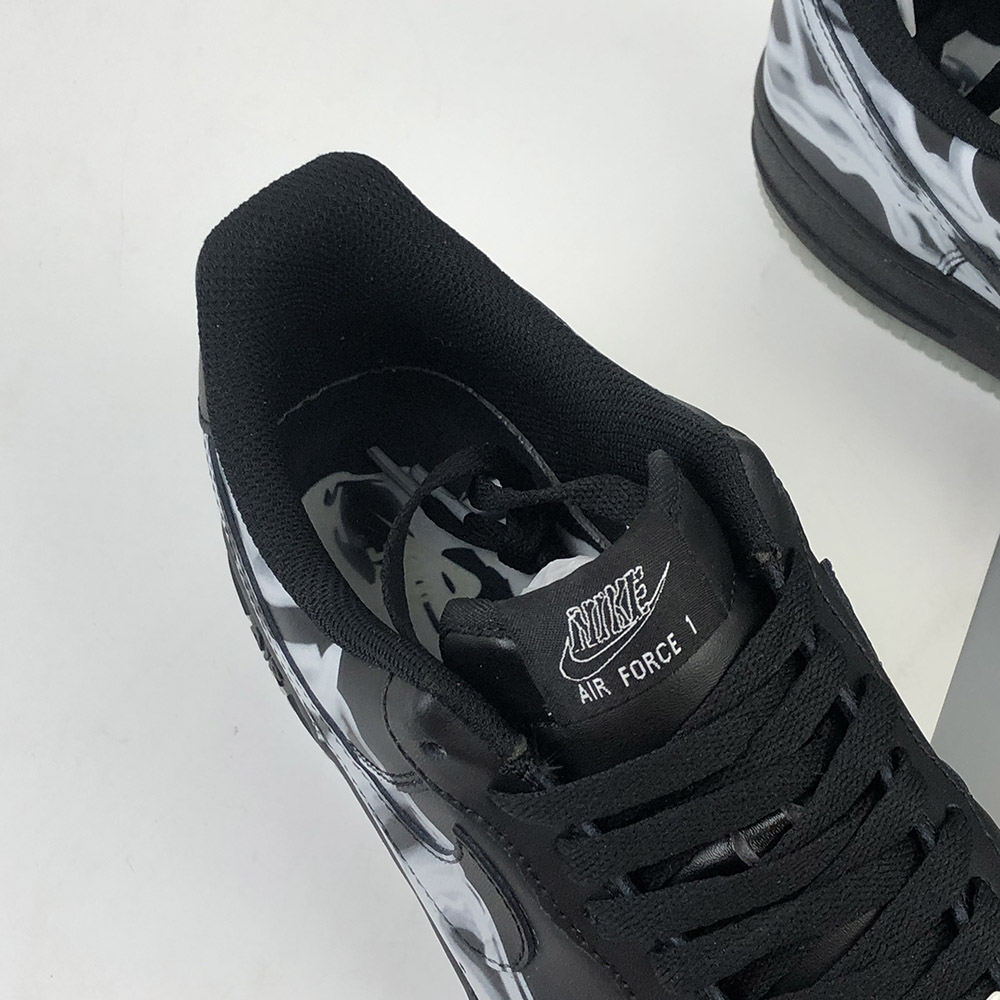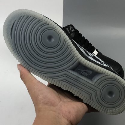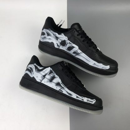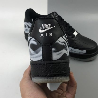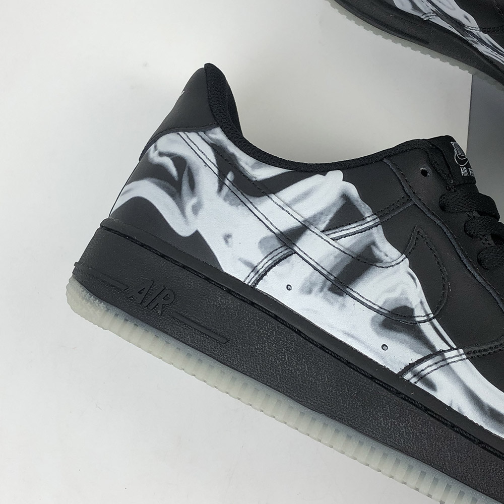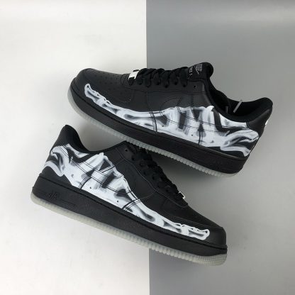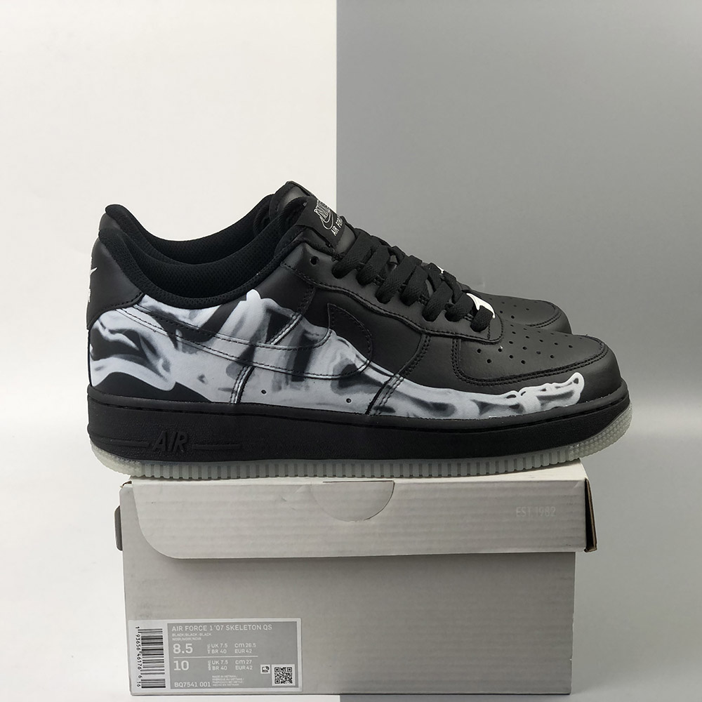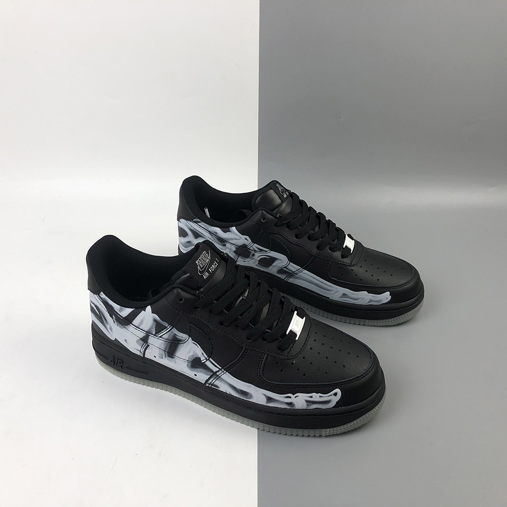 As a stealthy colourway, this pair is covered entirely in black with the exception of that skeleton print. This would be completely understated if it weren’t for the glow-in-the-dark outsole underfoot. This electrifying detail comes to life at night when the AF1 lights up in an ghoulish glow!