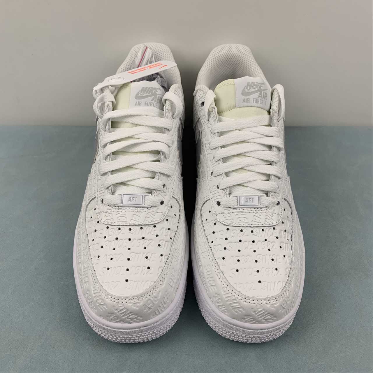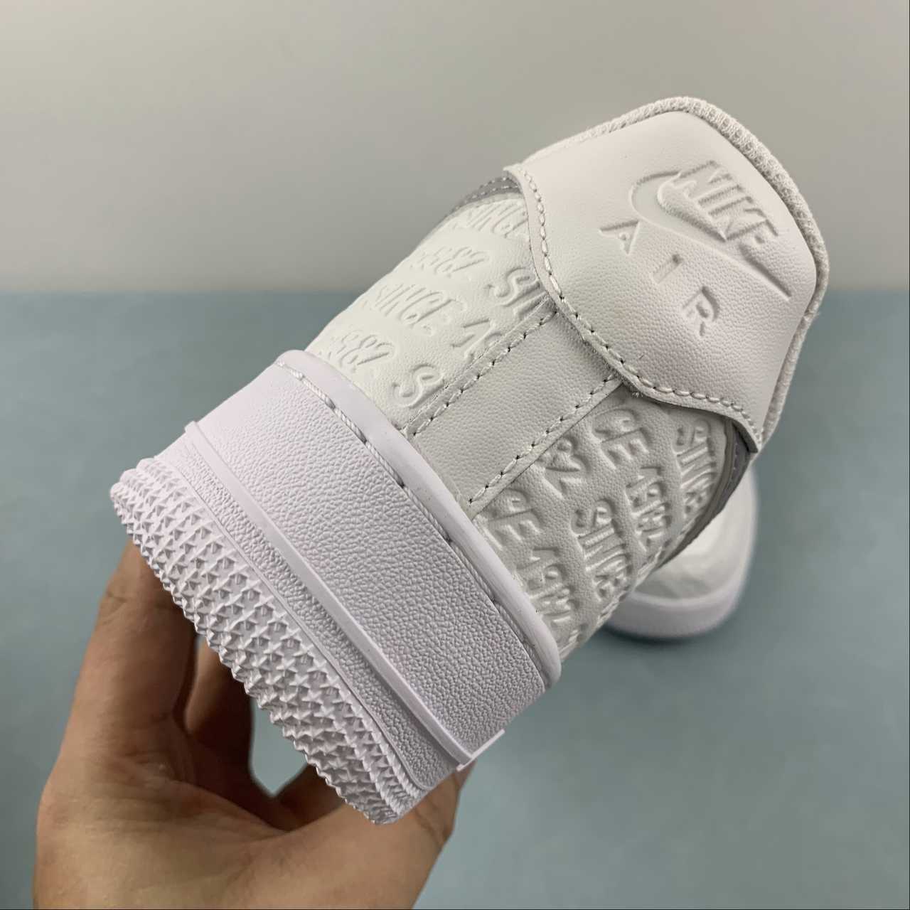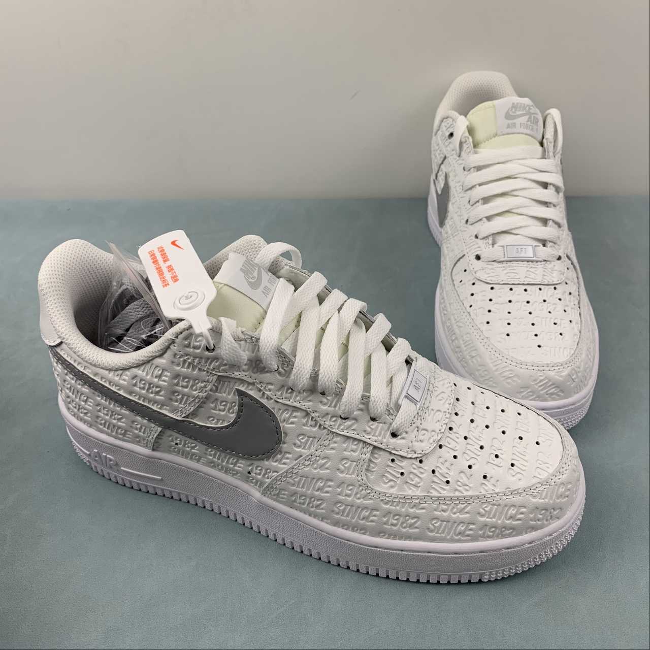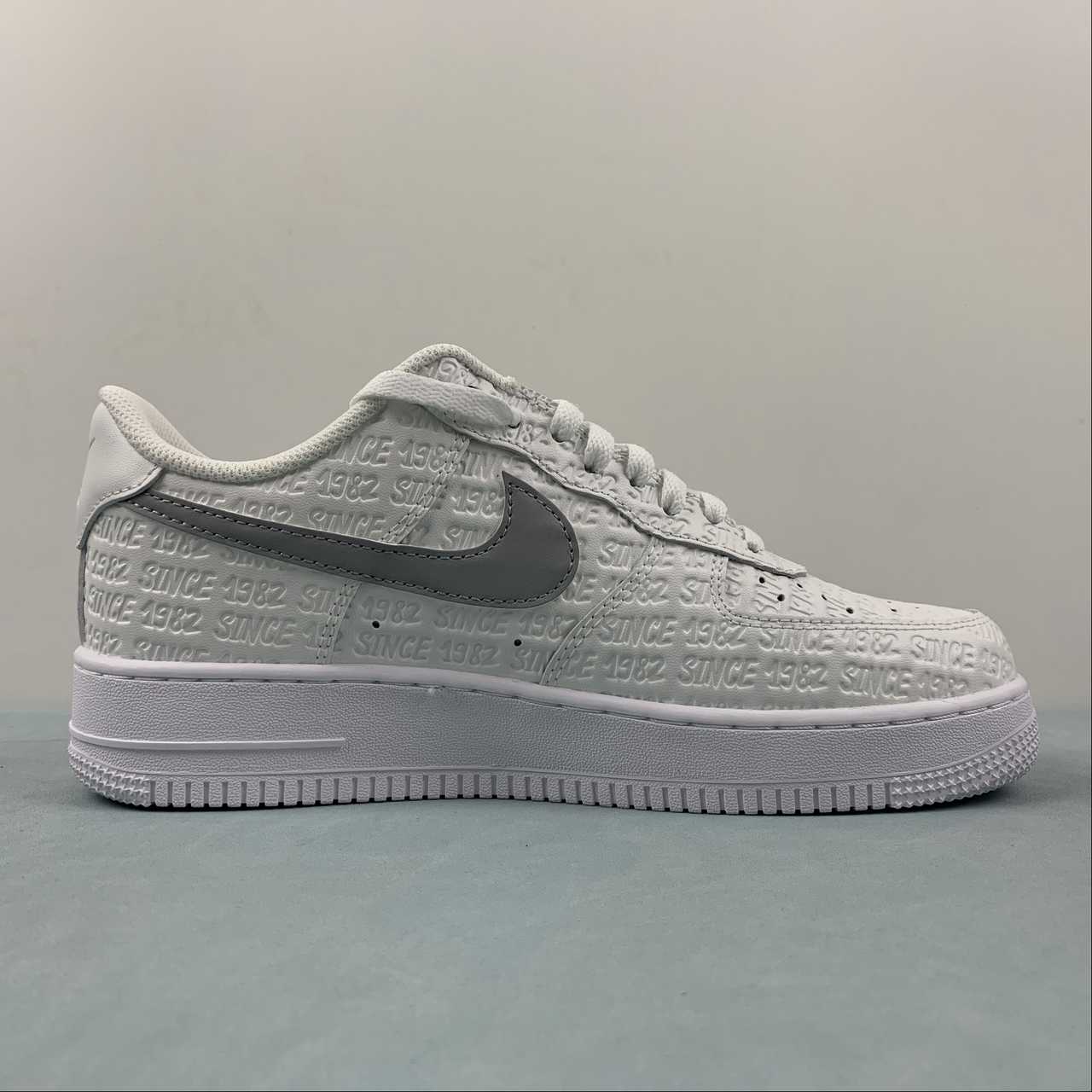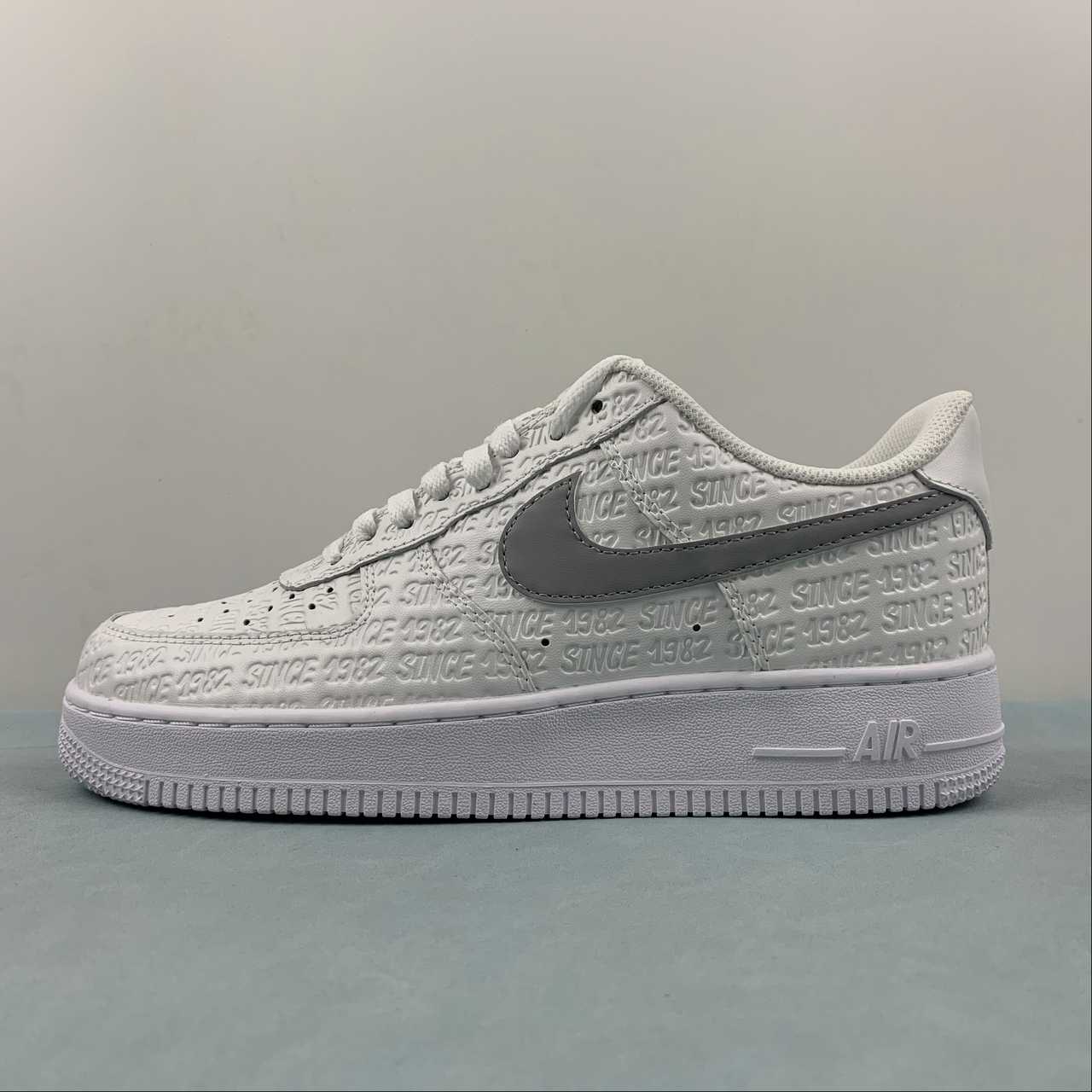 Featuring a pleasant mix of Summit White, Metallic Silver, White, and Sail, this Air Force 1 features an all-over pattern of Since 82 in a street art-stylized typeface. Rather than printing the lettering on the exterior, Nike has chosen to deboss the arrangement onto the Summit White leather upper akin to the monogram pattern of the Louis Vuitton x Air Force 1 Low.