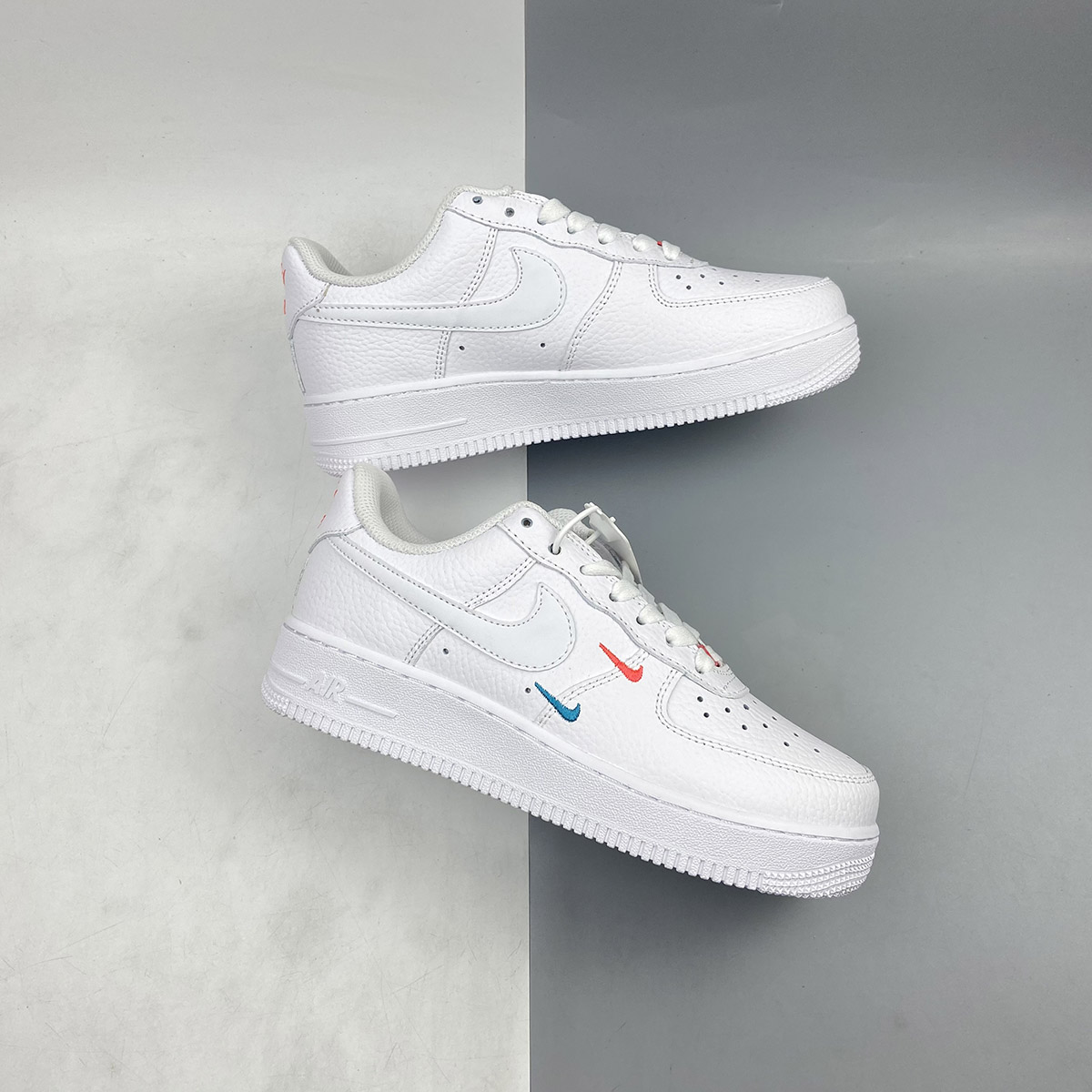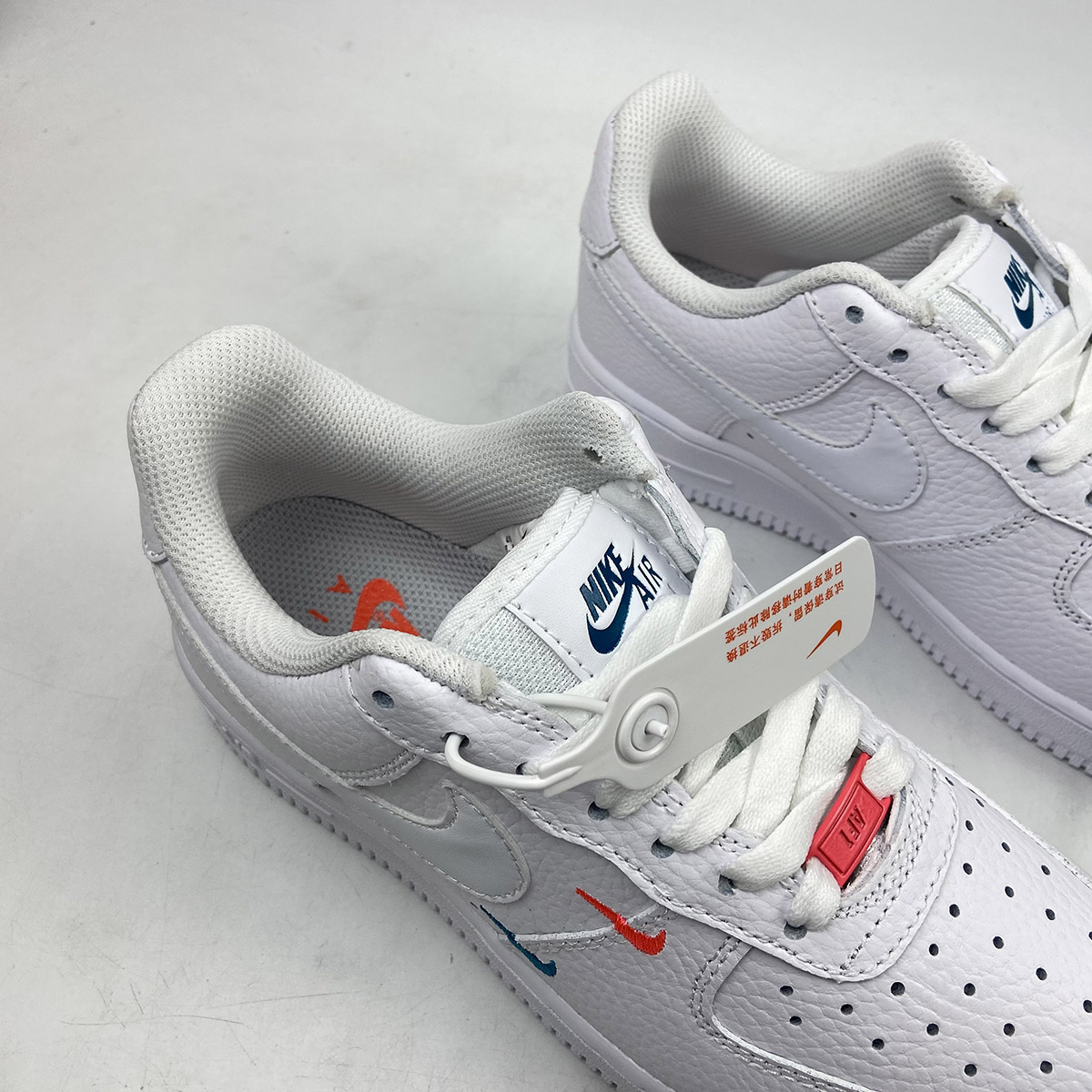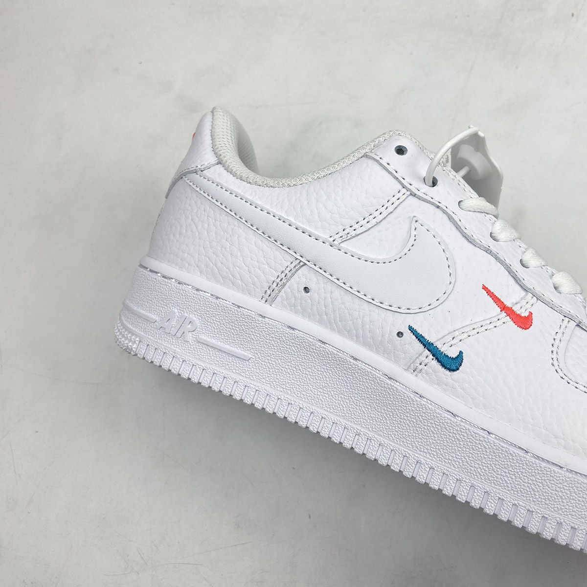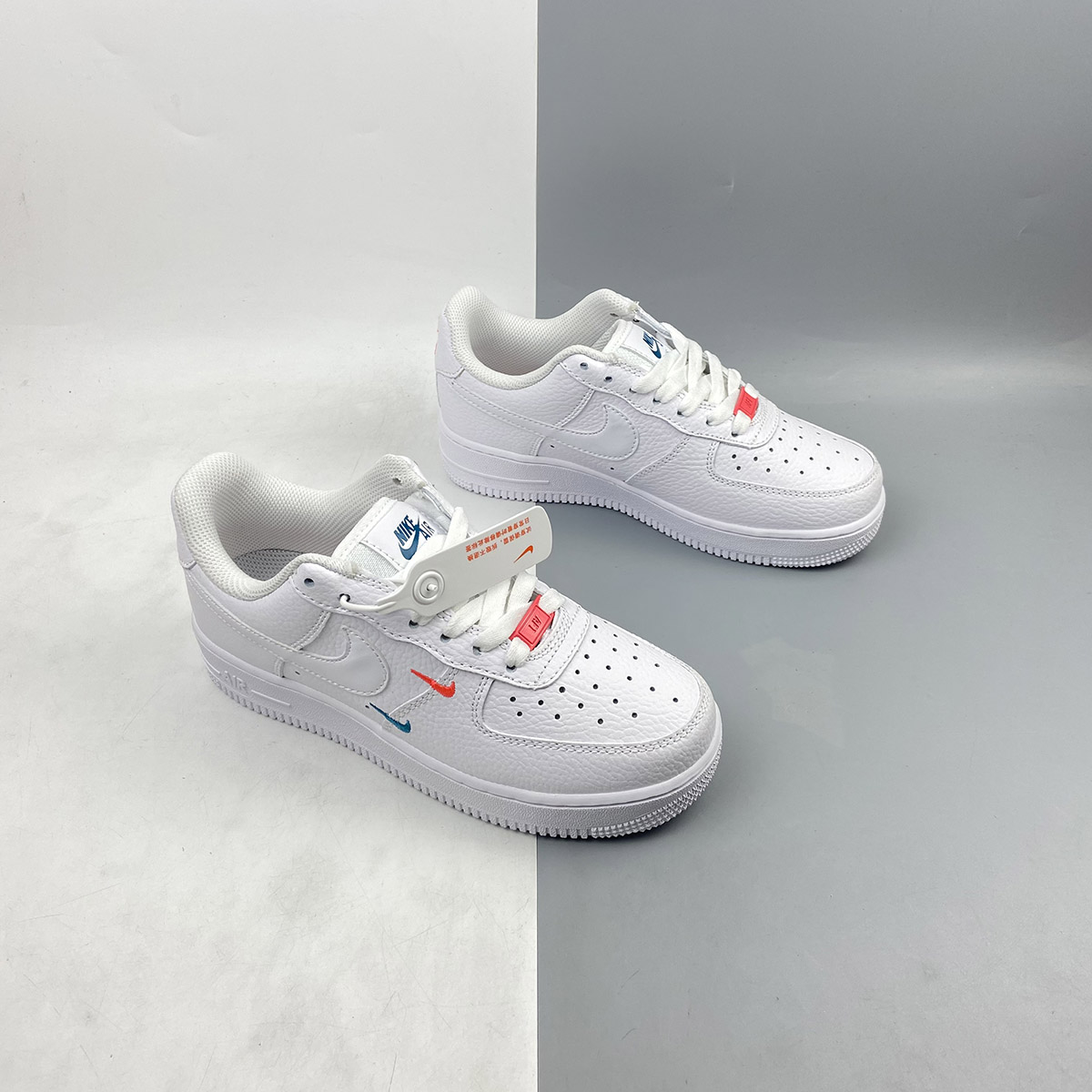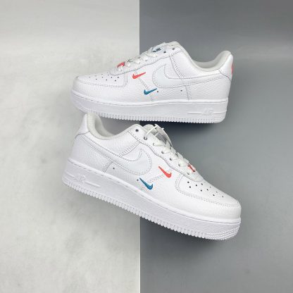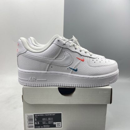 This offering of the Nike Air Force 1 Low features a Summit White tumbled leather upper with smooth leather Swooshes and mesh tongues. Mini Swooshes on the lateral forefoot in Orange and Teal atop a solid White AF1 sole completes the design.
