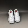 The classic shoe features a full White patent leather upper with bold mismatched Nike Swoosh logos in a Red gradient and Navy gradient color tones.