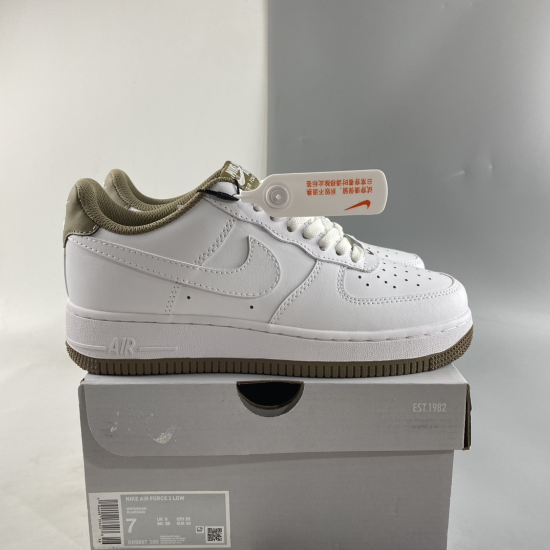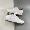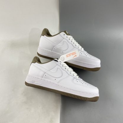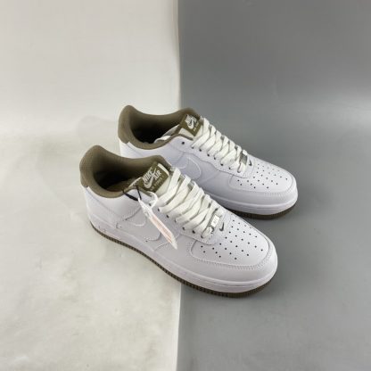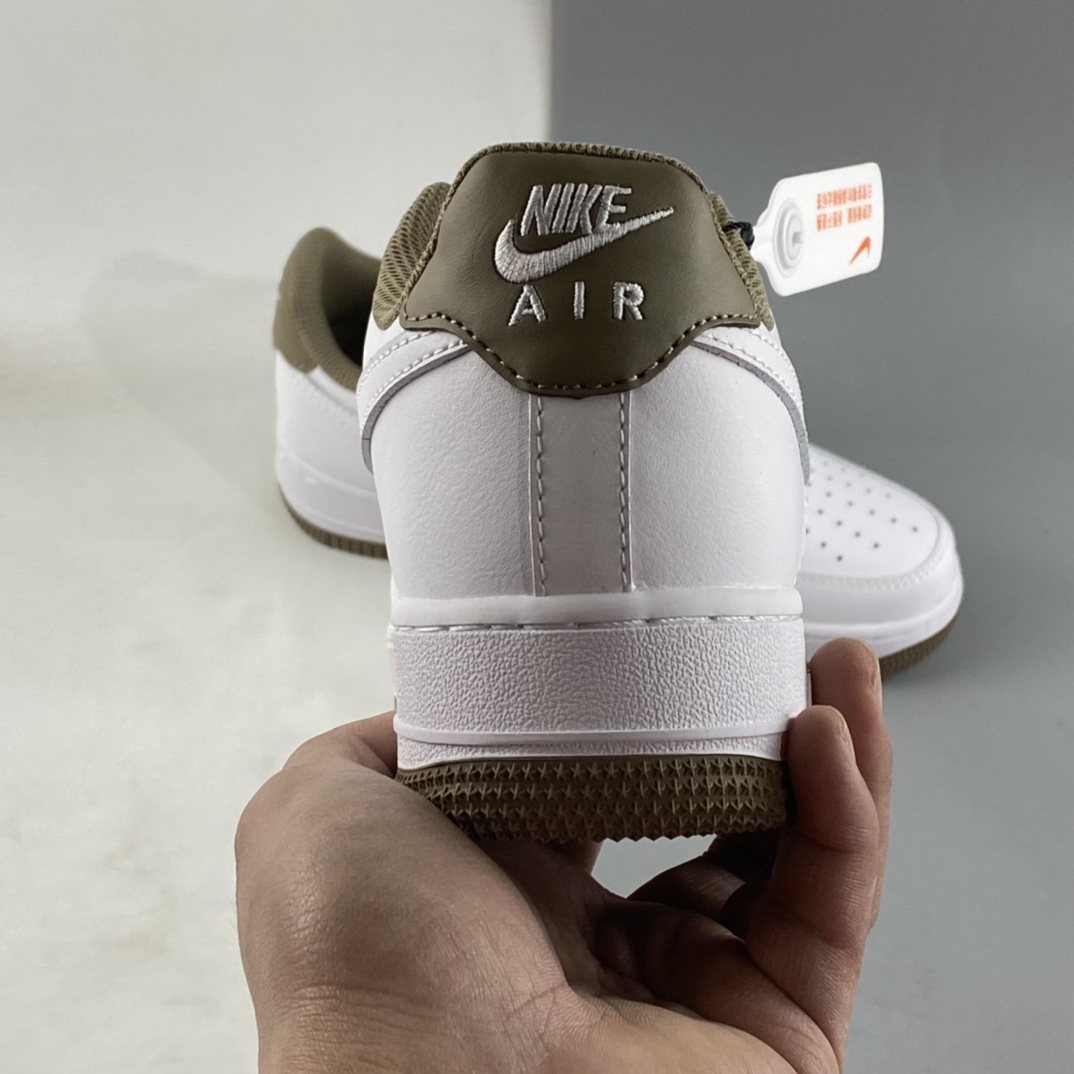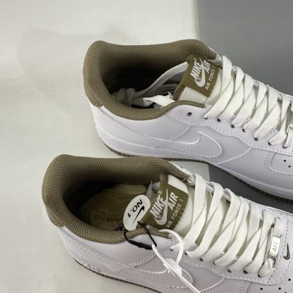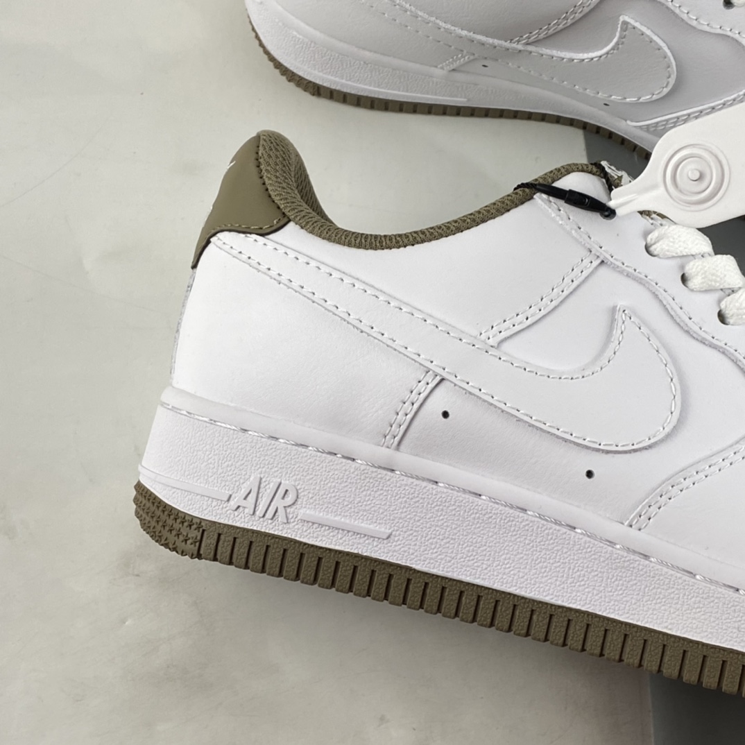 Like many a pair before it, This Nike Air Force 1 comes in a clean theme with White leather on the base.. Swooshes, overlays, and unders all feature said material, matching the identically-shaded laces and midsole. Dubraes, though, opt for a silver metallic finish, and the adjacent detailing — such as the heel tab, lining, tongue label, and outsole — indulge in a light olive coloring.