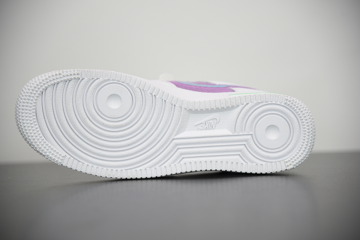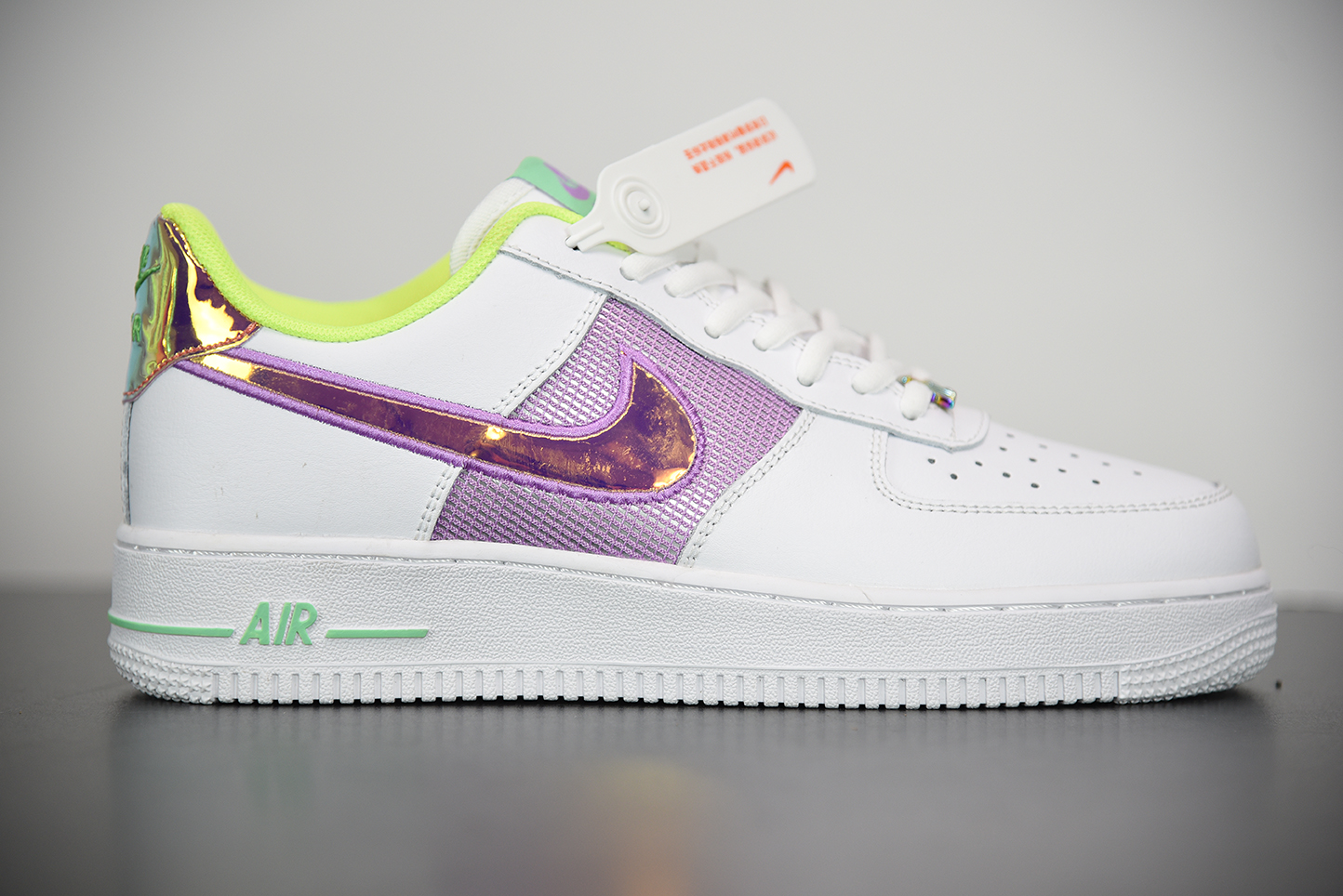 This offering of the Nike Air Force 1 features a White leather upper with Pink mesh side panels, Orange on the lateral Swoosh, and Yellow lining. Other details includes Green tongue tags and “AIR” branding on the midsole completed with an iridescent heel tab and medial Swoosh logo.