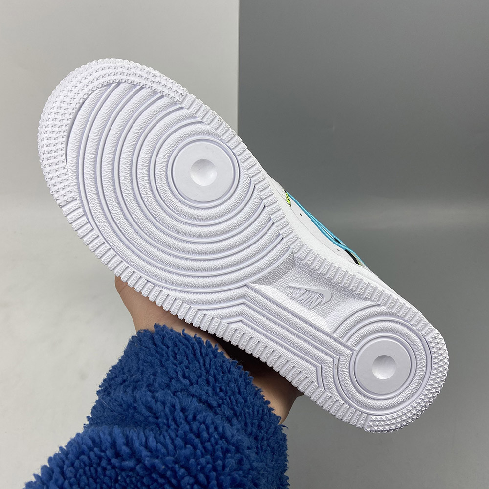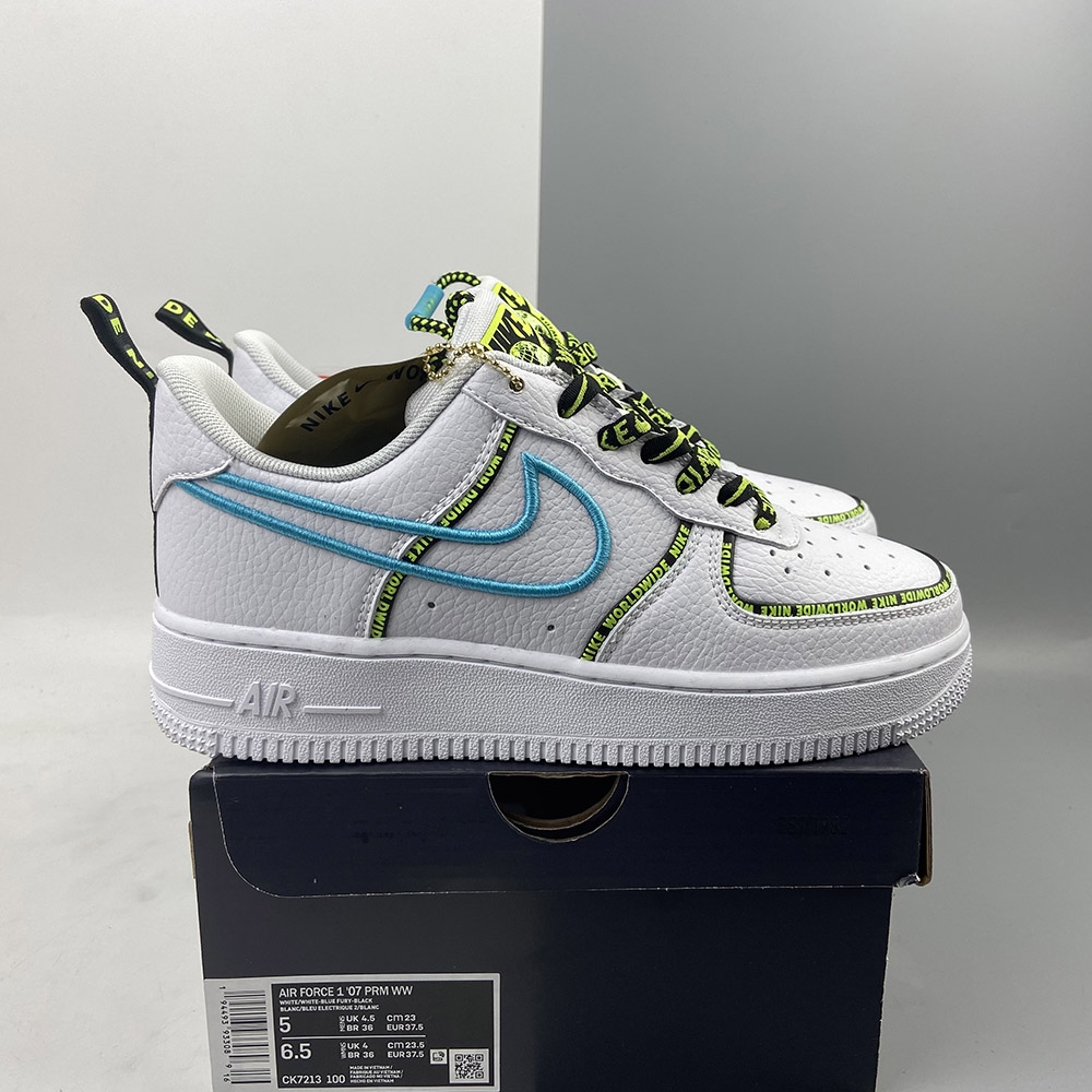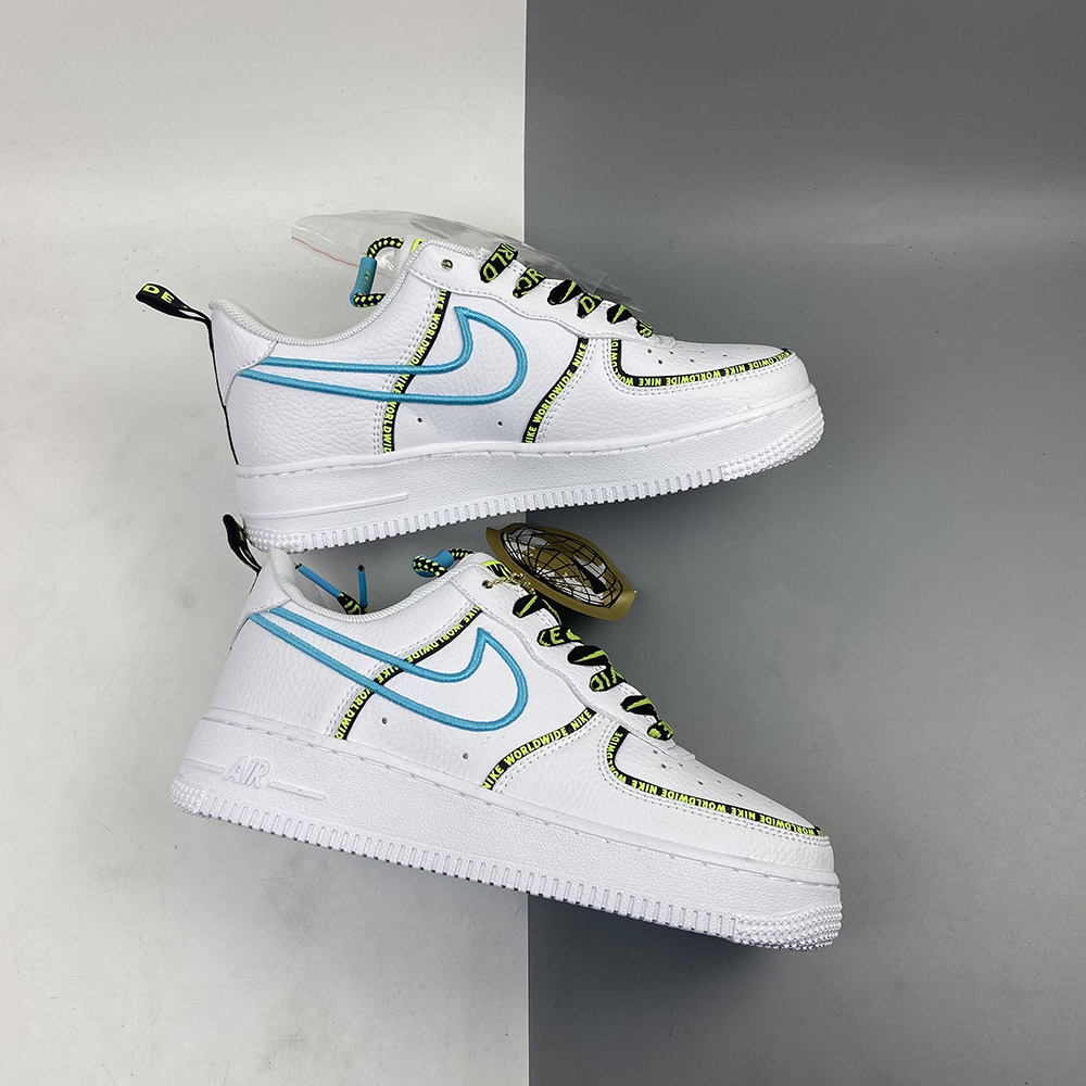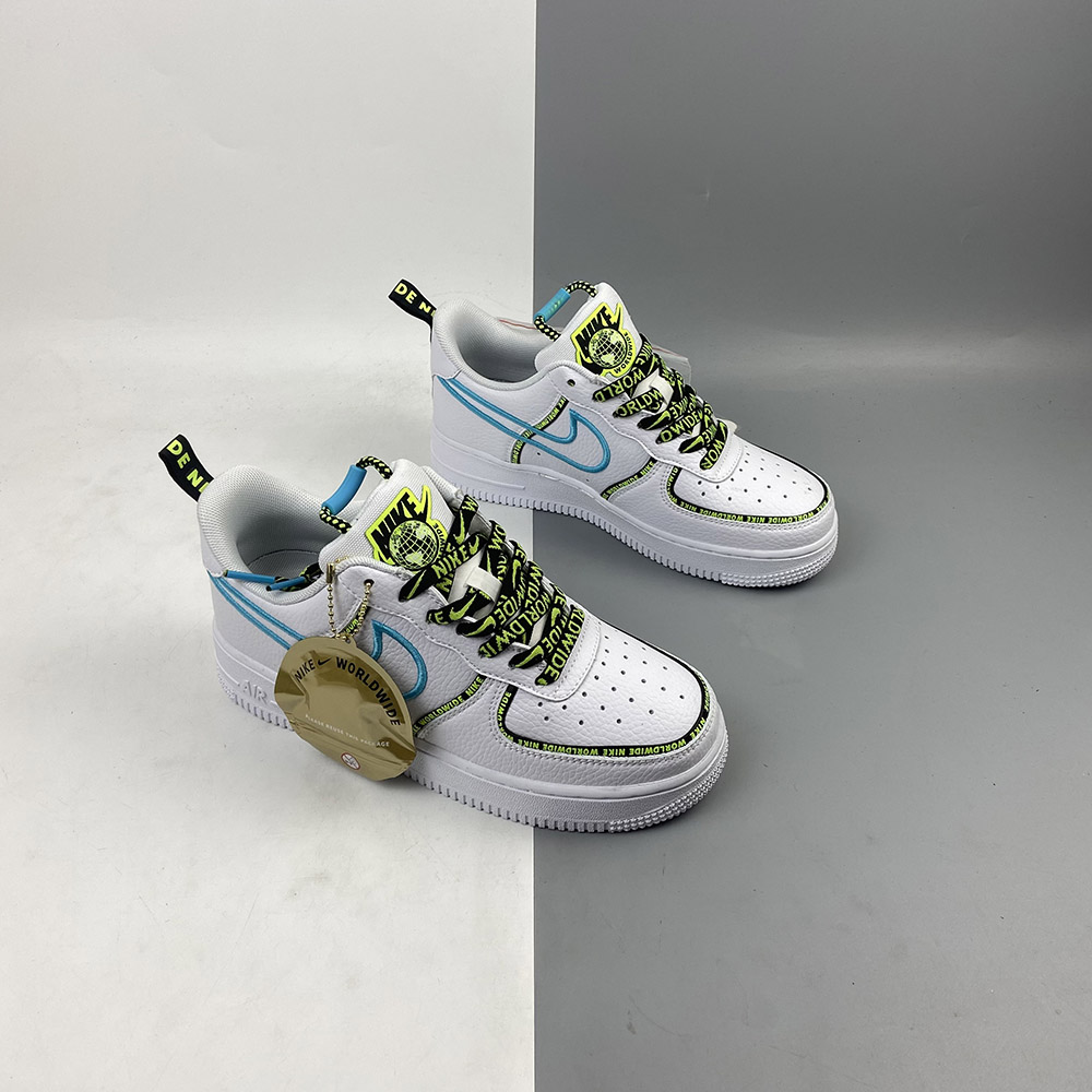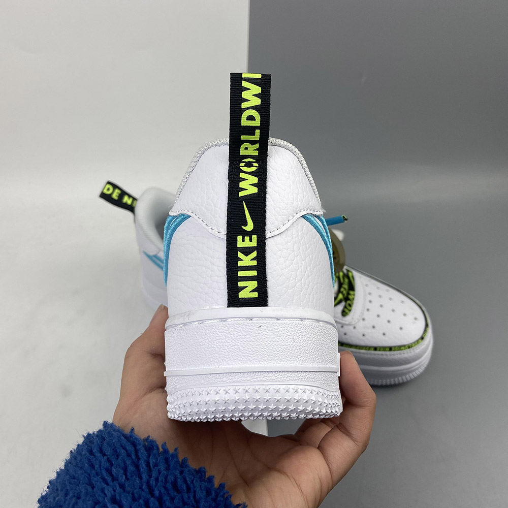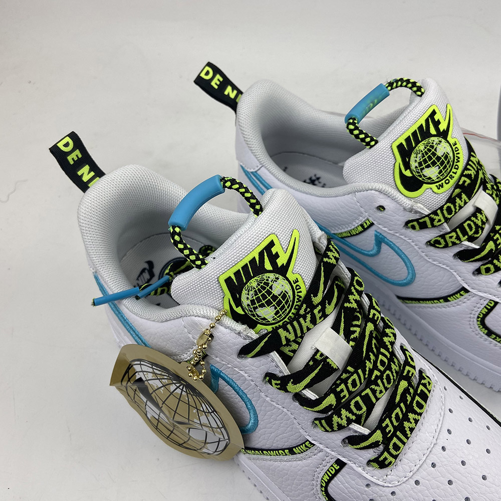 This offering of the Nike Air Force 1 features a White leather base with Blue contrasting accents atop a White rubber AF1 sole. A globe branded tongue with Worldwide text on the lateral forefoot completes the design.