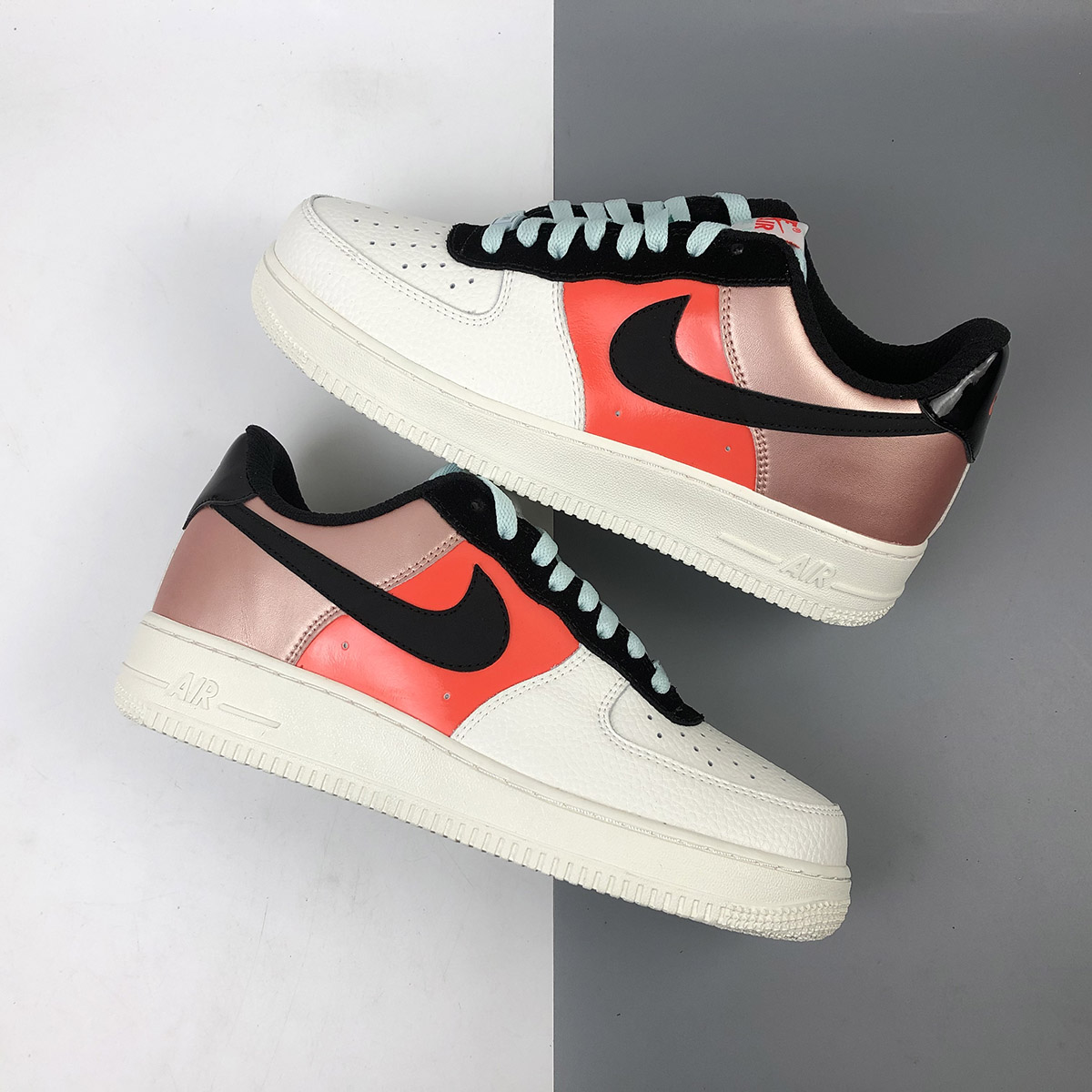 Dressed in a Metallic Red Bronze, Black, and Teal Tint. This offering of the Nike Air Force 1 Low features a Sail tumbled leather upper up front with a shiny leather material used on the side panels in Orange wrapped with Red Bronze around the heel. Black is used on the suede lacestays, nubuck Swooshes, patent leather heel and textile liner. Finishing off the design are Teal laces atop a Sail rubber outsole.