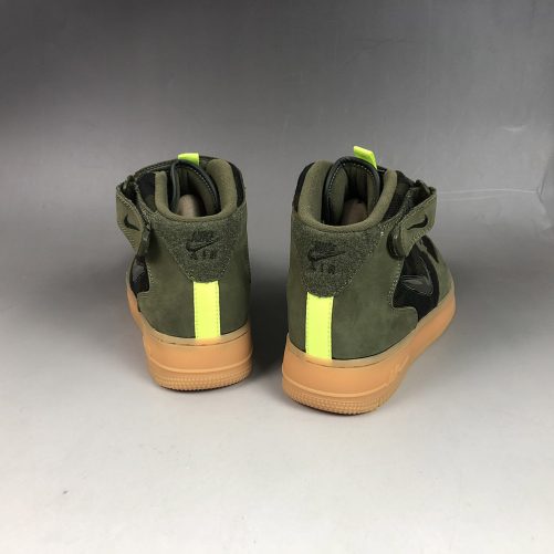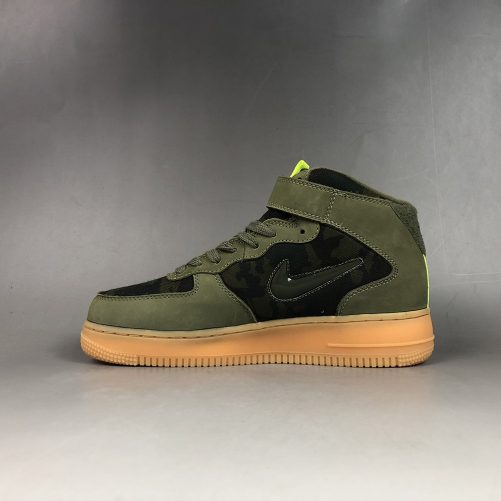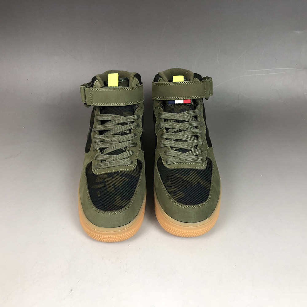 Dressed in a Medium Olive, Dark Army, and Volt color scheme. This Nike Air Force 1 Mid is highlighted with camouflage print, Volt accents and a removable French flag patches on the tongue. A Gum rubber Air Force 1 outsole completes the design.