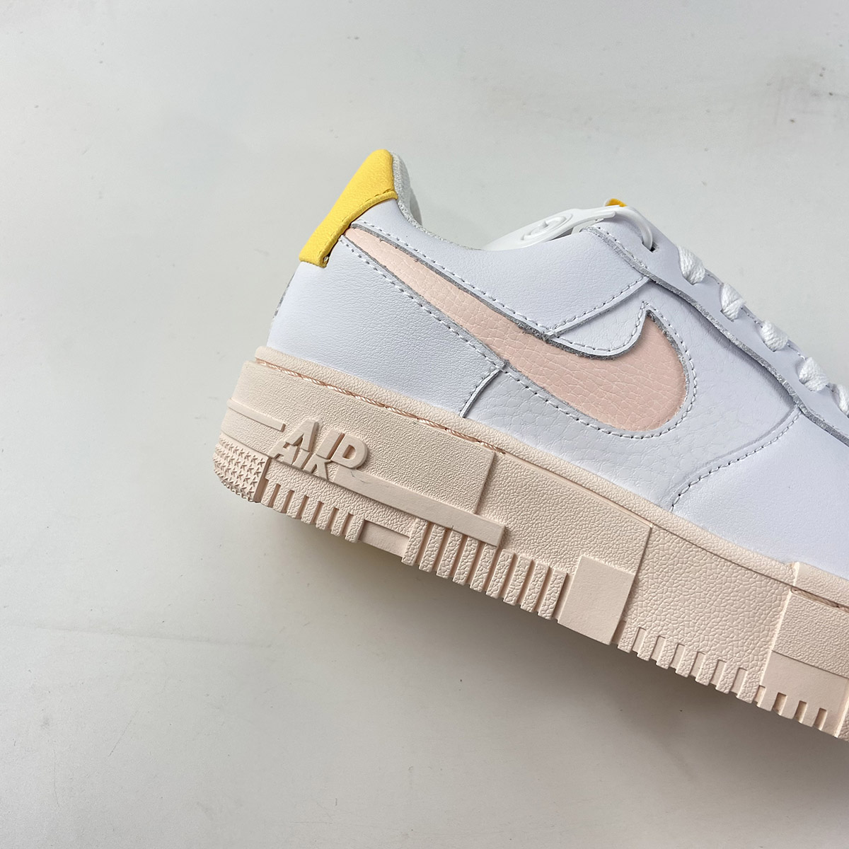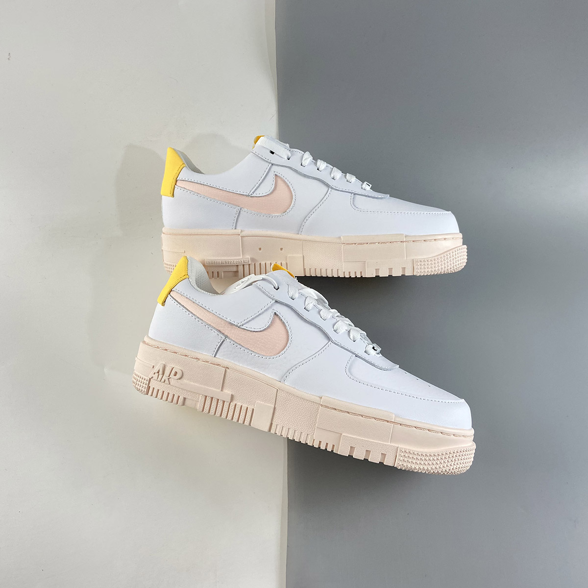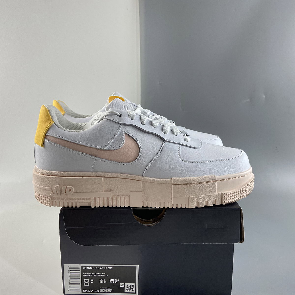 Dressed in a White, Arctic Orange, Sail, and Orange Pearl color scheme. This offering of the Nike Air Force 1 Pixel features a White leather upper with mesh tongues. Highlighting the shoe are the Orange hues on the tongues, rear overlays, cut-out Swooshes, and insoles. A Pinkish-colored rubber sole completes the design.