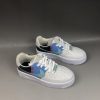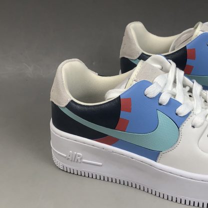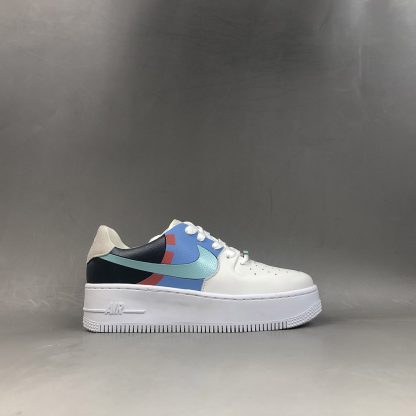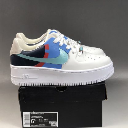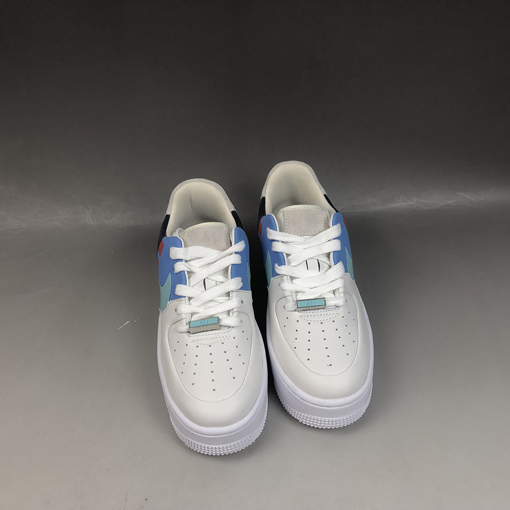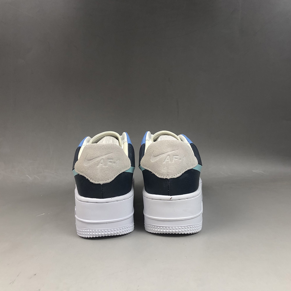 The next pair we have to showcase comes highlighted in White leather across the upper while Light Blue and Navy is seen by the heel with accents of Red. Following we have a pebbled leather, suede on the heel tabs, Turquoise Swoosh on the panels and a basketball court graphic on the insoles. Finishing the look is White on the platform midsole and rubber outsole.