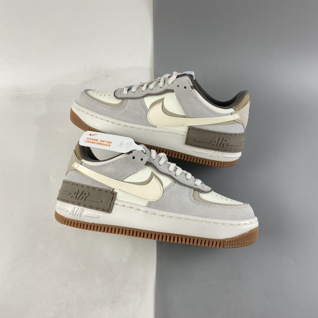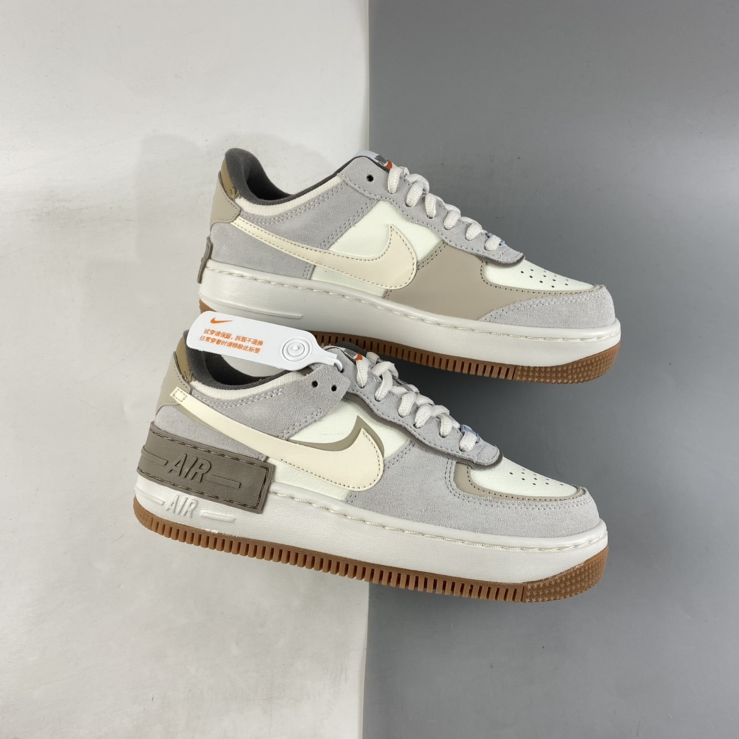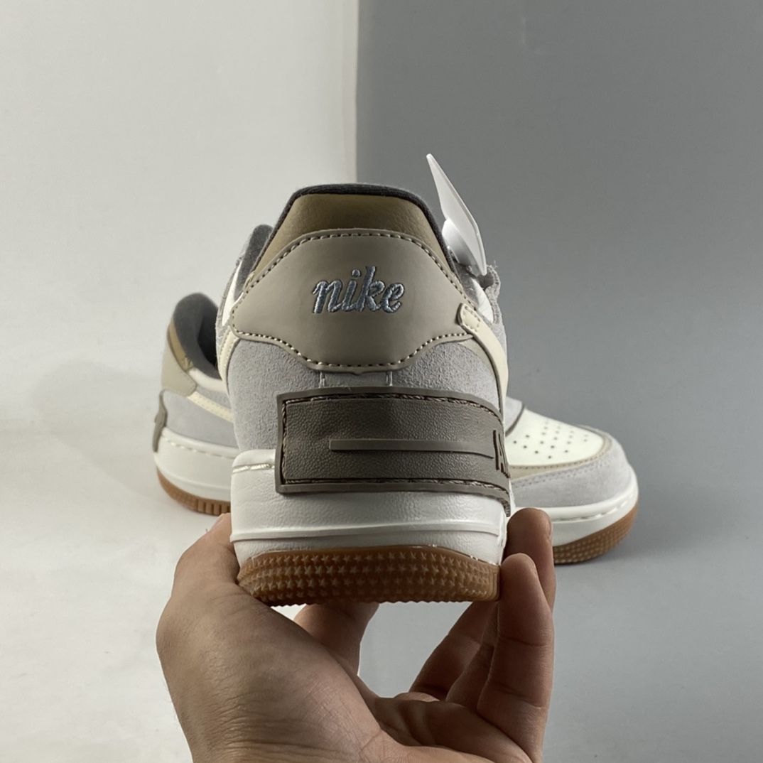 This offering of the Nike Air Force 1 Shadow sports a Sail and Pale Ivory color blocking constructed in a mix of leather and suede materials. Its signature double-layered rubber sole completes the design.