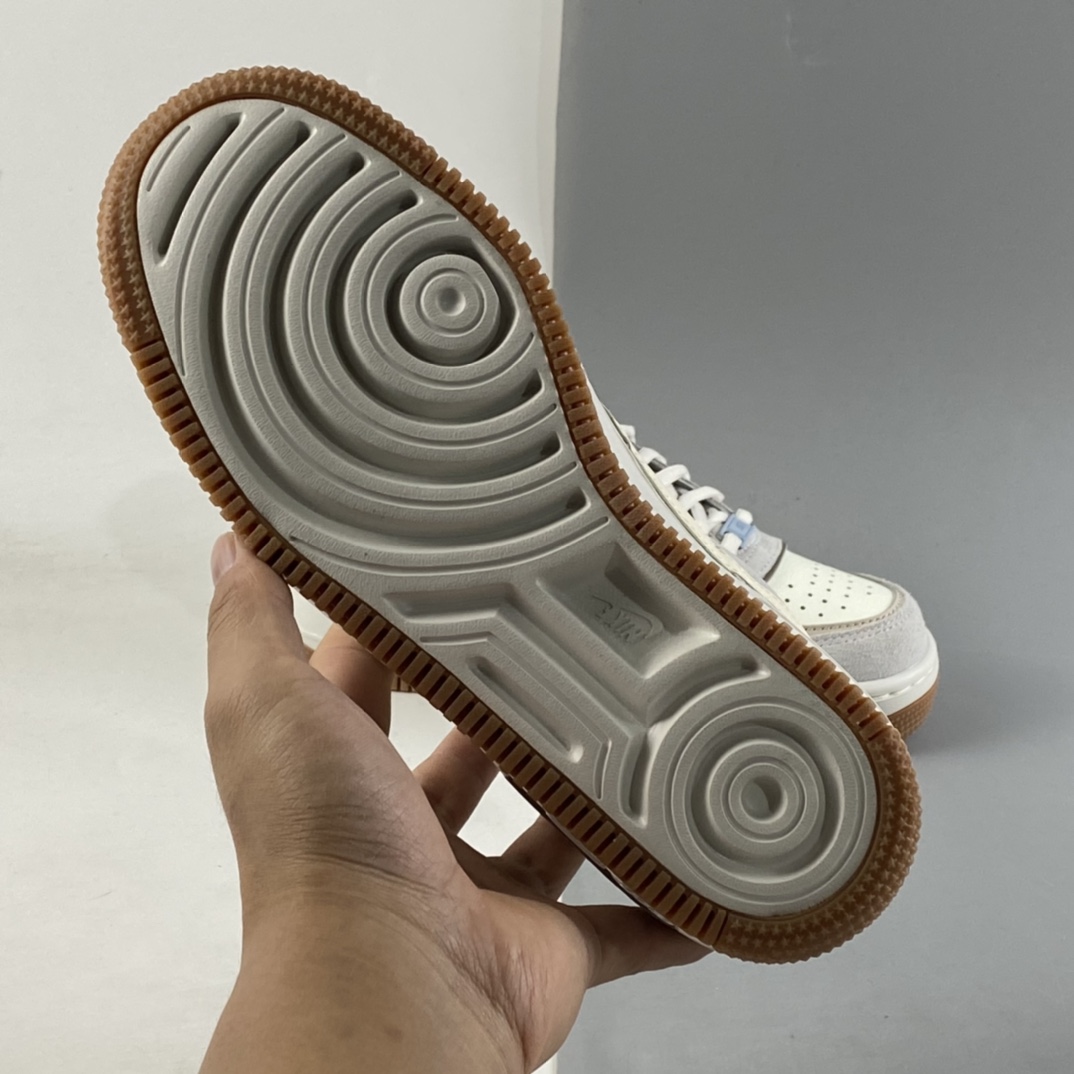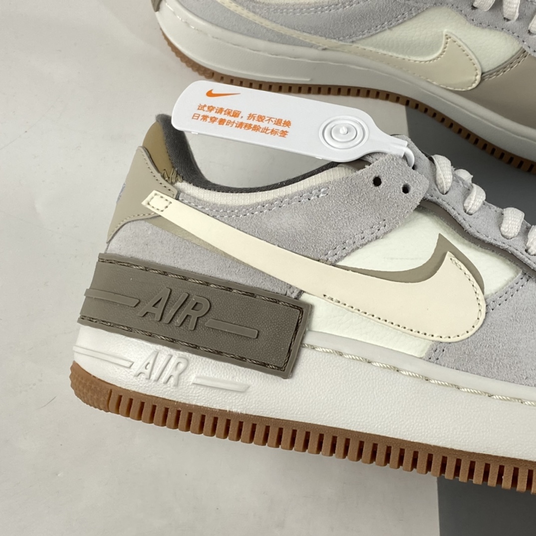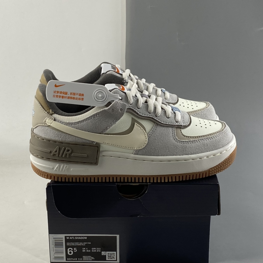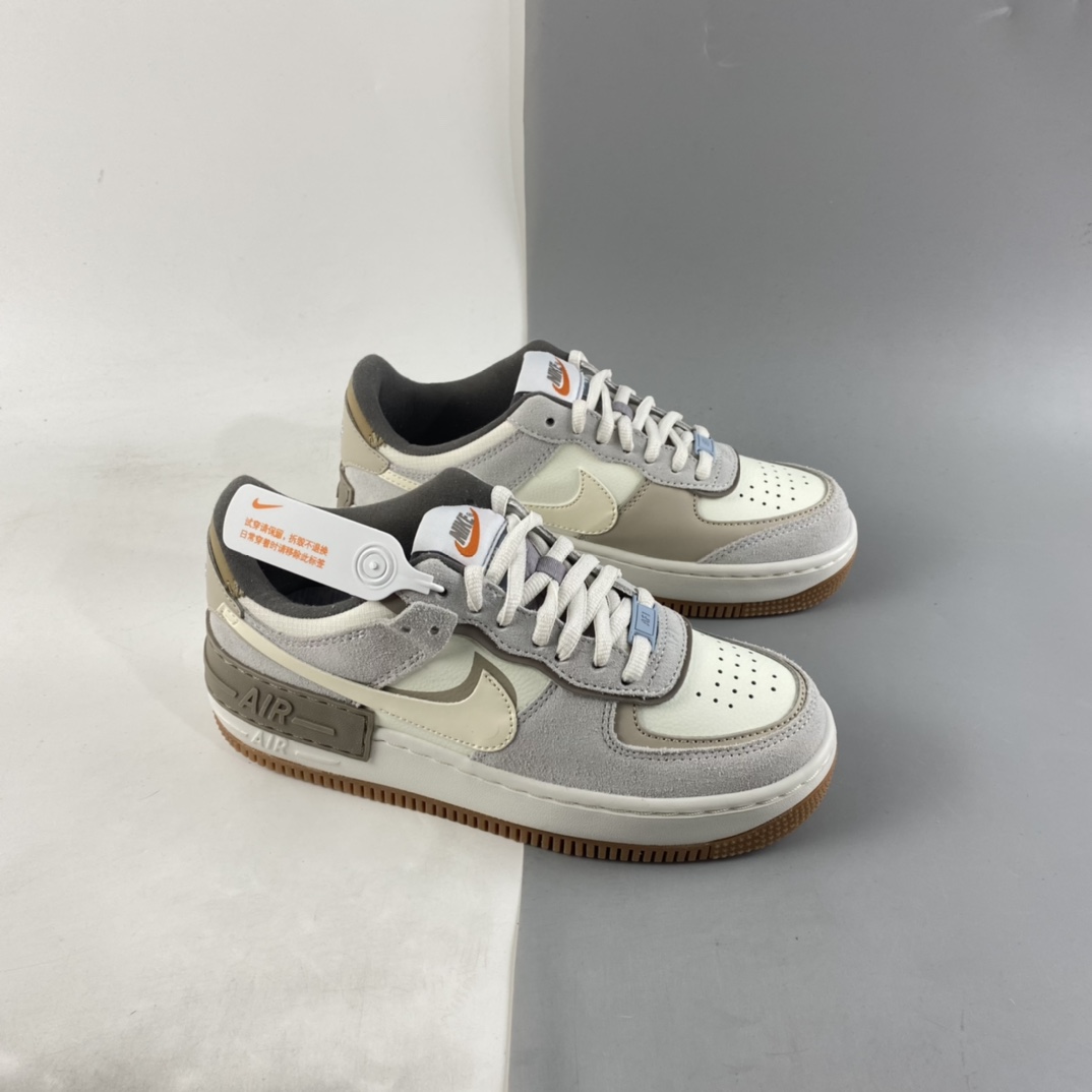 This offering of the Nike Air Force 1 Shadow sports a Sail and Pale Ivory color blocking constructed in a mix of leather and suede materials. Its signature double-layered rubber sole completes the design.