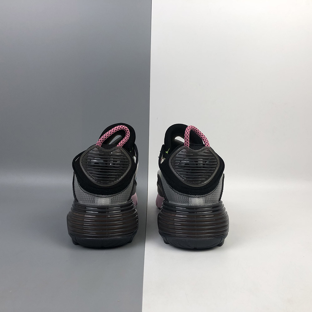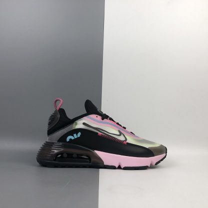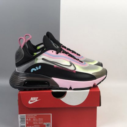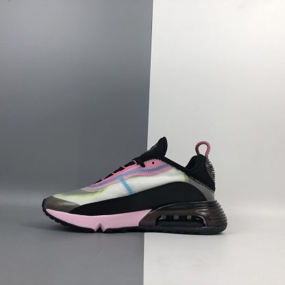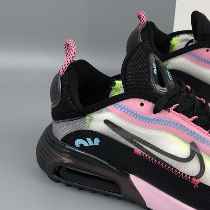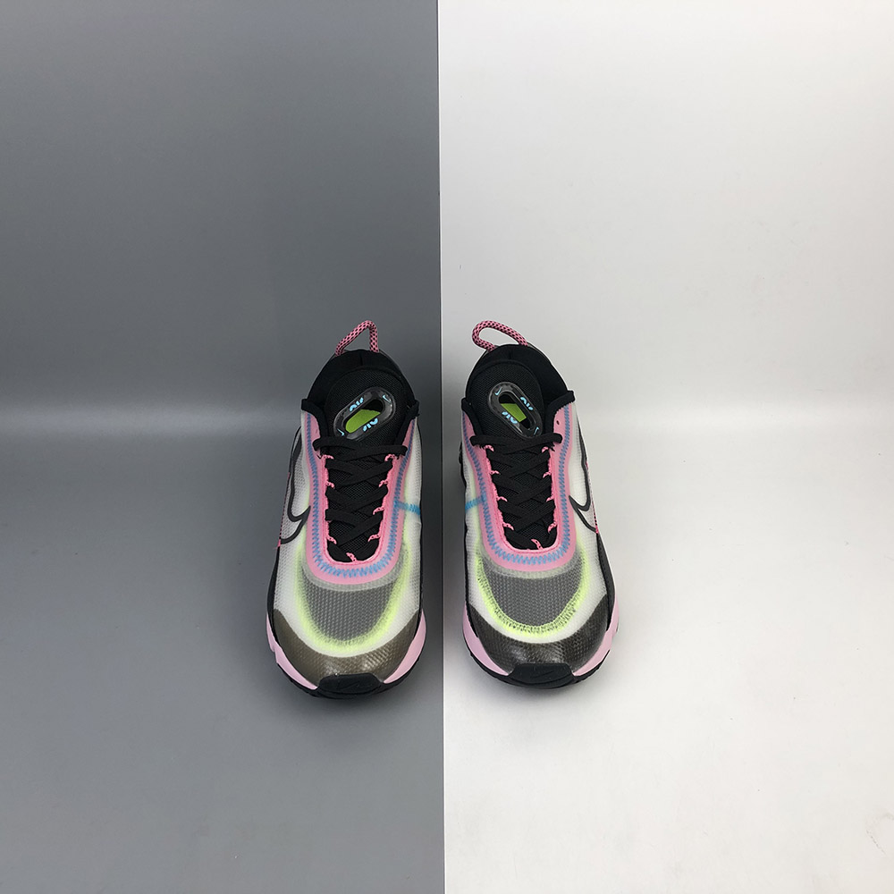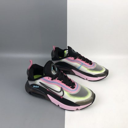 Dressed in a White, Black, Pink Foam, Lotus Pink, Volt, and Blue Gaze color scheme. This Nike Air Max 2090 features a transparent mesh upper with Black textile leather on the mudguards along with Black mesh on the tongues and heels. Highlighting the shoe are Pink, Volt, and Blue contrasting accents throughout completed with a Pink midsole and Black rubber outsole.