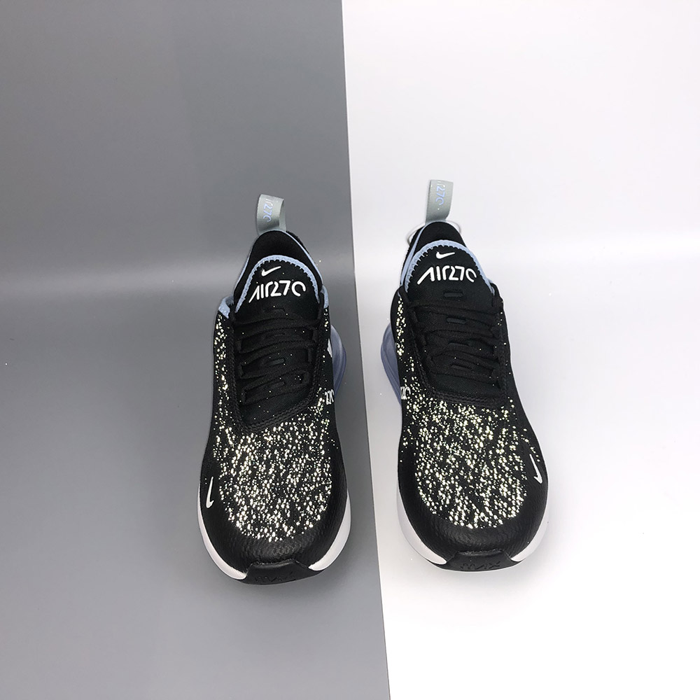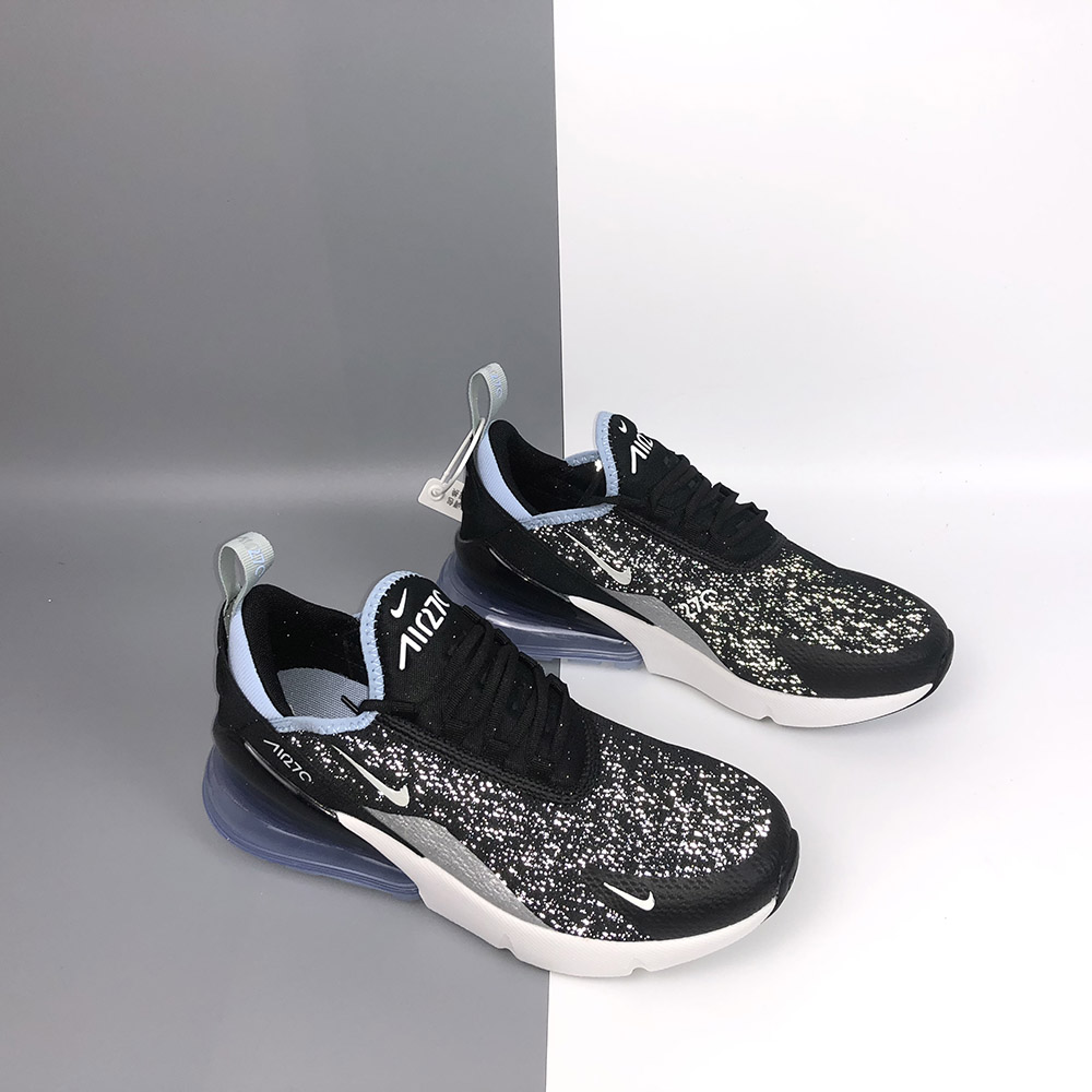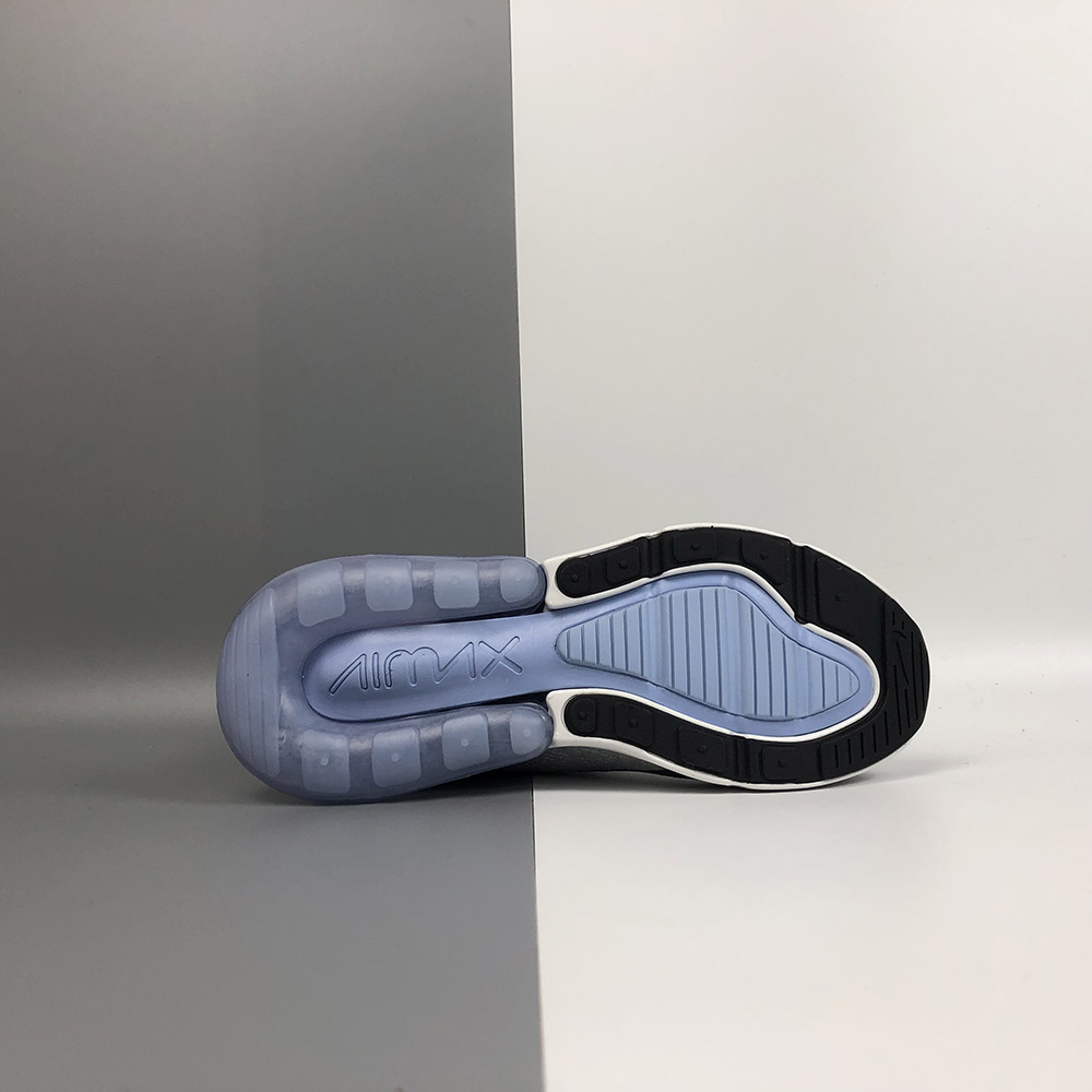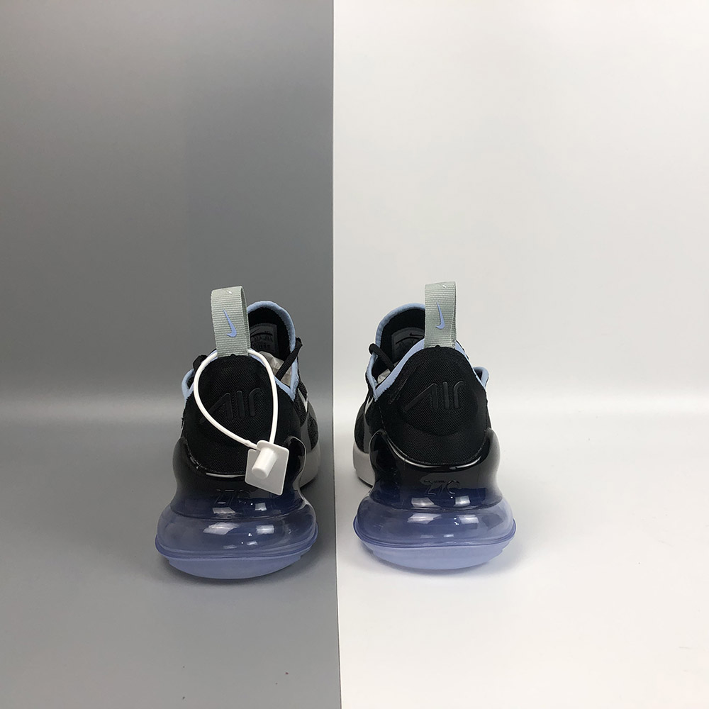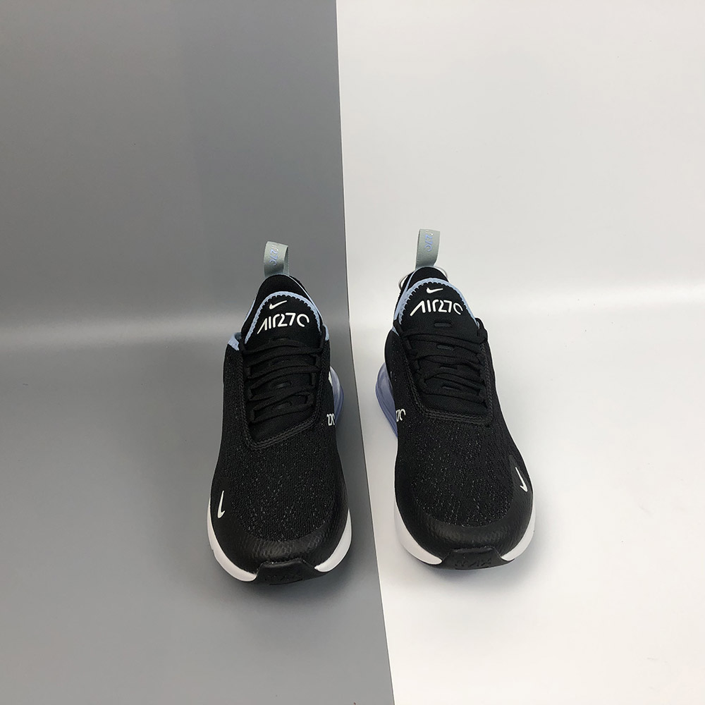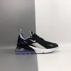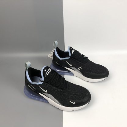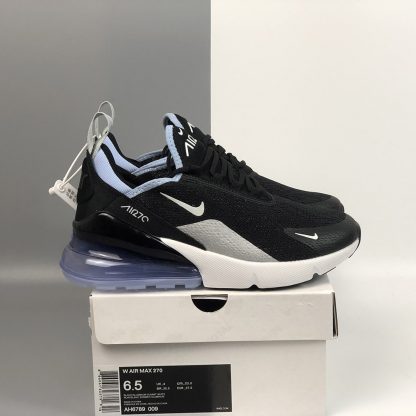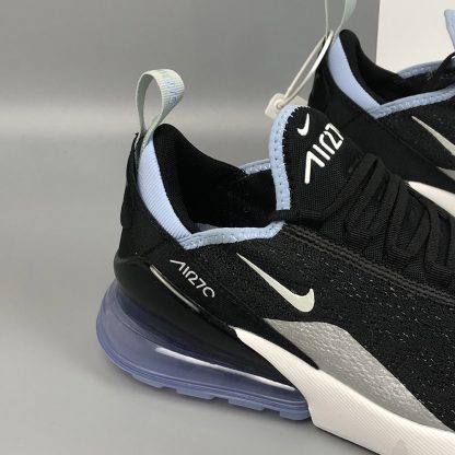 Dressed in a Black, Summit White, and Aluminum color scheme. This Nike Air Max 270 features a new Black mesh upper with White detailing and soft Aluminum Blue contrasting accents on the collar and heel bubble.