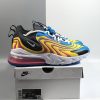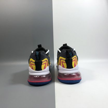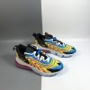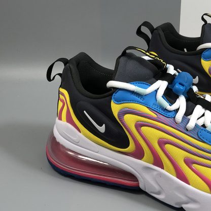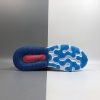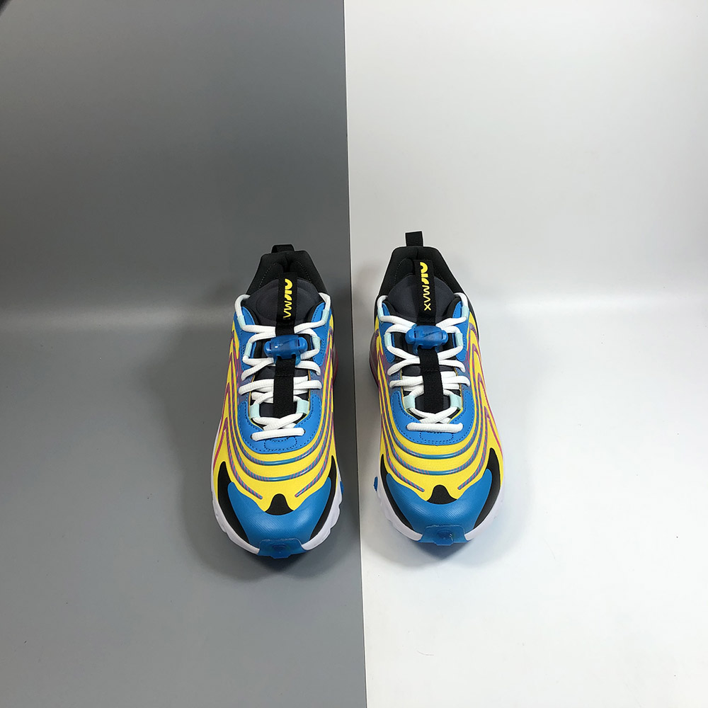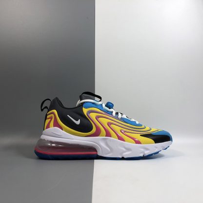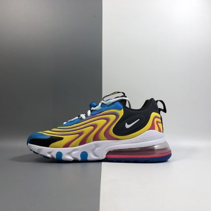 This offering of the shoe comes dressed in a laser Blue, White, and Anthracite color scheme. It features a Yellow mesh upper a new wavy plastic overlays paired with Blue and Pink contrasting accents throughout. A White React midsole, clear Air Max heel unit atop a Blue translucent outsole completes the design.