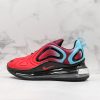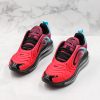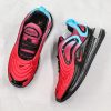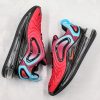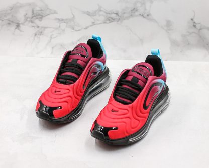 Nike’s Air Max 720 and gradient detailing certainly see eye-to-eye, as over its brief history on the market the 720 has already taken on a veritable medley of bold and colorful fades. Now, yet another pair has joined the eye-catching slate of offerings: a hot red to cool blue makeup. The toebox and forefoot are all high-temperature, but give way to a more gradual purplish red towards the midfoot before fading to chilled-out blue accents towards the collar and heel. Black trim and overlays provide further contrast, while branding is offered via an Air Max badge on the tongue and a red Swoosh on the black plastic midfoot clip. Down below, the 720’s signature bulbous cushioning unit mixes a clear bubble with red detailing, and a black outsole completes the look