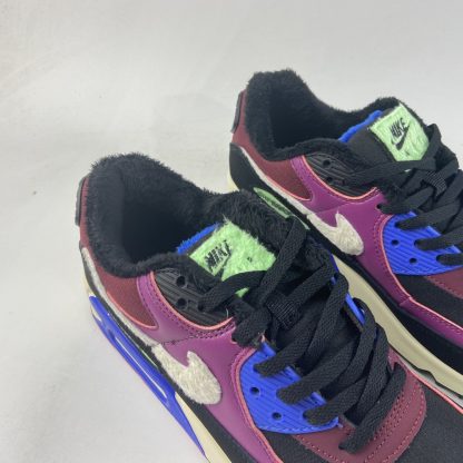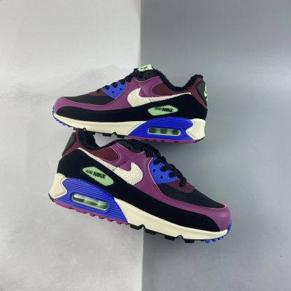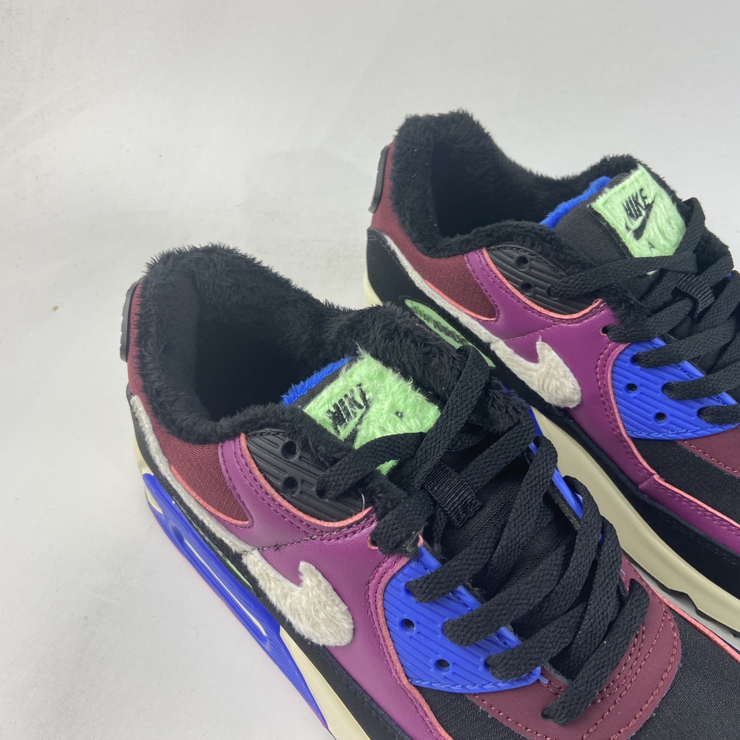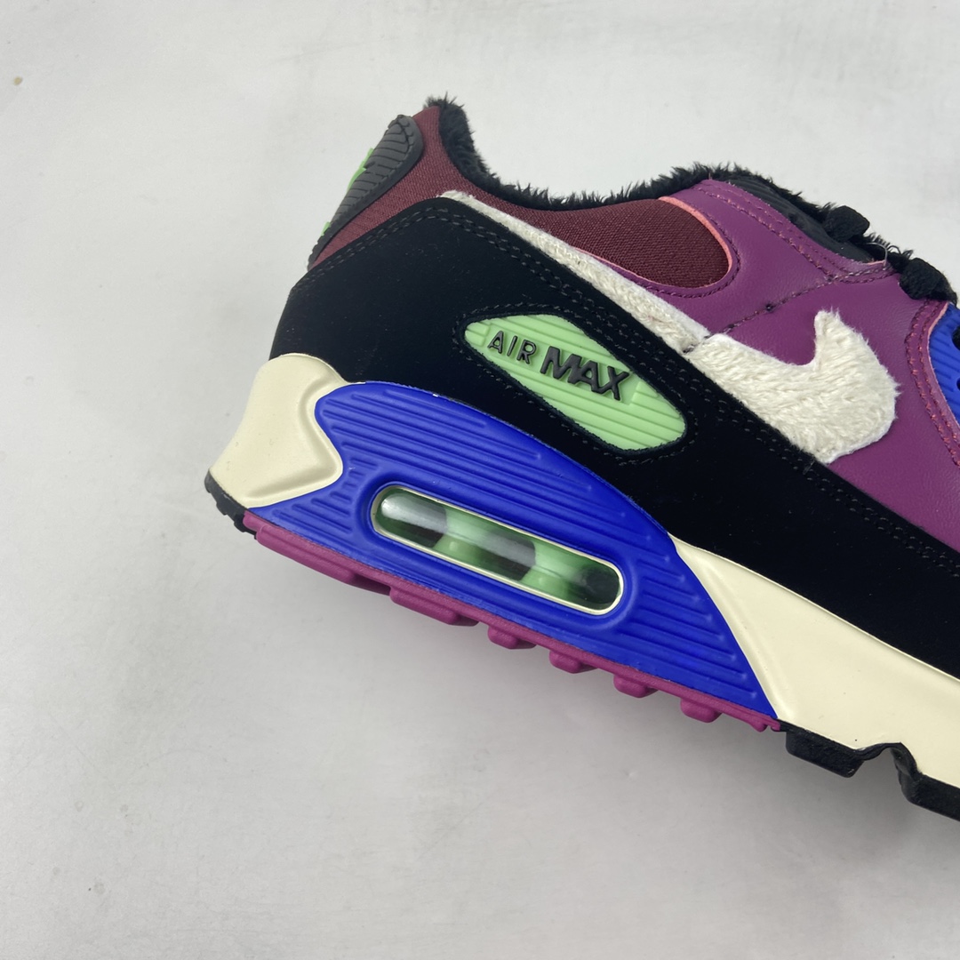 This edition of the Nike Air Max 90 comes constructed in a mix of ripstop, leather and suede covered in Purple, Blue and Lime Green color tones. Fur material is used on the tongues, Swoosh and inner lining to keep your feet warm during the colder months. An aged-look midsole completes the design.