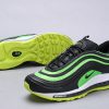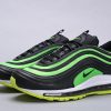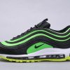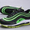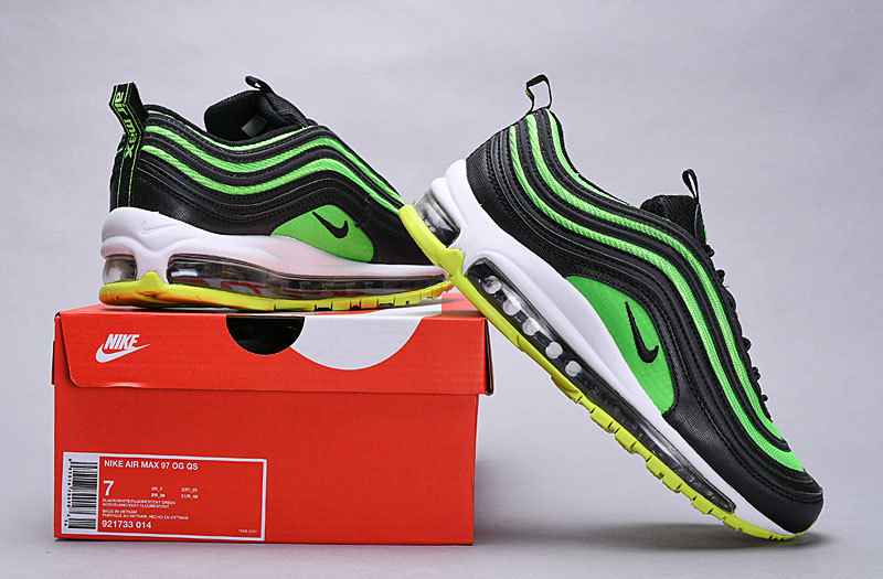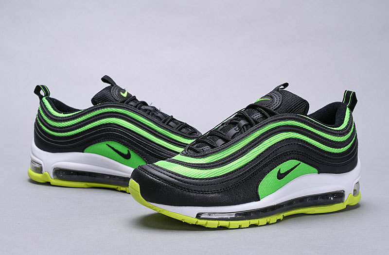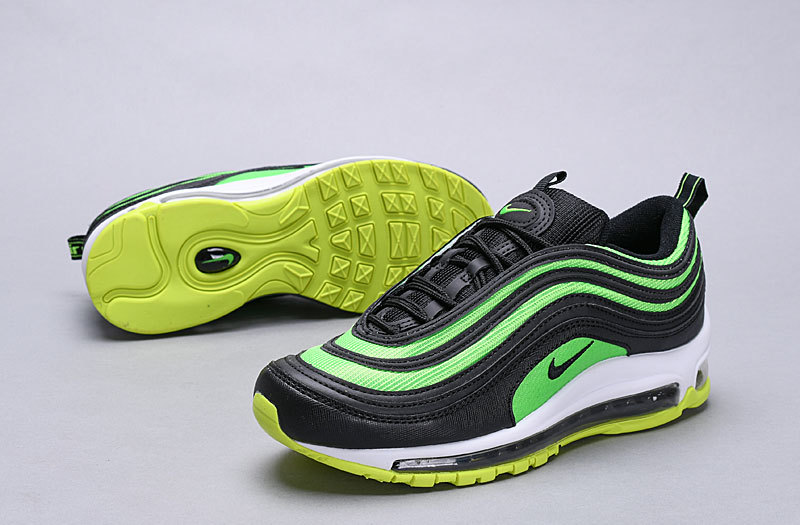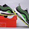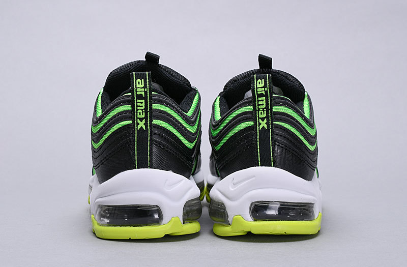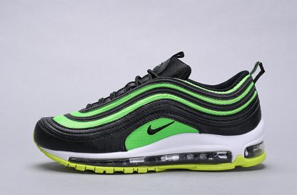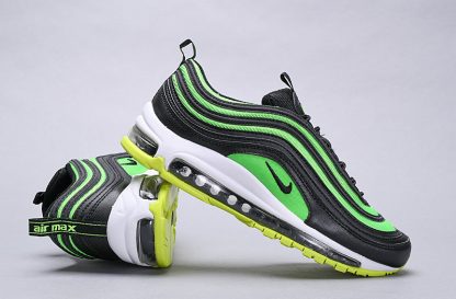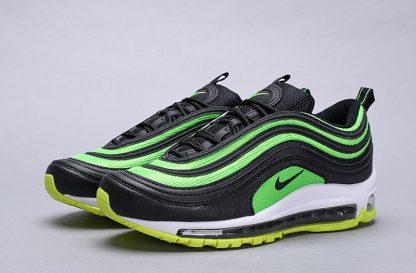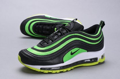 This Nike Air Max 97 features a Black leather and synthetic material covering its upper, while Neon Green brightens things up on the underlays. A clean White midsole atop a Green rubber outsole completes the design.