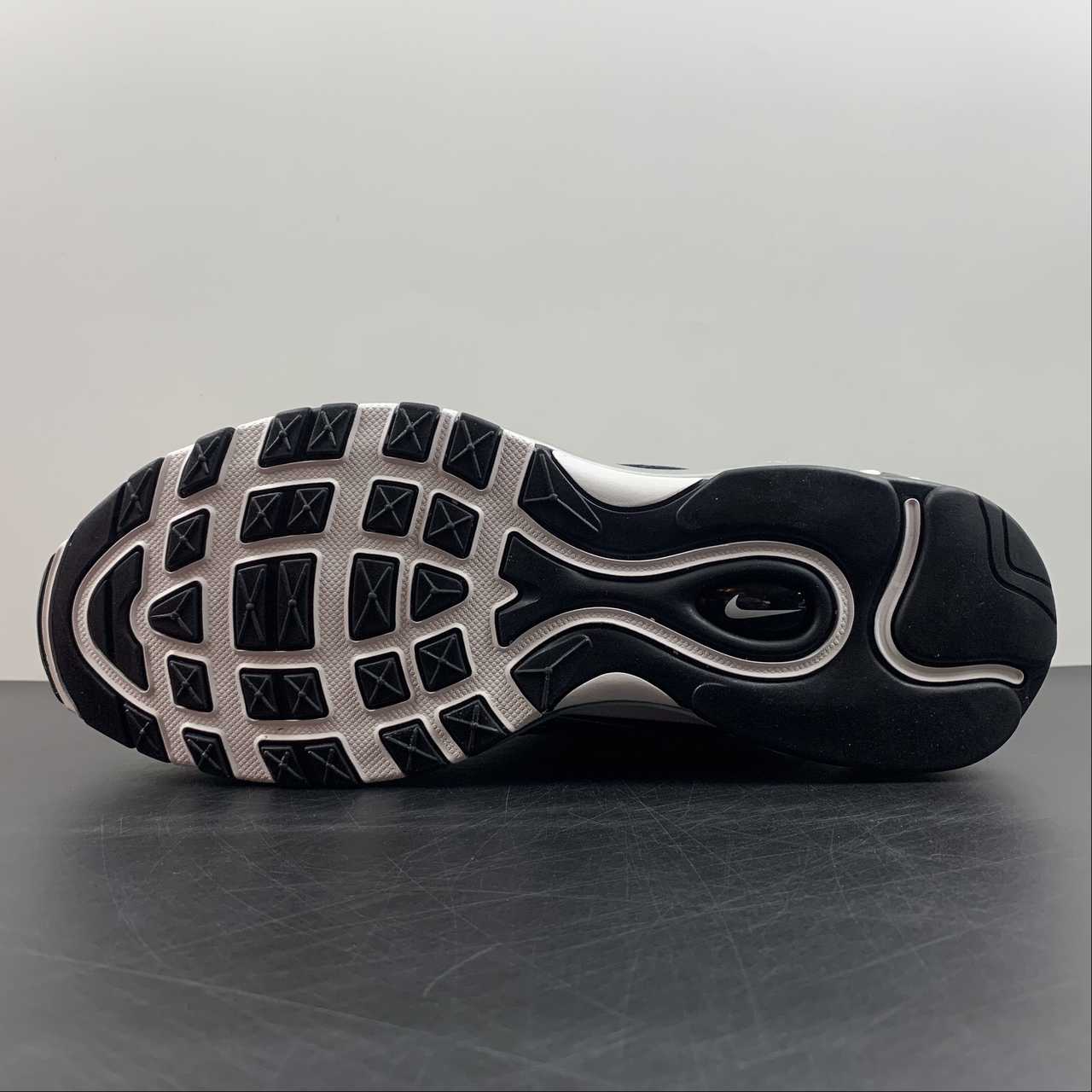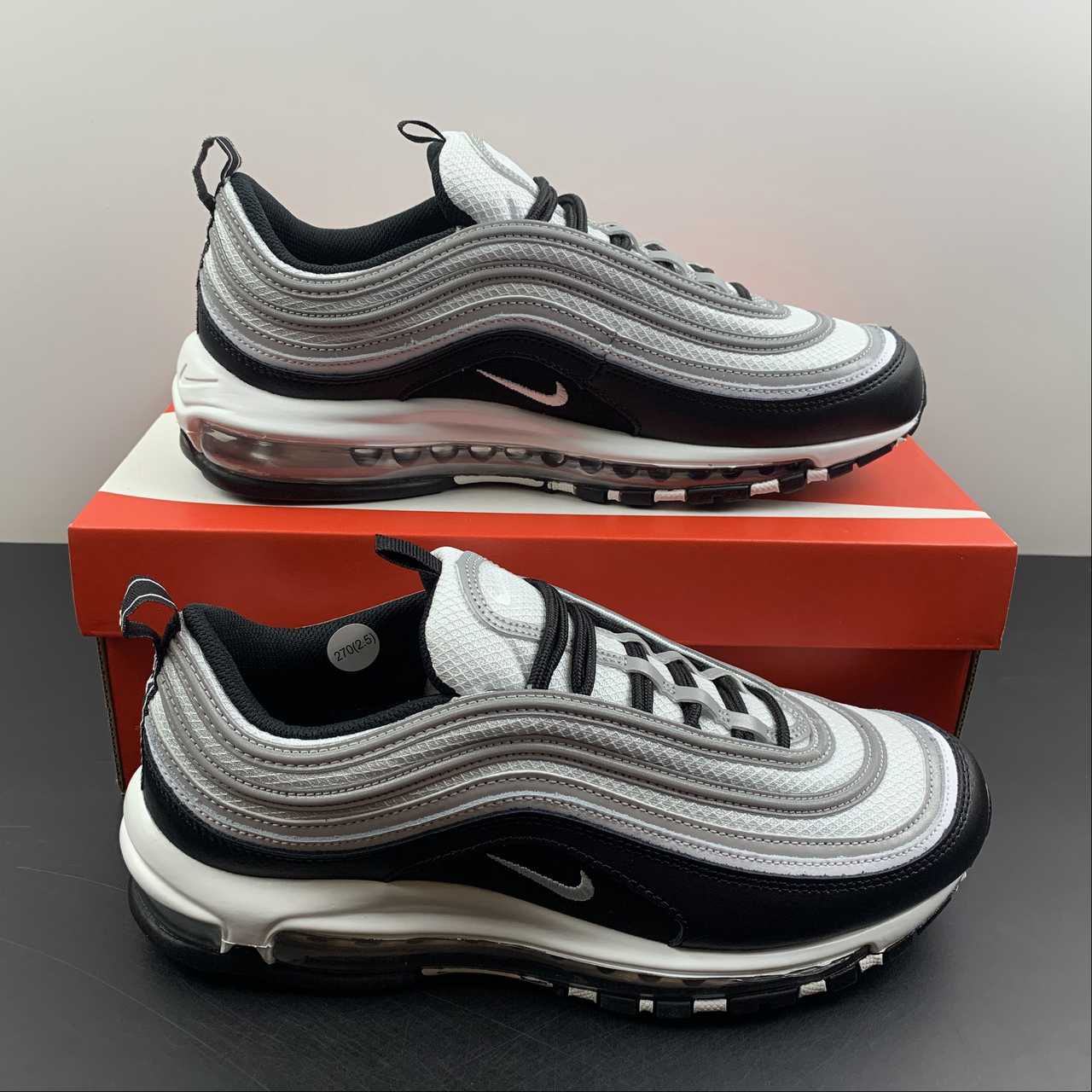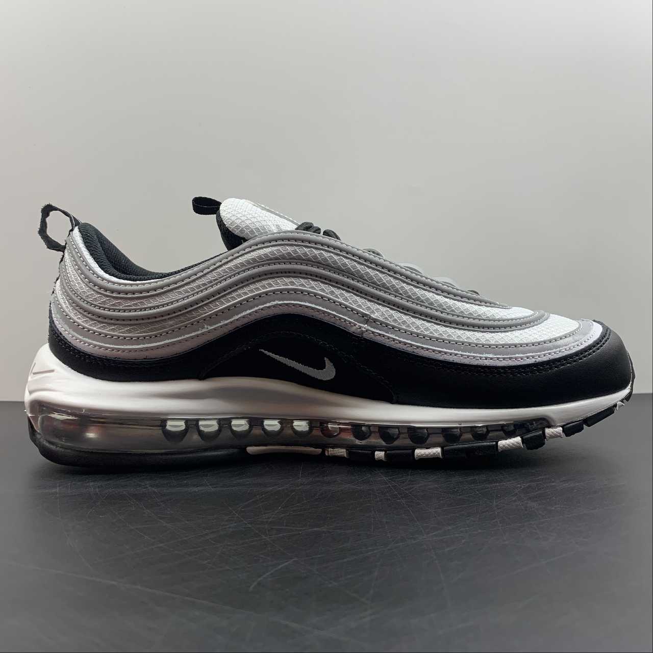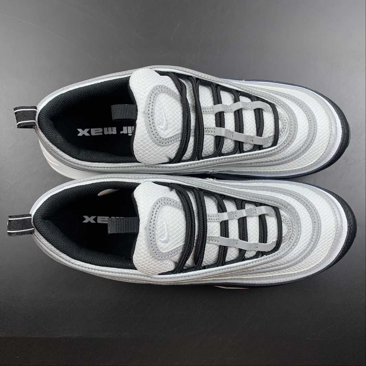 Set to arrive later this year is this simple black and white colorway of the 97, capturing the trendy “Panda” look that dominated the Dunk Low circuit. However, these feature the trademark reflective silver tracks on the upper as well as the tongue, adding high visibility when hit with flash.