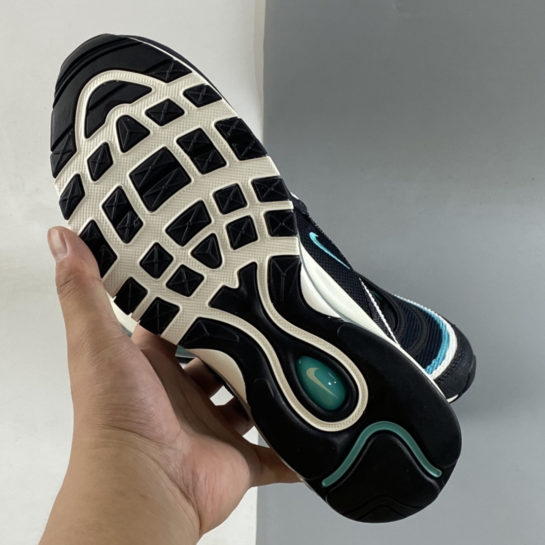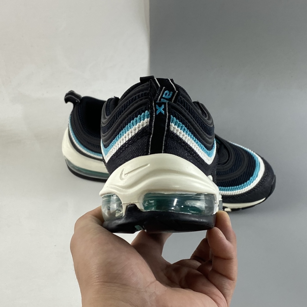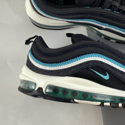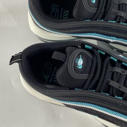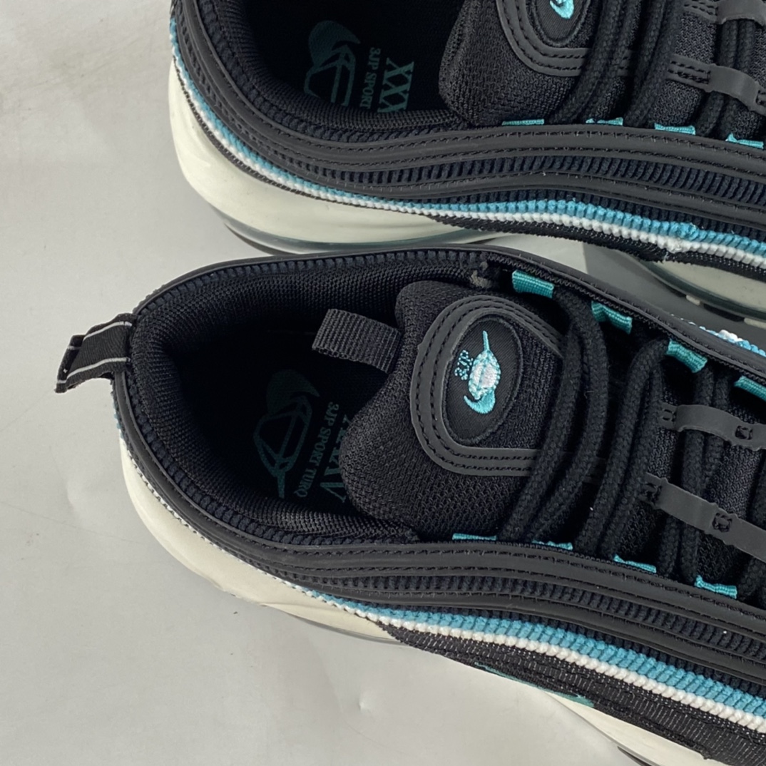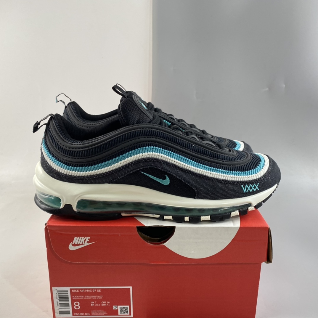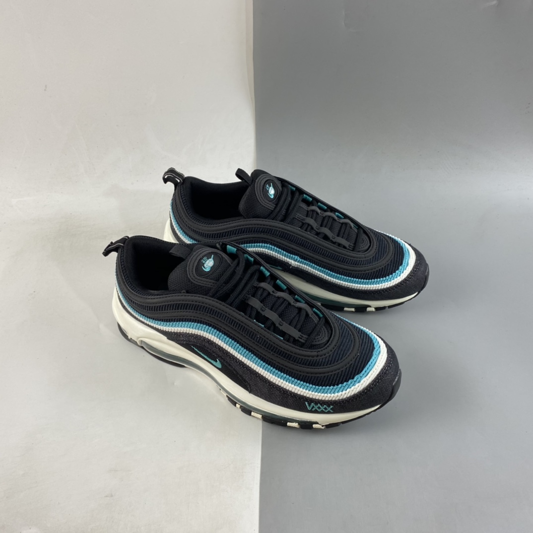 we get an official look at the upcoming Nike Air Max 97 SE “Sport Turbo” which features a black mesh base accented with denim and corduroy overlays. Elsewhere contrasting “Turquoise” appears mixed into the wavy overlays, mini Swoosh insignia, and special “XXXV” emblazoned on the forefoot and insoles. Final details include the 3M reflective hits, the “3JP Sport Turbo” branding, and lastly the white midsole and black outsole combo.
