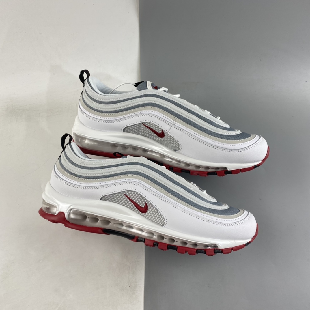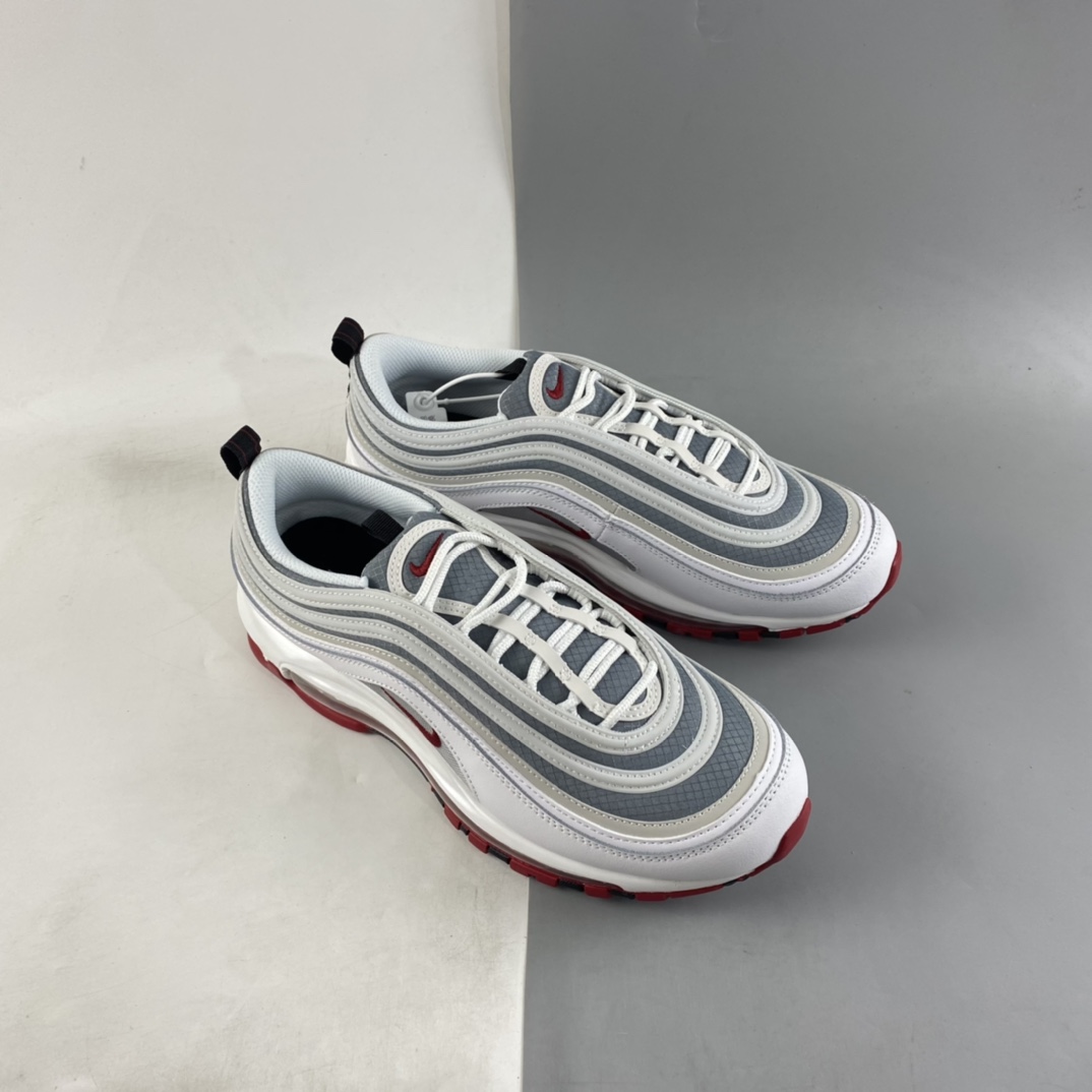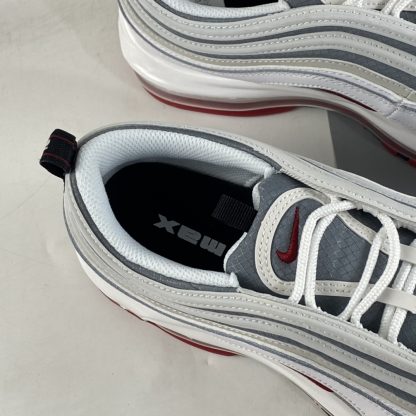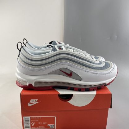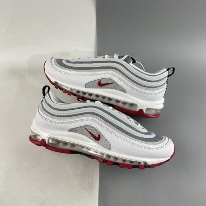 This offering of the Nike Air Max 97 comes dressed in a mix of White, Grey, and Red color tones giving off a “White Bullet” aesthetic. It features a Grey mesh base with White leather overlays with Red accents on the branded areas. A White midsole atop a Red/Black rubber outsole completes the design.