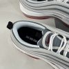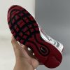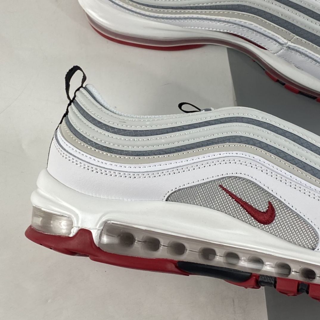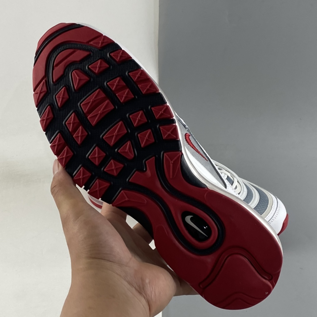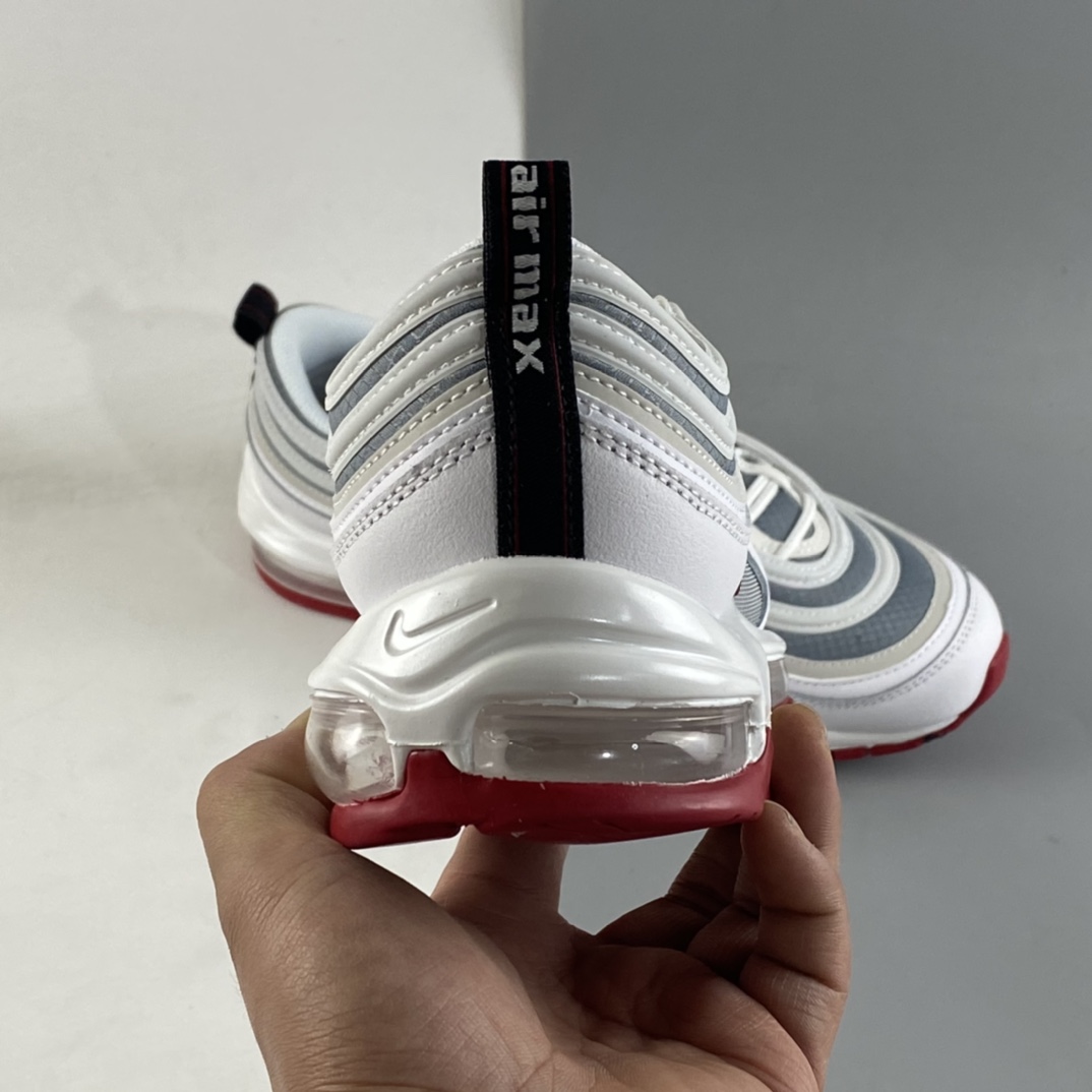 This offering of the Nike Air Max 97 comes dressed in a mix of White, Grey, and Red color tones giving off a “White Bullet” aesthetic. It features a Grey mesh base with White leather overlays with Red accents on the branded areas. A White midsole atop a Red/Black rubber outsole completes the design.