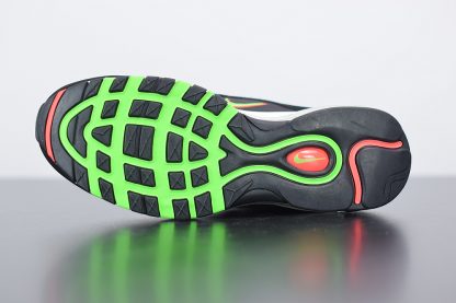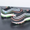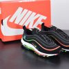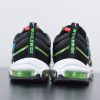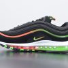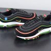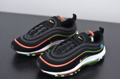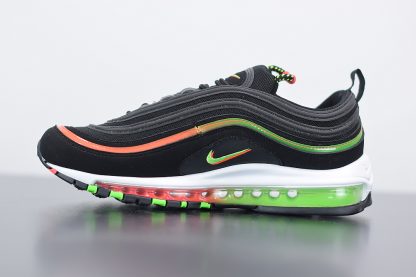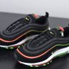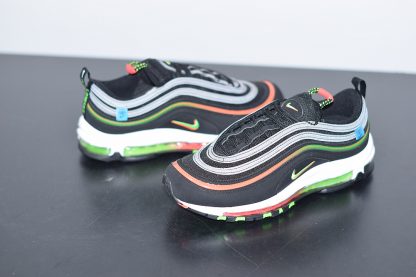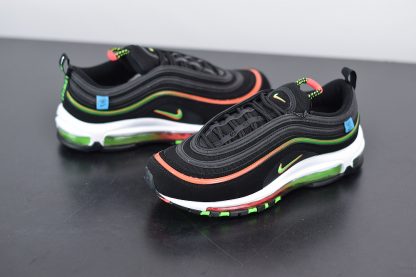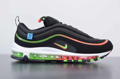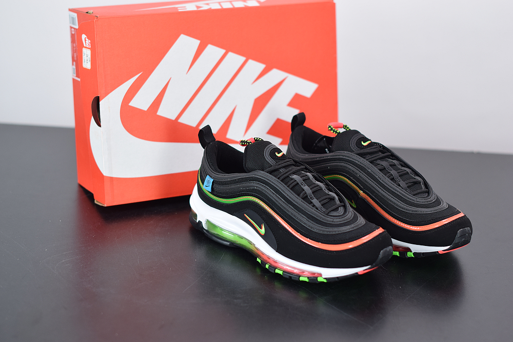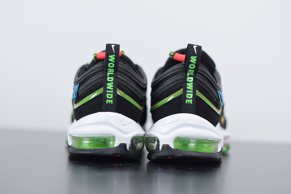 This offering of the Nike Air Max 97 features a Black upper paired with Crimson and Green Strike contrasting accents with a Blue Fury tag on the lateral and “Worldwide” text on the Black heel tab and insole.