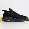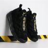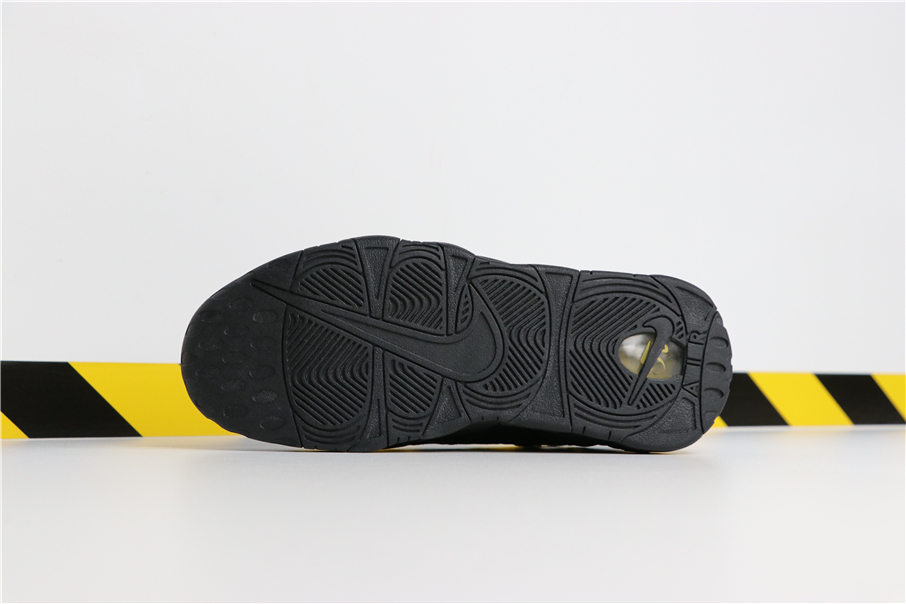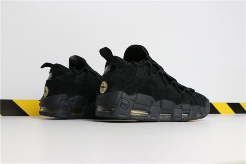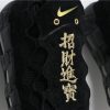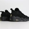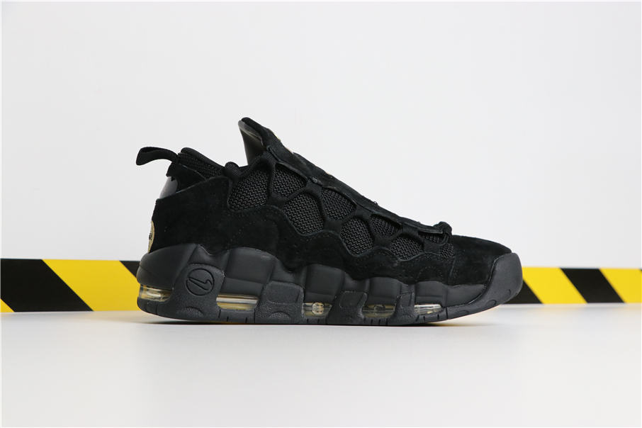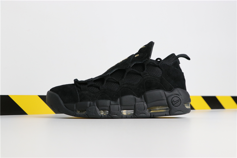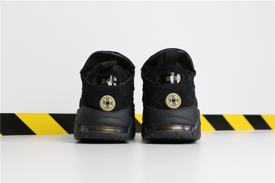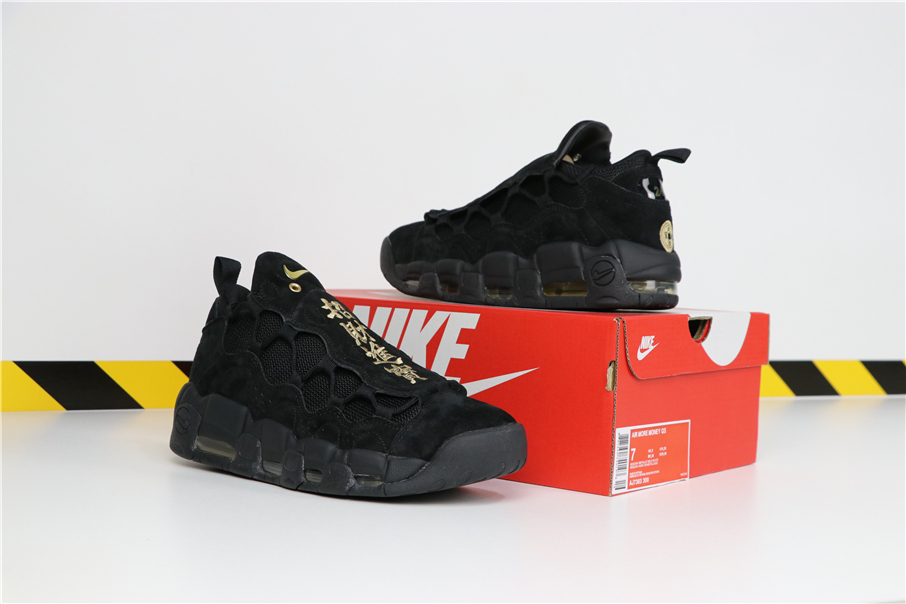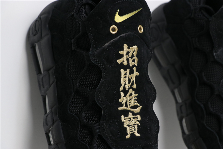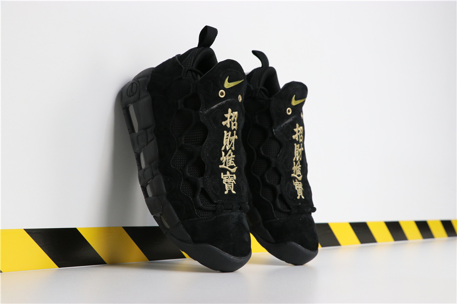 This iteration of the Nike Air More Money features a Black nubuck and mesh upper highlighted with Metallic Gold Chinese branding on the shrouds and heel. A Gold foil insole, solid Black rubber outsole and a blank added shroud completes the design.