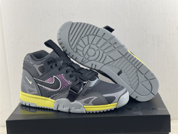 In addition to original colorways, the 1987 classic is set to launch in modern-day “Honeydew” and “Dark Smoke Grey” styles – both atop the silhouette’s “Utility” variant. Lockdown straps across the forefoot are giving an outdoorsy, rugged aesthetic accomplished by a plastic buckle and canvas strap. High-quality leather panels throughout the upper are accompanied by a plethora of reflective strips, which follow curved shapes reminiscent of that produced by the experimental Nike Alpha Project; a multi-color gradient finish is also applied to the non-standard mesh panels at the mid-foot, further helping create a fun update to the decades-old cross-training sneaker. Sole units aren’t reworked with Nike React foam or a trail-ready outsole, but midsoles are given an all-yellow look that seemingly taps into the “Neo-Vintage” trend that’s taken over social media feeds over the last year. Lastly, the black and greyscale-covered Air Trainer 1 features a robust pull tab at the tongue, which will surely lead some consumers to take the shoes on excursions through nature.