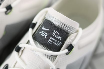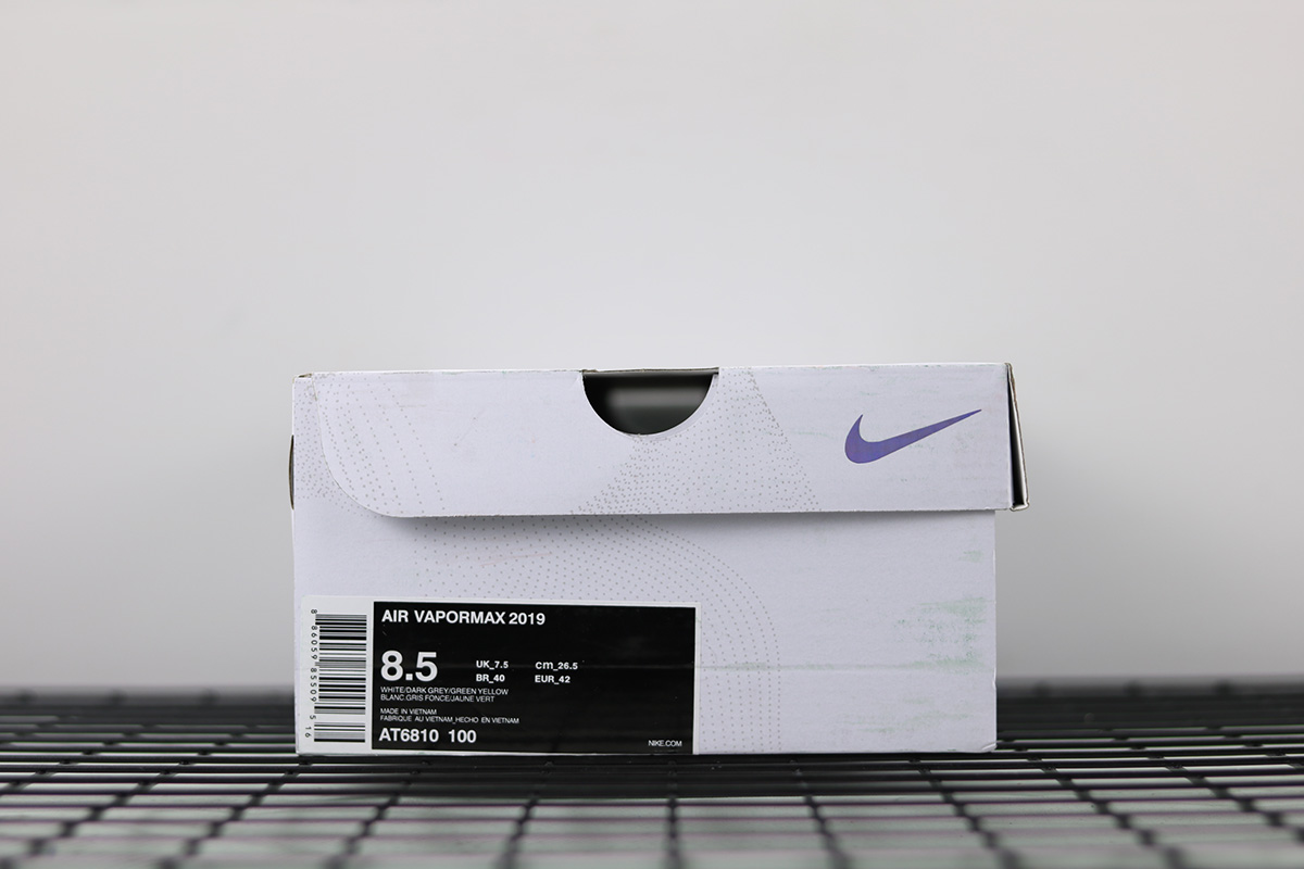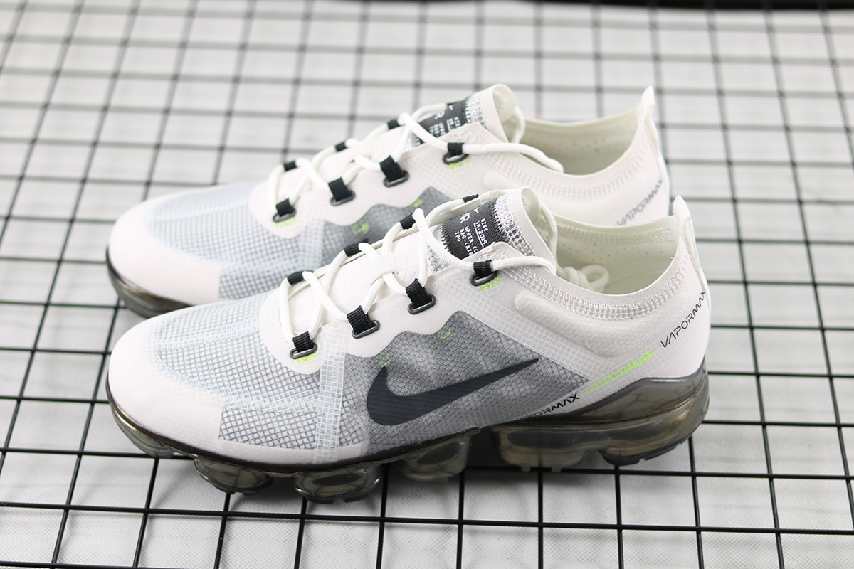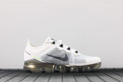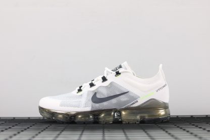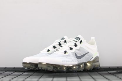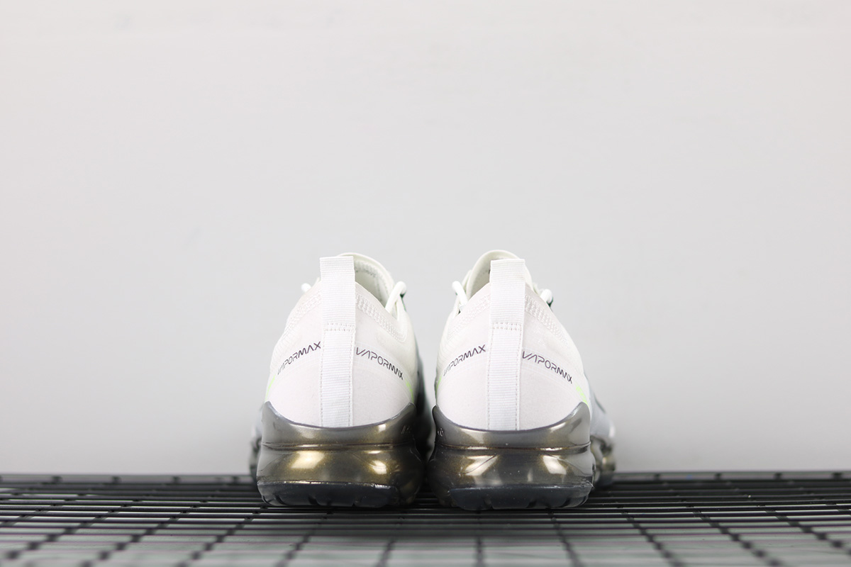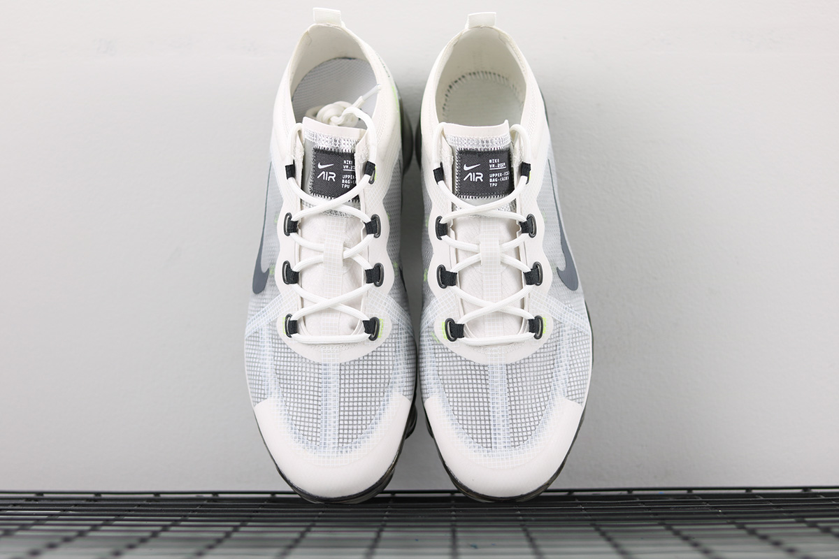 Dressed in a White, Dark Grey, Platinum Tint, and Lime Blast color scheme. This Nike Air VaporMax 2019 features a White and Grey TPE upper highlighted with Lime Green accents. An iridescent full-length VaporMax sole unit completes the design.