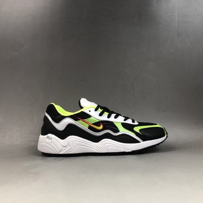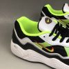 This release features a Black mesh upper with White leather overlays highlighted with Volt and Orange accents. A White midsole atop a Black rubber outsole completes the design.