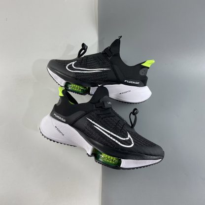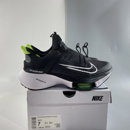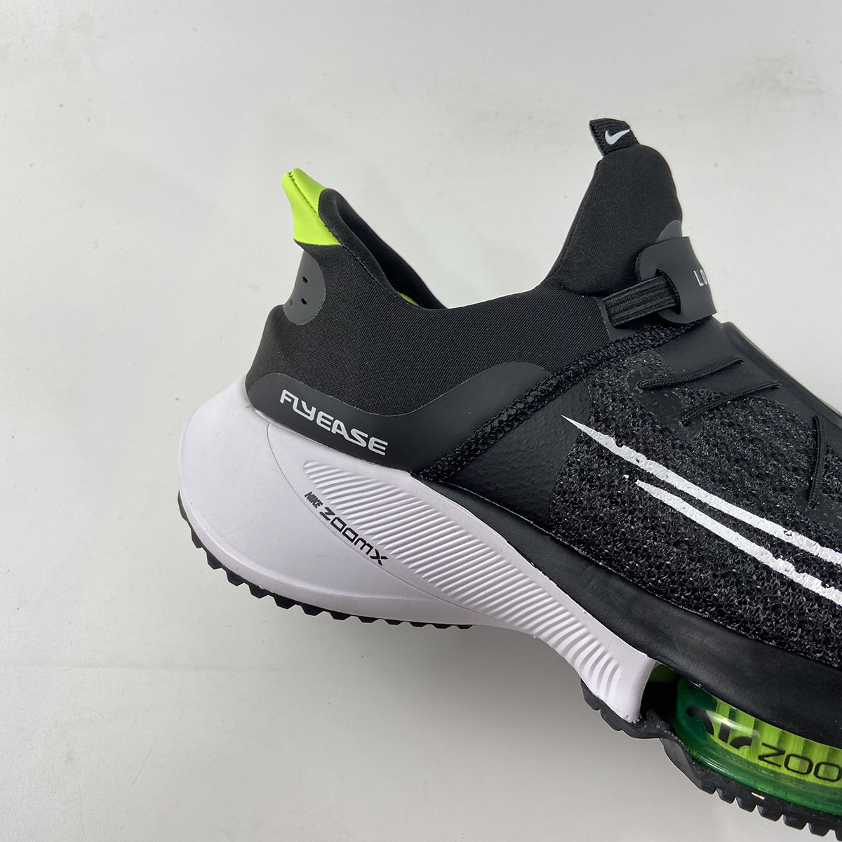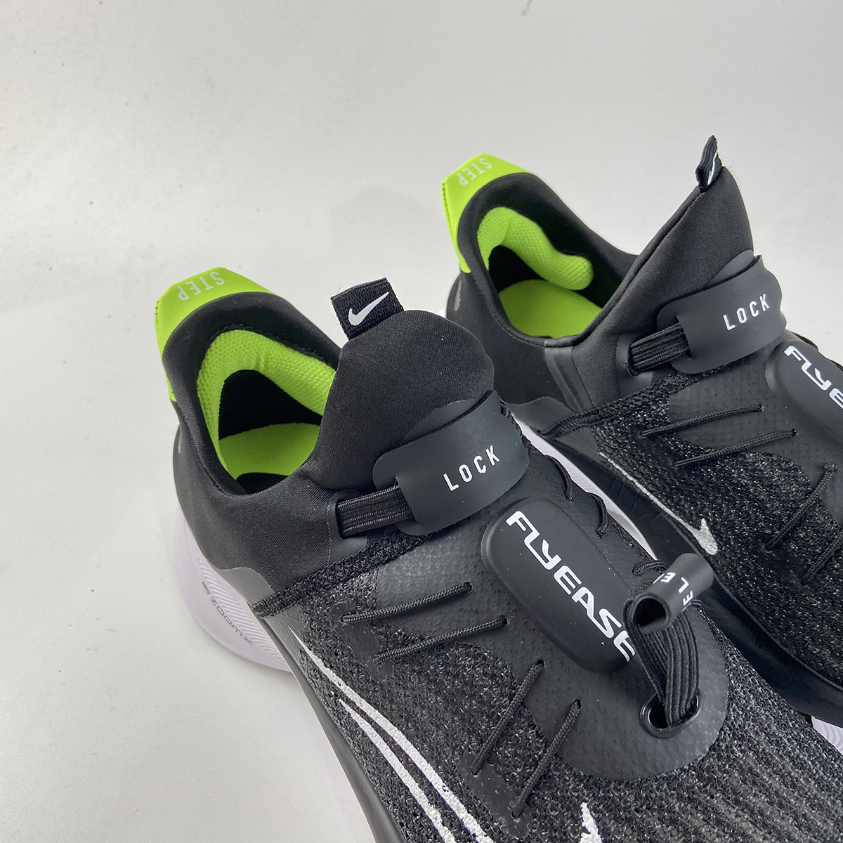 the silhouette is an easy-entry take on the Nike Zoom Tempo NEXT%. Uppers are constructed from black, translucent Flyknit materials that also appear on the aforementioned runner. A weathered, white Swoosh outline is printed atop these uppers stretching from the toe to the lateral side. The plush black heel is collapsible to allow for relatively hands-free wear. At the top of the heel is a Volt tab labeled “STEP” to hint at the step-in feature of the inclusive design. An internal lacing mechanism that is carried out by the black “LOCK” and “RELEASE” tabs at the front further adds to the ease of wear. The FlyEase variant is complete with a white ZoomX cushioned midsole, which features a Volt Zoom Air unit at the forefoot.