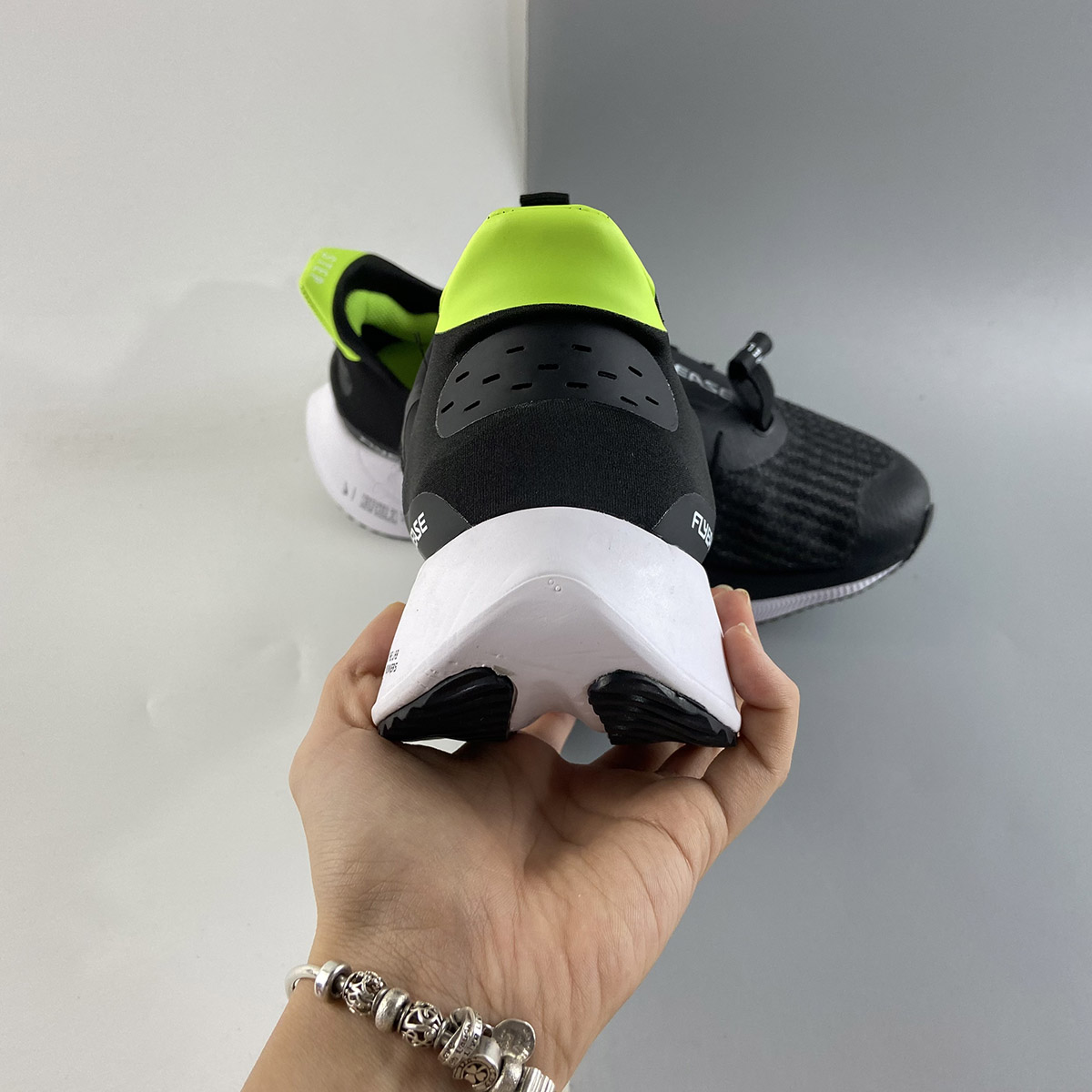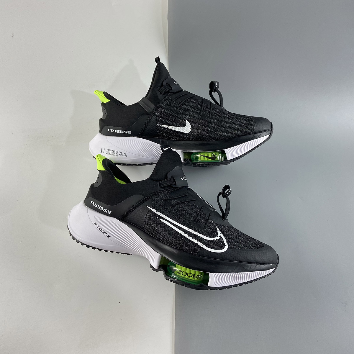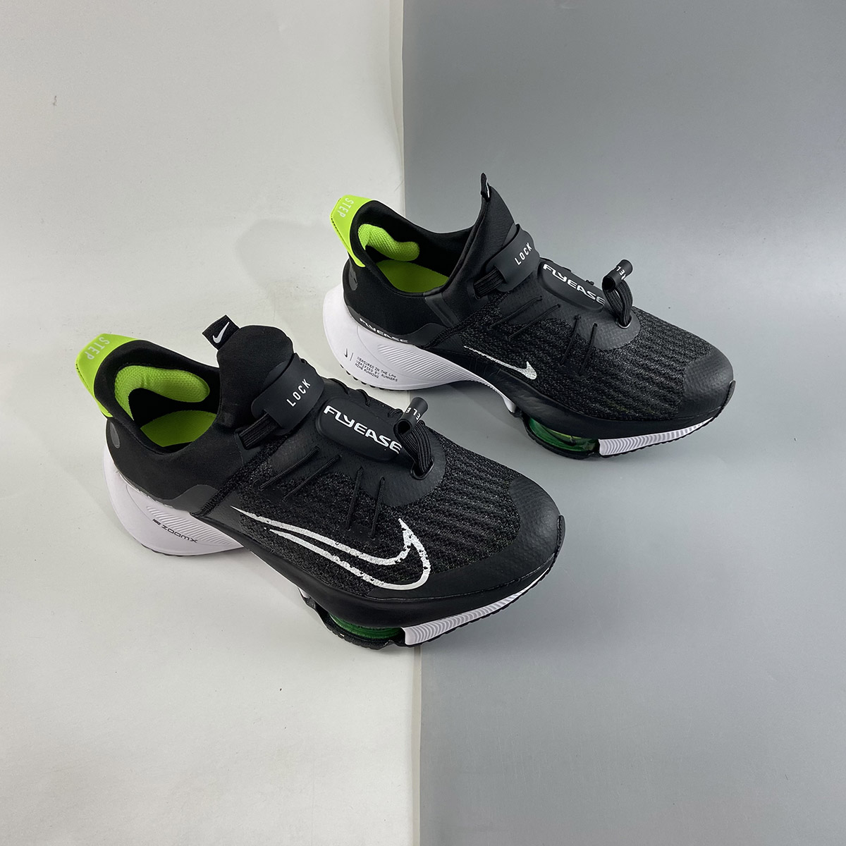 the silhouette is an easy-entry take on the Nike Zoom Tempo NEXT%. Uppers are constructed from black, translucent Flyknit materials that also appear on the aforementioned runner. A weathered, white Swoosh outline is printed atop these uppers stretching from the toe to the lateral side. The plush black heel is collapsible to allow for relatively hands-free wear. At the top of the heel is a Volt tab labeled “STEP” to hint at the step-in feature of the inclusive design. An internal lacing mechanism that is carried out by the black “LOCK” and “RELEASE” tabs at the front further adds to the ease of wear. The FlyEase variant is complete with a white ZoomX cushioned midsole, which features a Volt Zoom Air unit at the forefoot.
