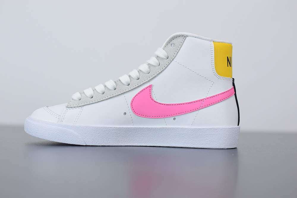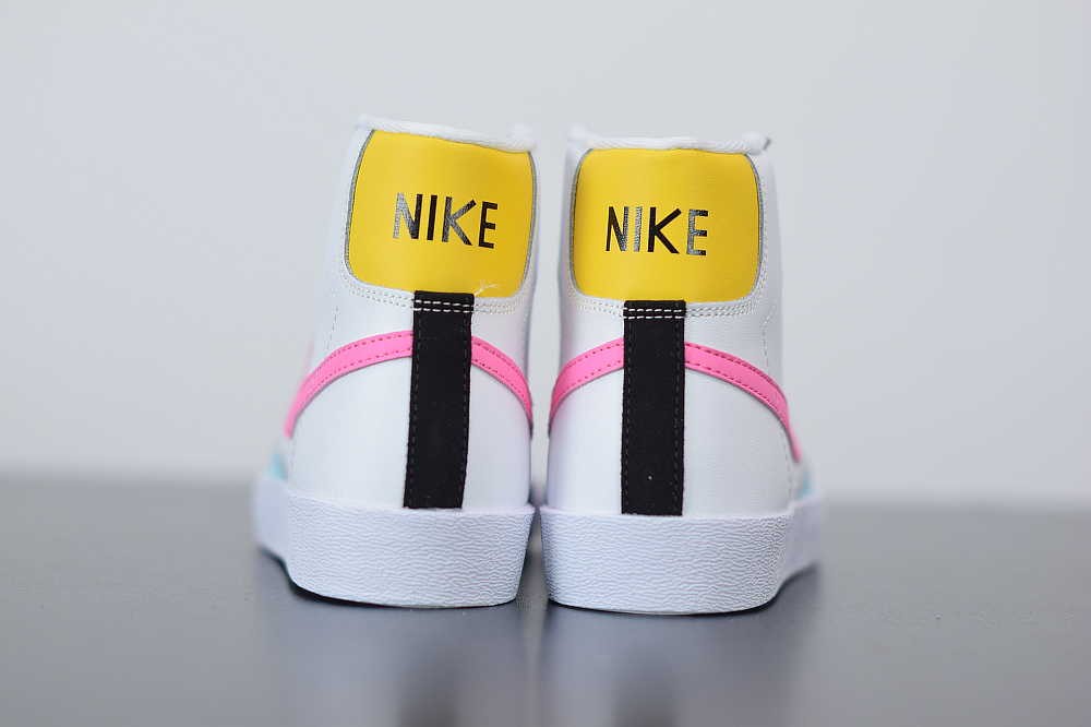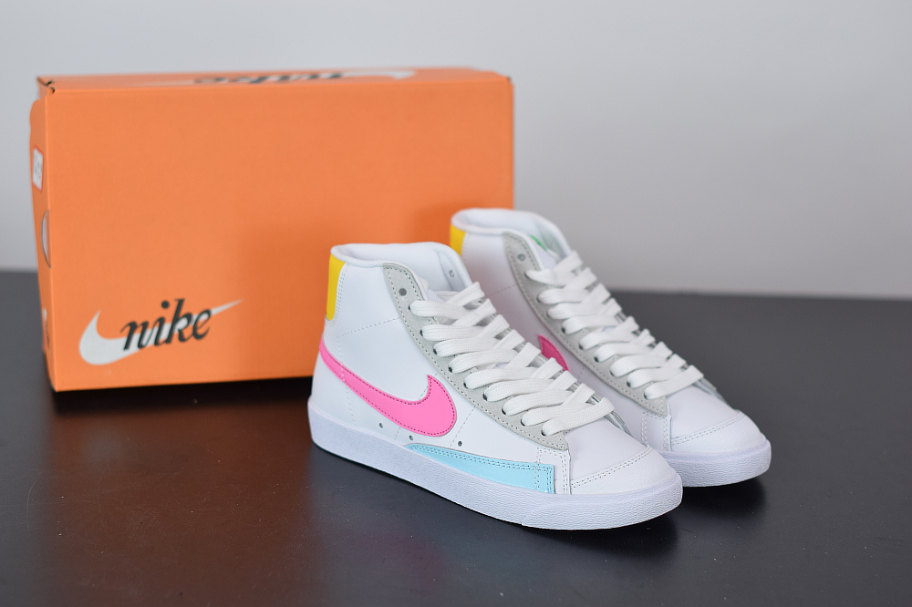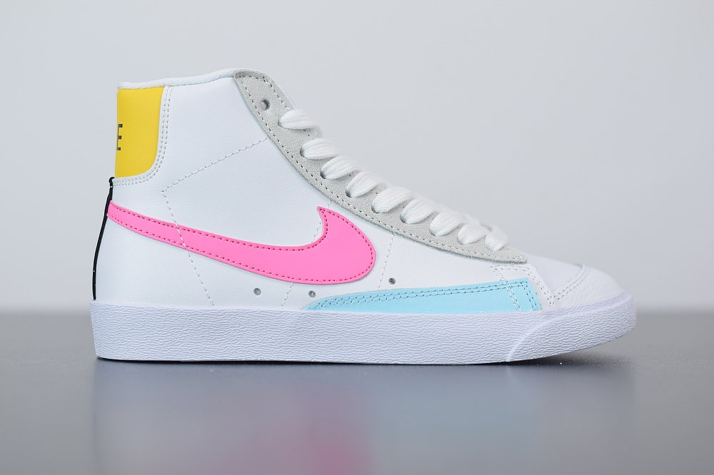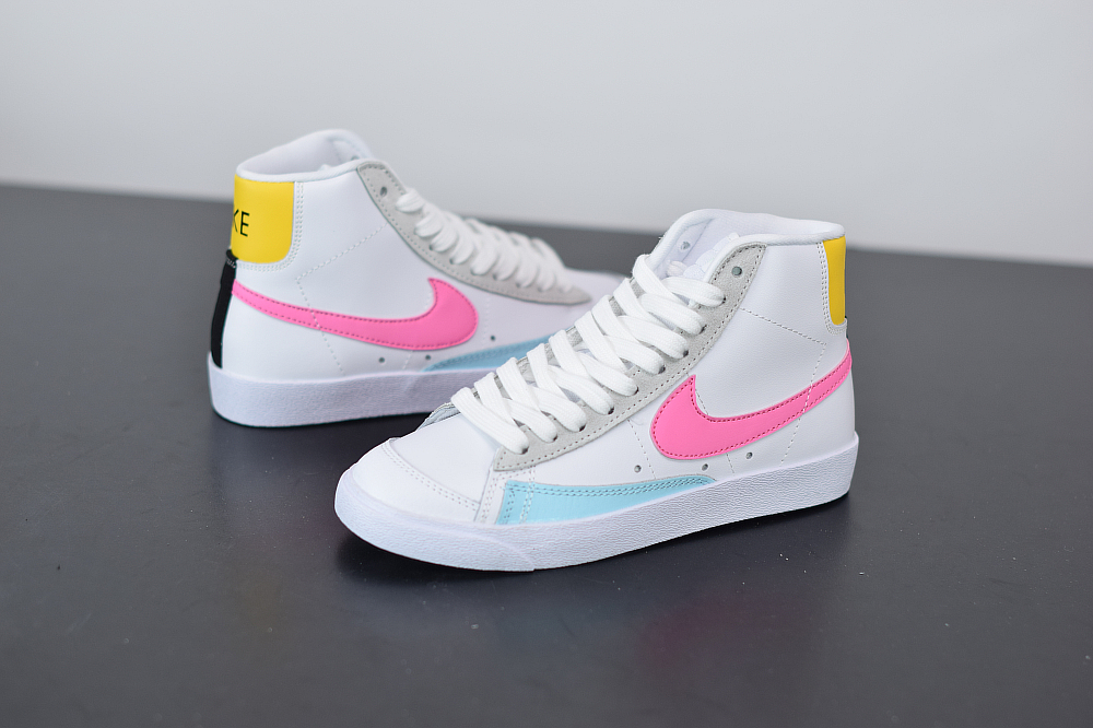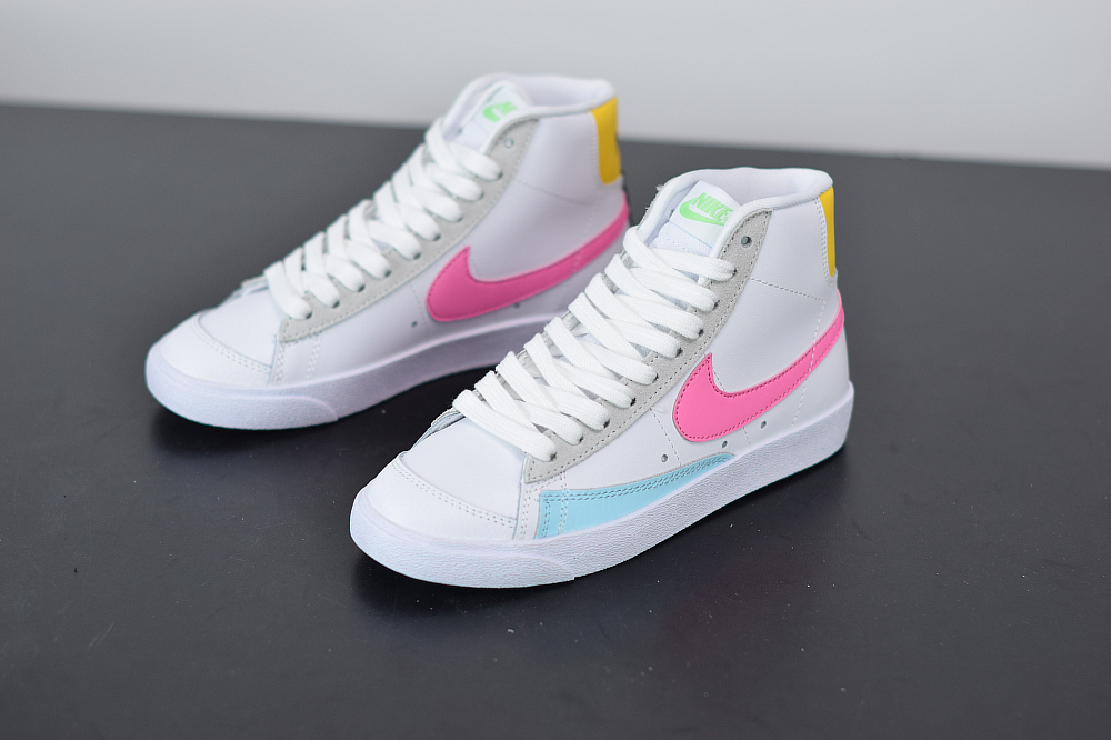 One of the latest Nike Blazer Mid releases to showcase comes highlighted with White leather across the upper while Platinum lands on the suede eyelets, Light Blue leather on the toe overlay, Pink on the Swoosh logos and Yellow lands on the heel. Following we have Neon Green tongue branding and insoles while Black accents the heel to finish the look.